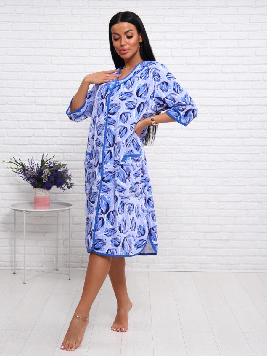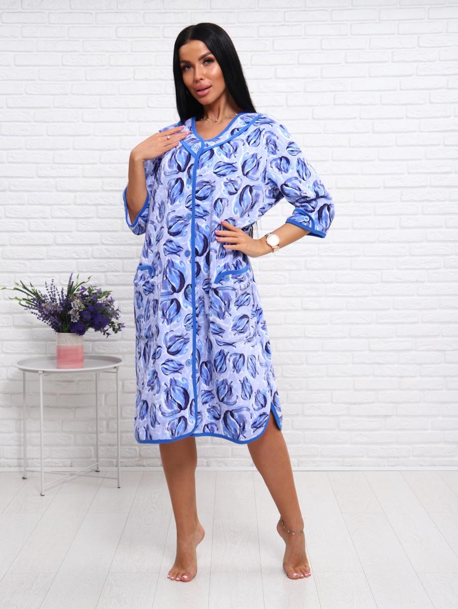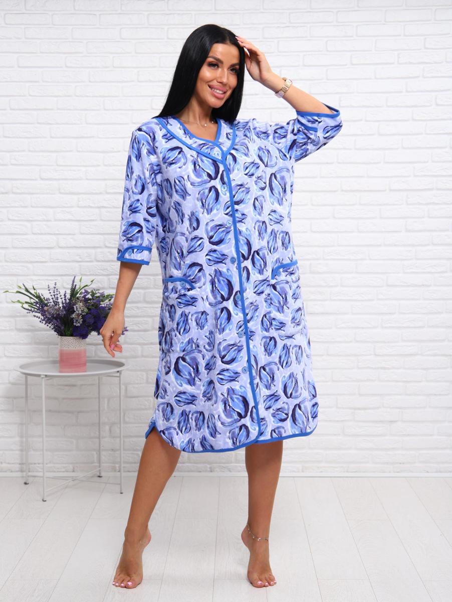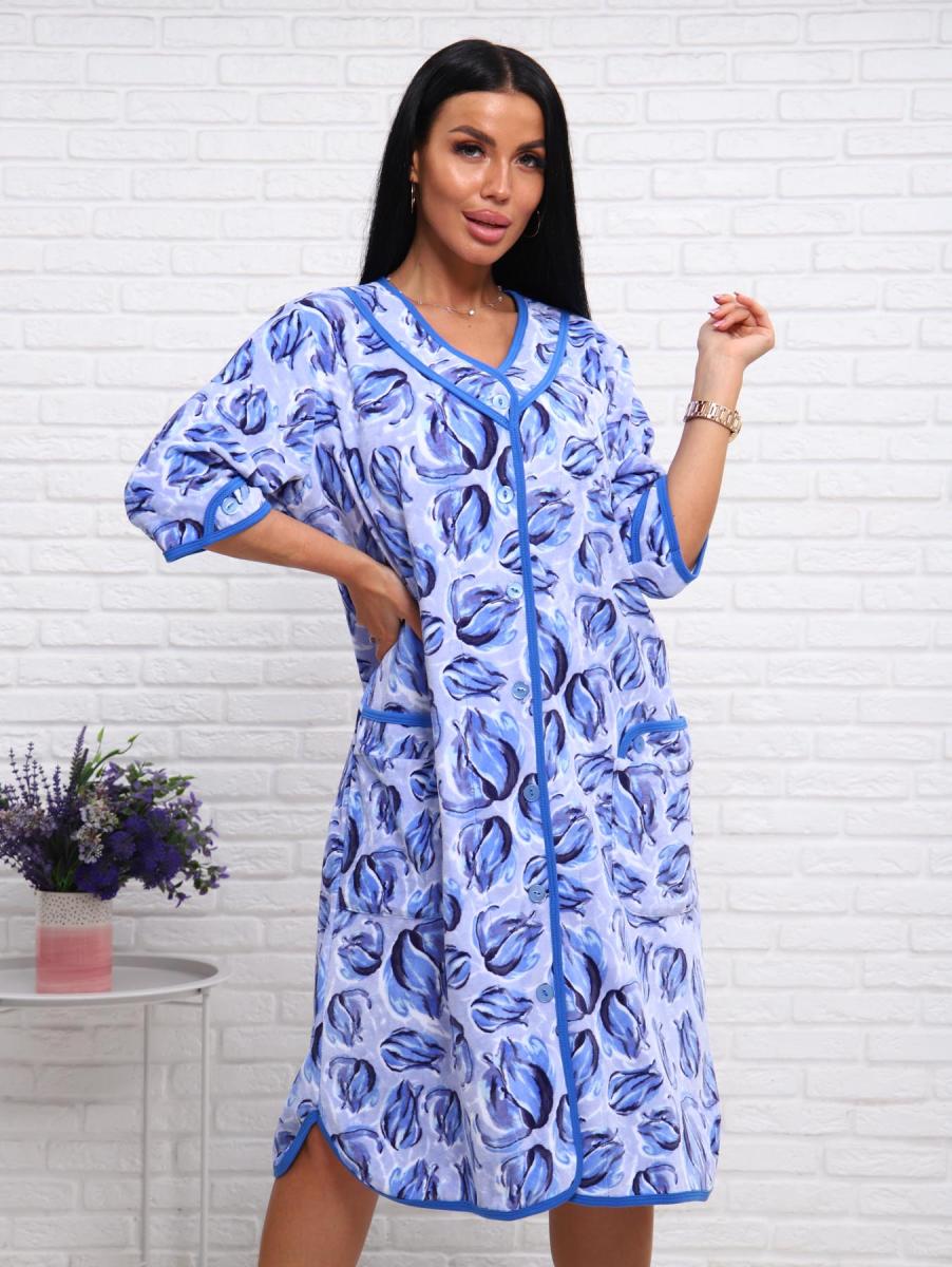 Халат на пуговицах с накладными карманами не только стильный, но и функциональный. Удобный крой и фигурный низ позволяют свободно двигаться, а декоративные обтачки на рукавах и карманах придают изделию изысканный вид. Окантовка кулирной гладью добавляет особый шарм и завершенность.