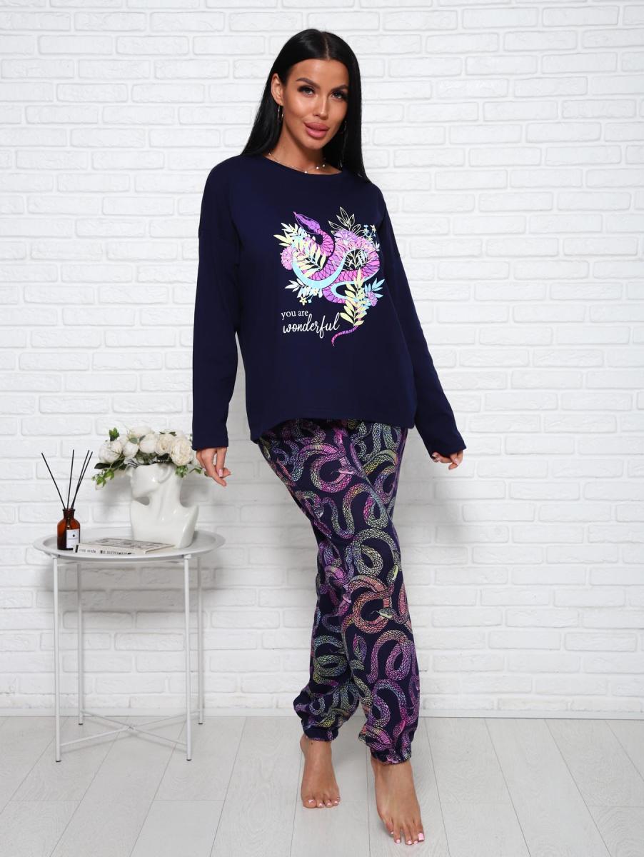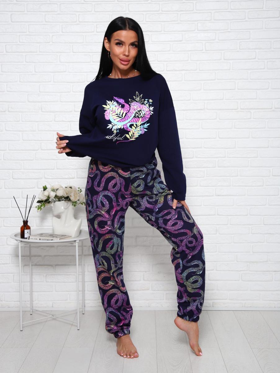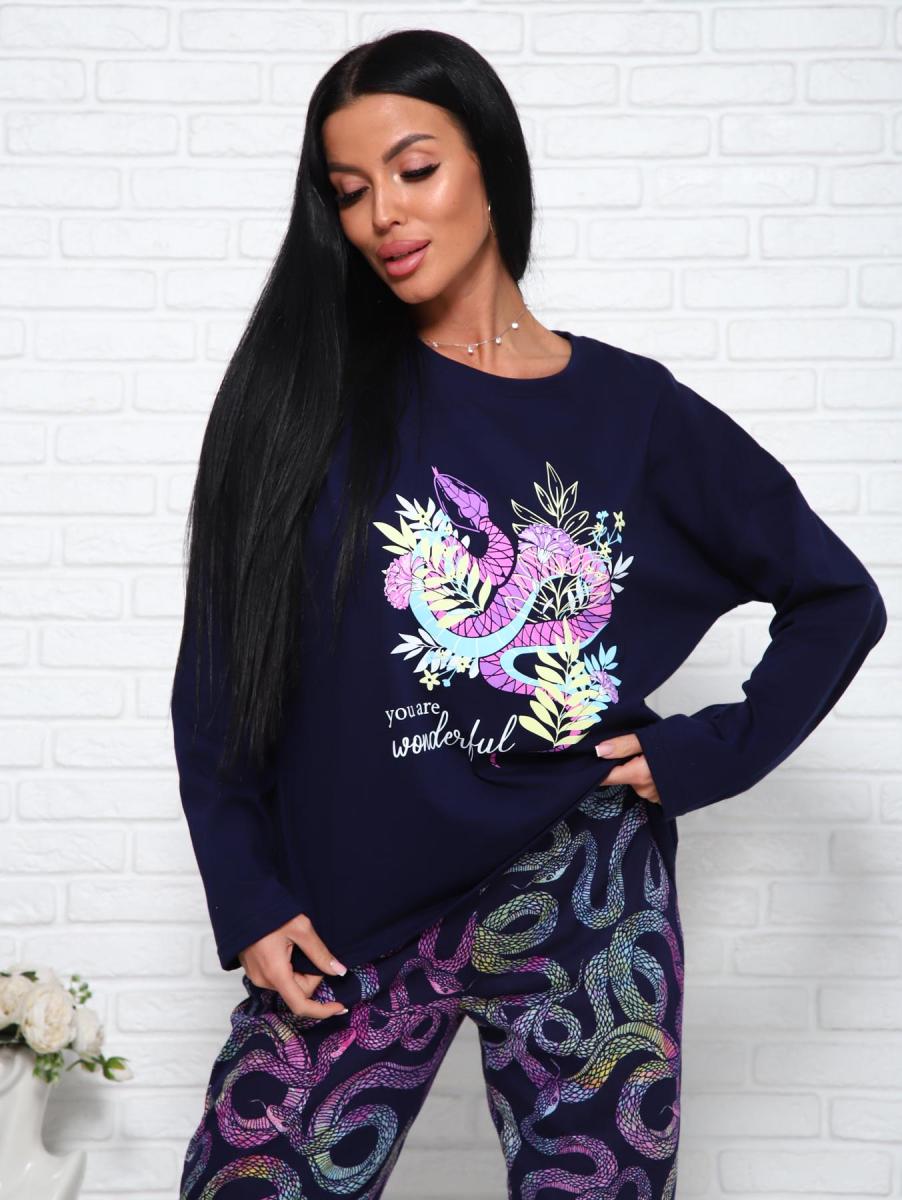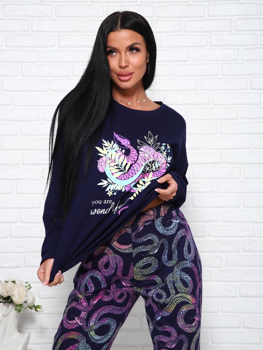 Костюм с брюками выполнен из мягкой и приятной на ощупь кулирки, состоящей на 100% из хлопка, что обеспечивает максимальный комфорт в домашней обстановке. Модель свободного кроя с спущенным рукавом дарит свободу движений и легкость. На груди расположенный принт символа года добавляет оригинальности и стиля.