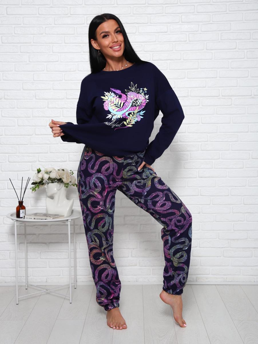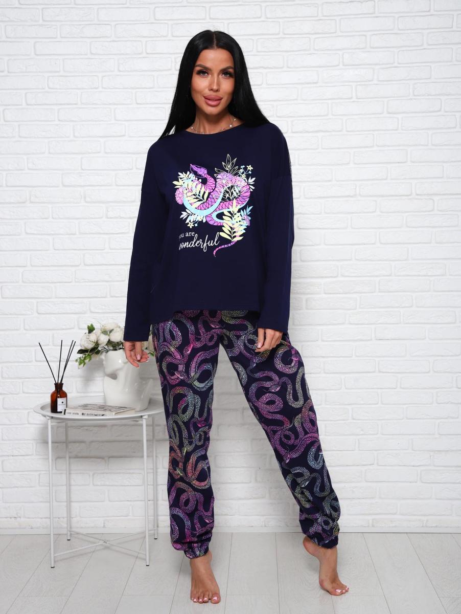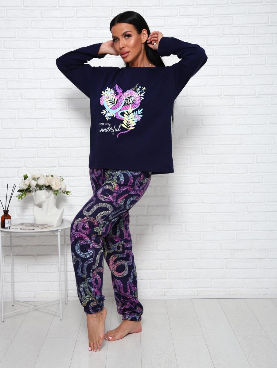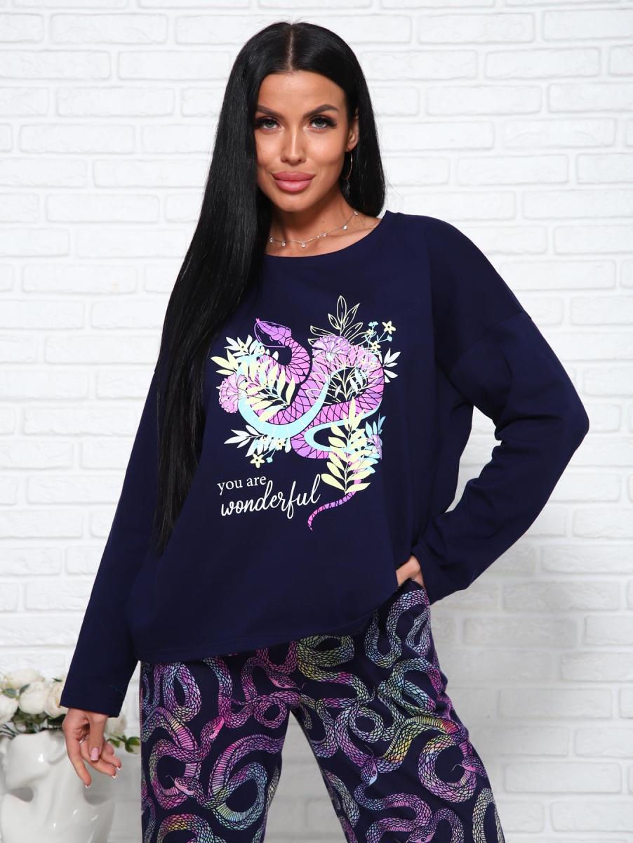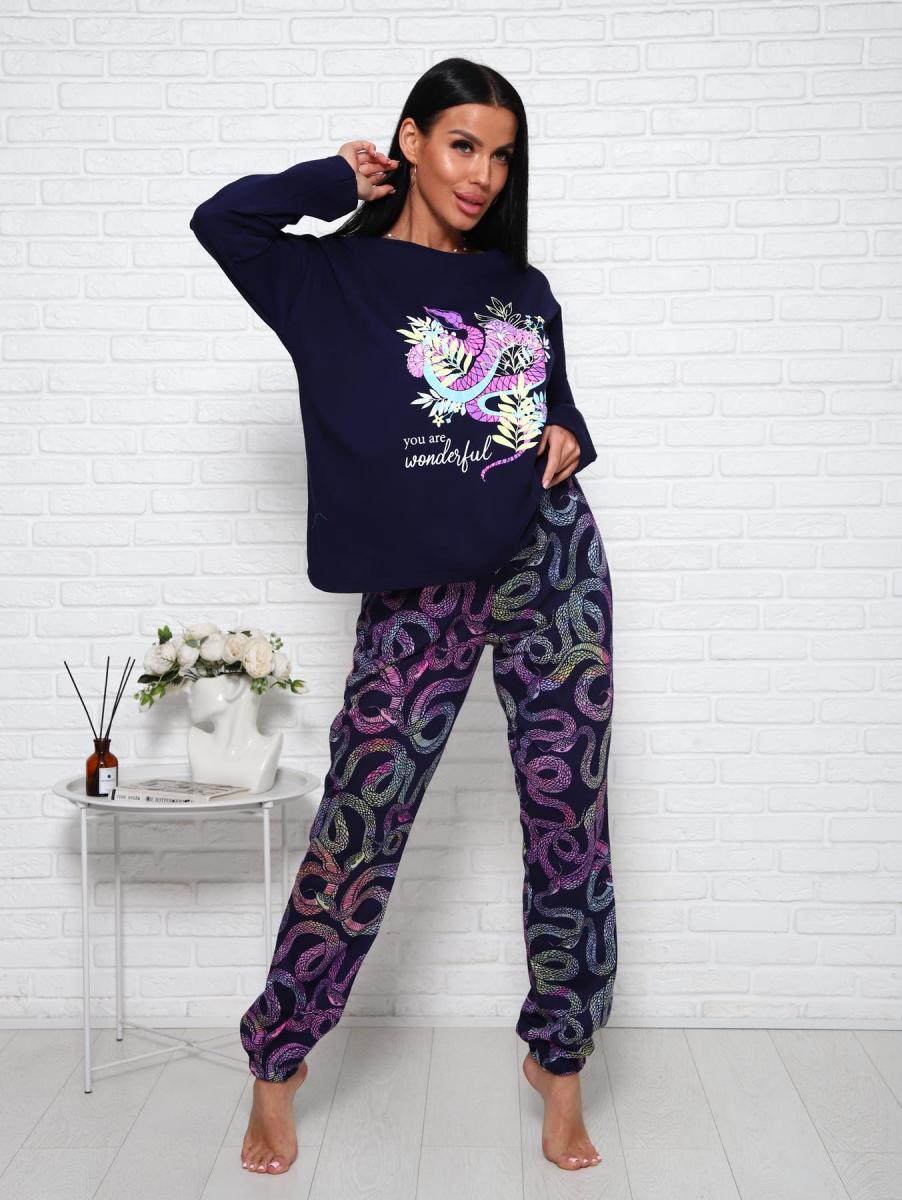 Костюм с брюками выполнен из мягкой и приятной на ощупь кулирки, состоящей на 100% из хлопка, что обеспечивает максимальный комфорт в домашней обстановке. Модель свободного кроя с спущенным рукавом дарит свободу движений и легкость. На груди расположенный принт символа года добавляет оригинальности и стиля.