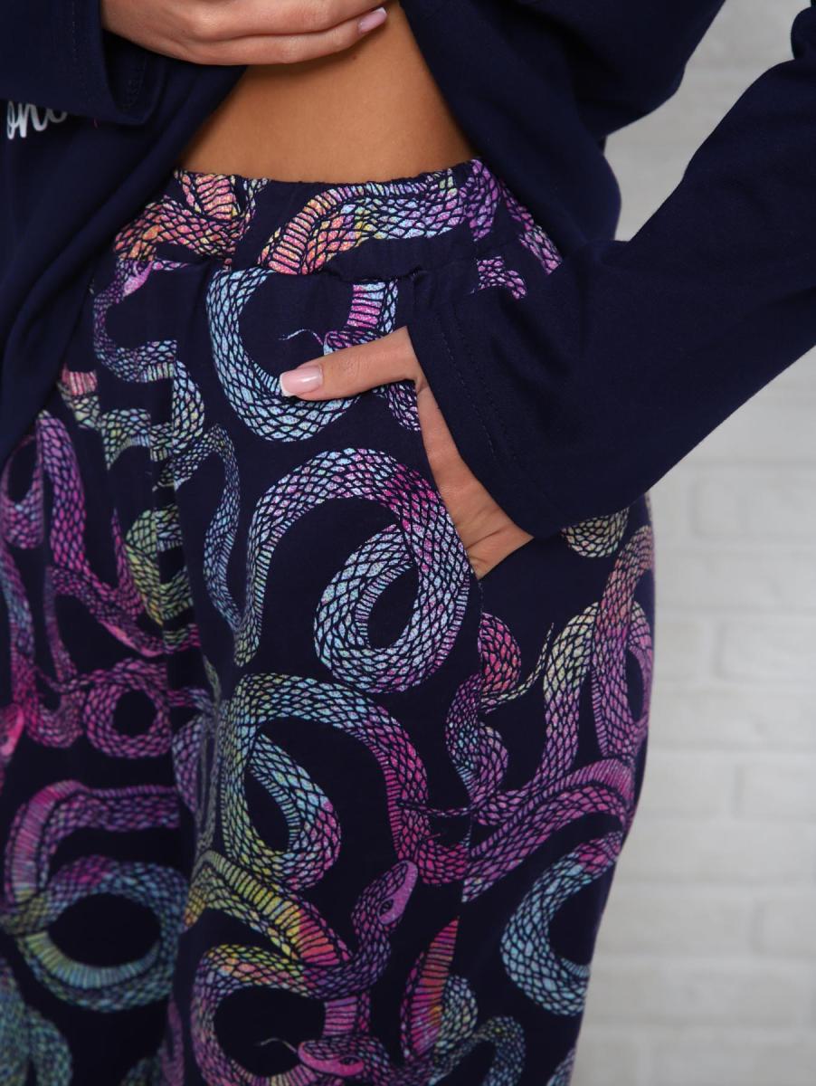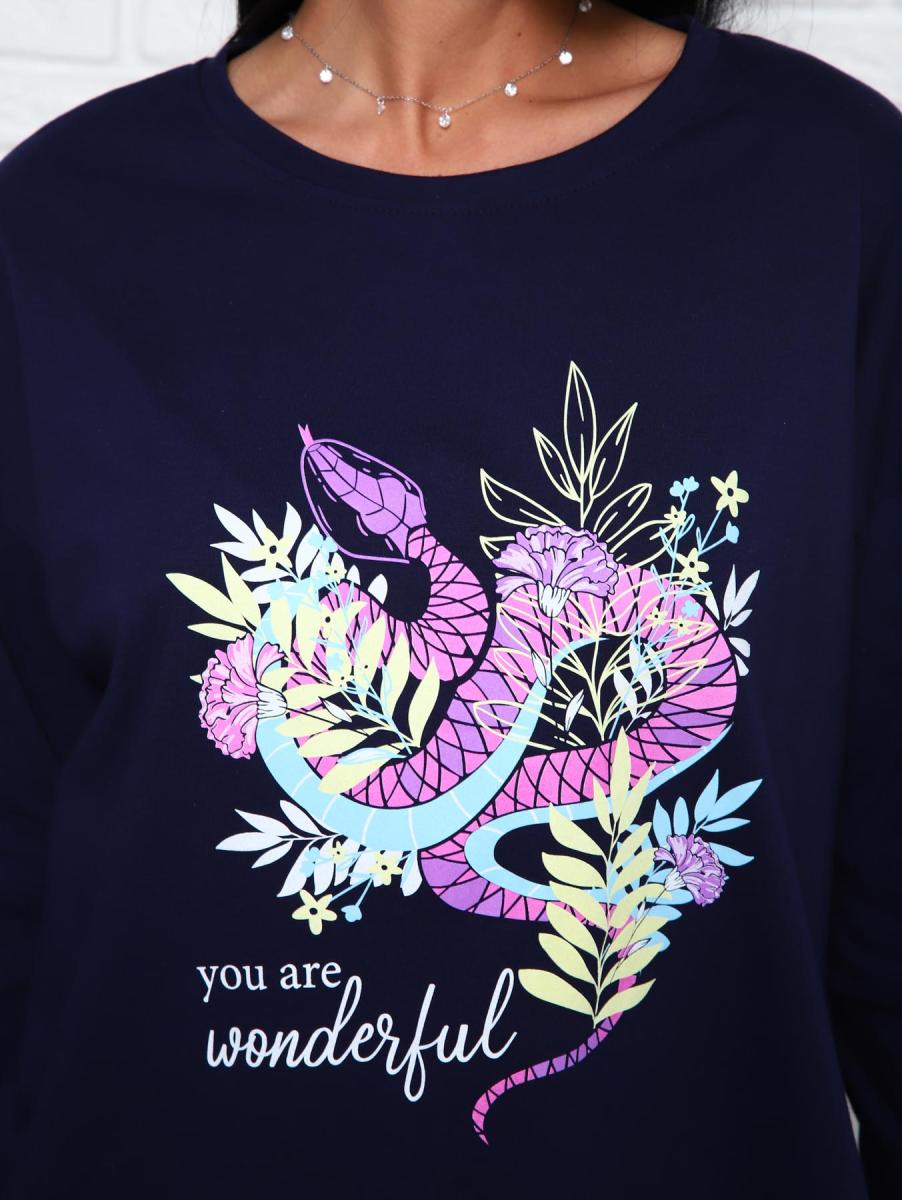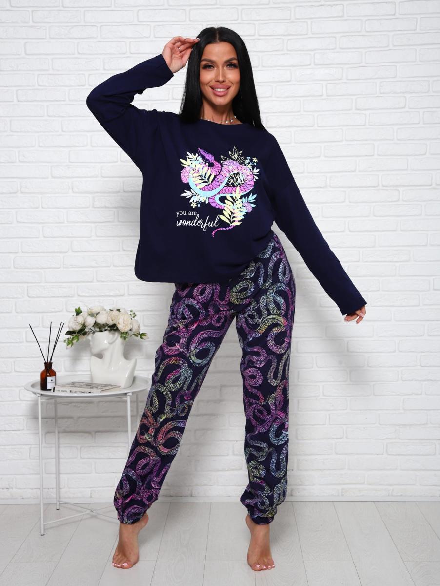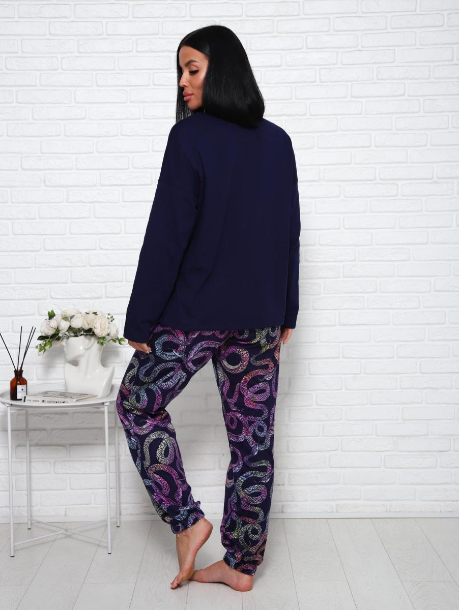 Костюм с брюками выполнен из мягкой и приятной на ощупь кулирки, состоящей на 100% из хлопка, что обеспечивает максимальный комфорт в домашней обстановке. Модель свободного кроя с спущенным рукавом дарит свободу движений и легкость. На груди расположенный принт символа года добавляет оригинальности и стиля.