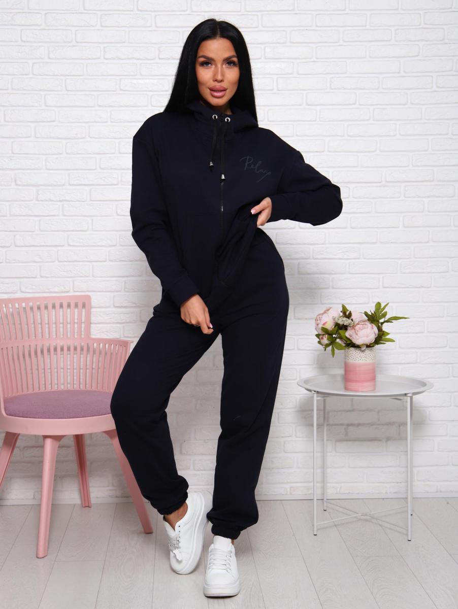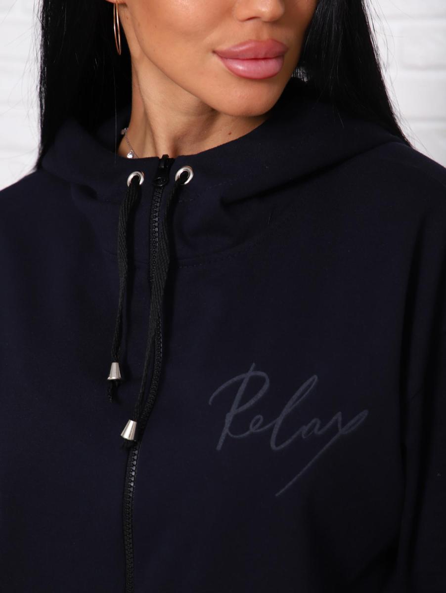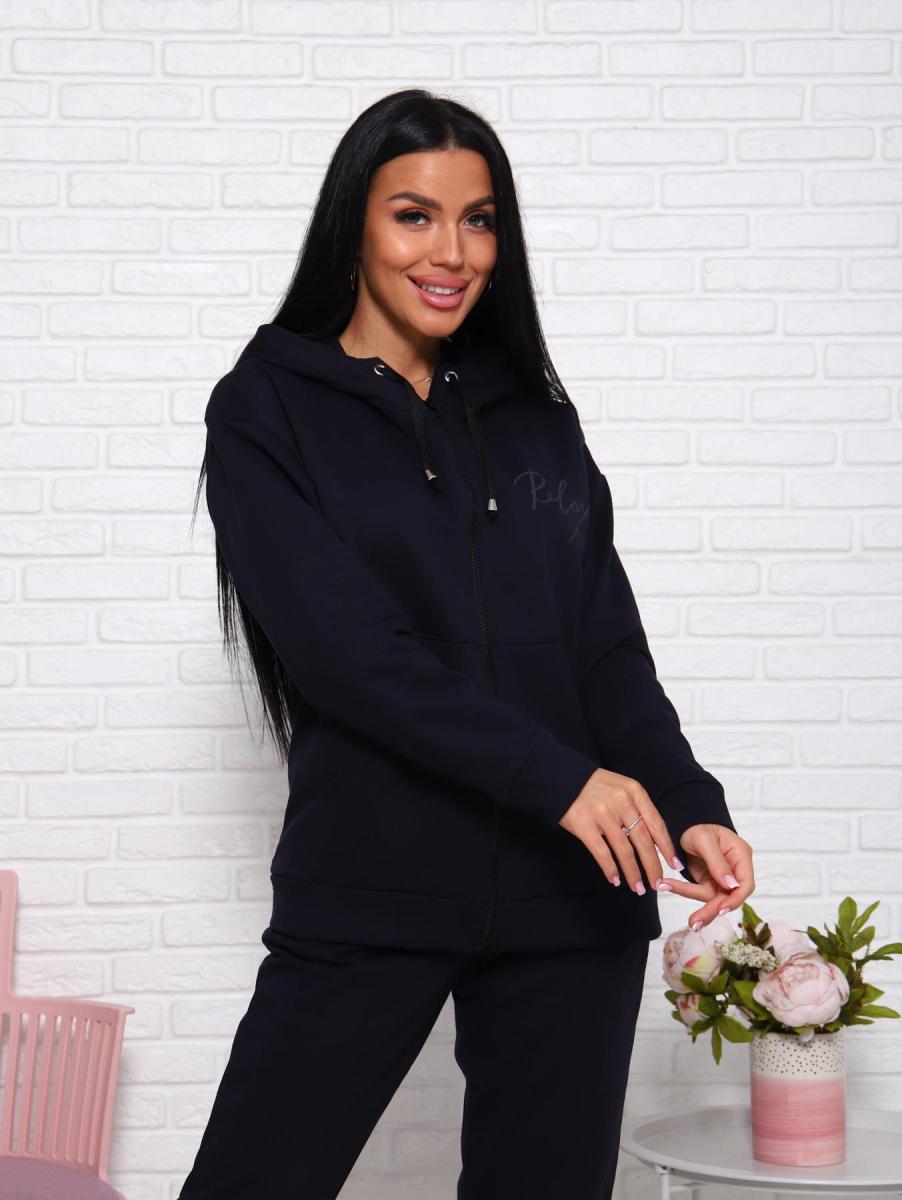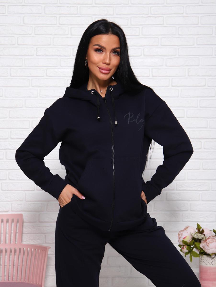 Этот стильный женский домашний костюм из темно-синего футера с начесом станет вашим идеальным спутником для уютных вечеров дома или неспешных прогулок. Толстовка на молнии с капюшоном на шнурке и немного спущенными рукавами обеспечивает комфорт и свободу движений. Она дополнена карманами и изящным буквенным принтом на полочке, что придаёт образу особый шарм.