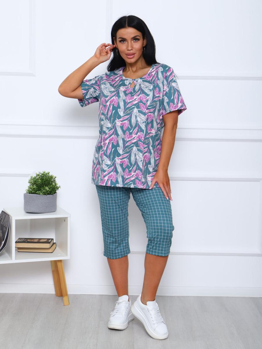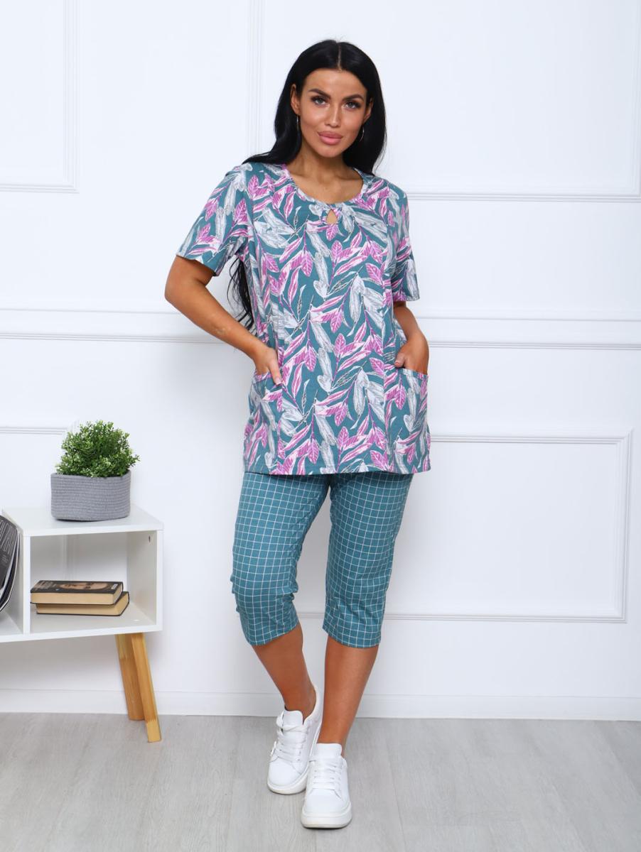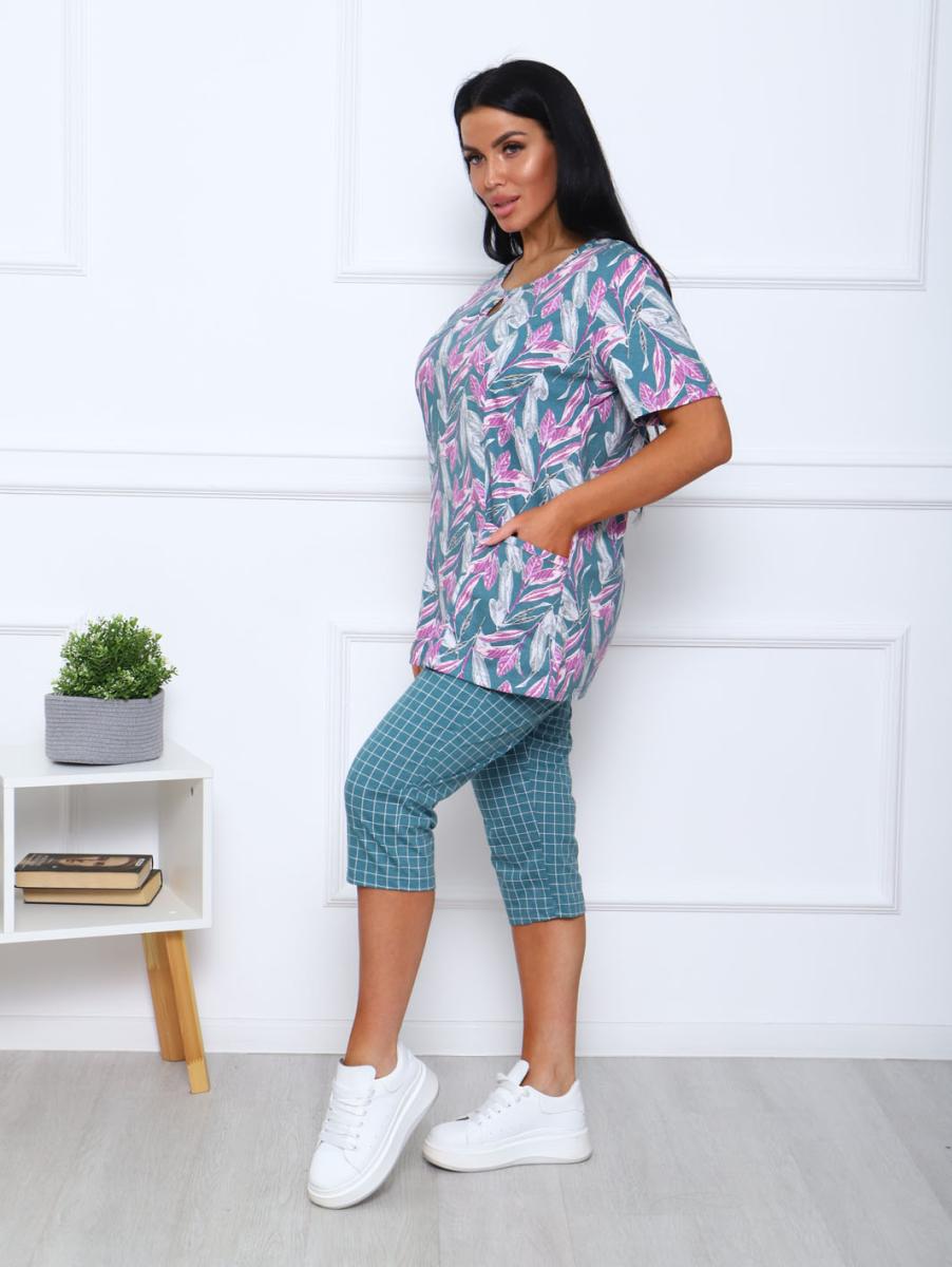 Костюм с бриджами из кулирки реактив - ткани компаньоны. Футболка с карманами в рельефах. На горловине декоративный вырез "Капелька". Рукав втачной. Бриджи высокой посадки на резинке.