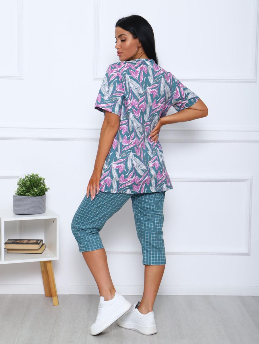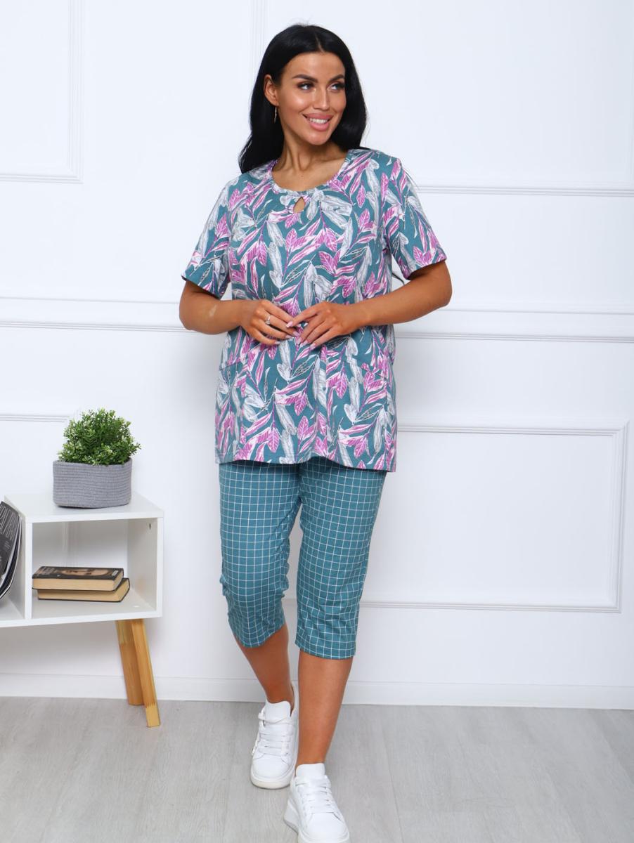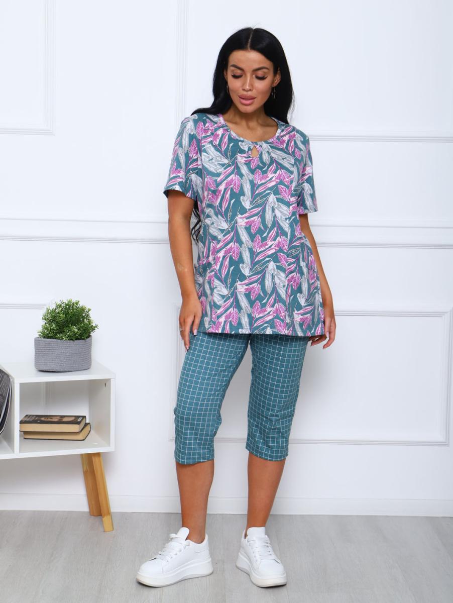Костюм с бриджами из кулирки реактив - ткани компаньоны. Футболка с карманами в рельефах. На горловине декоративный вырез "Капелька". Рукав втачной. Бриджи высокой посадки на резинке.