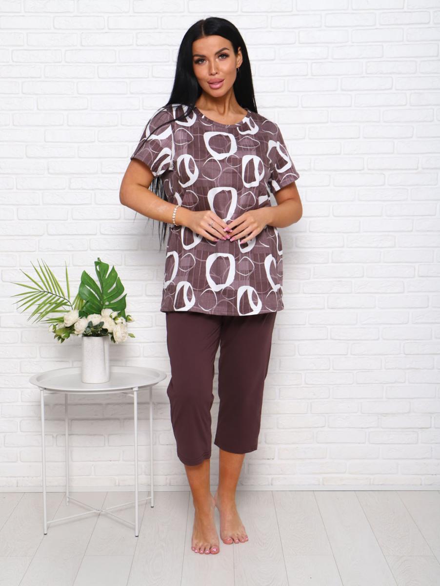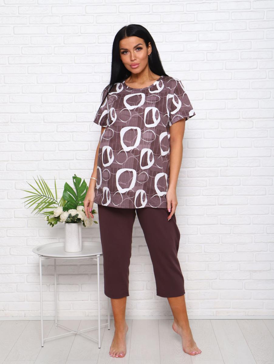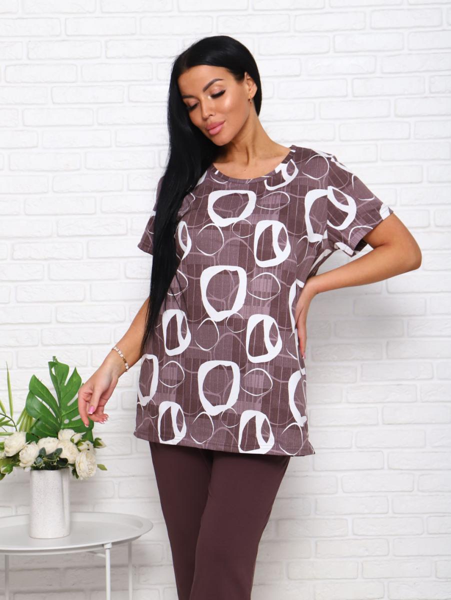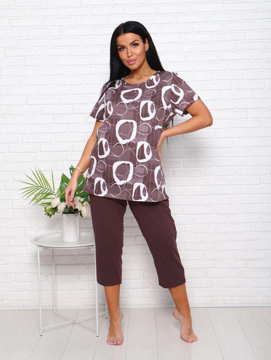 Футболка свободного кроя обеспечивает свободу движений, а бриджи с высокой посадкой на резинке подчеркивают фигуру и дарят дополнительный комфорт. Современный дизайн в коричневых тонах с эффектным набивным рисунком придаст вашему образу уютный и стильный вид.