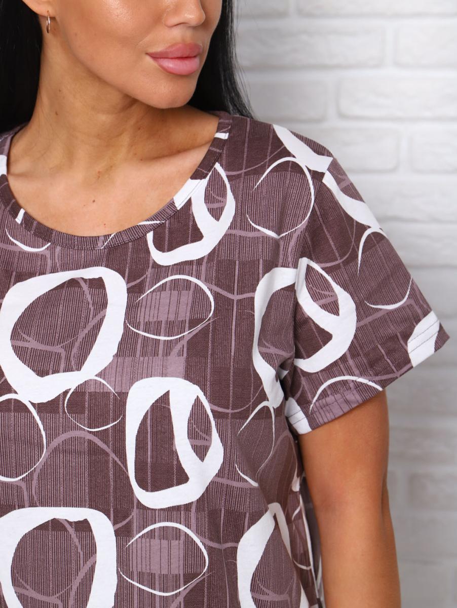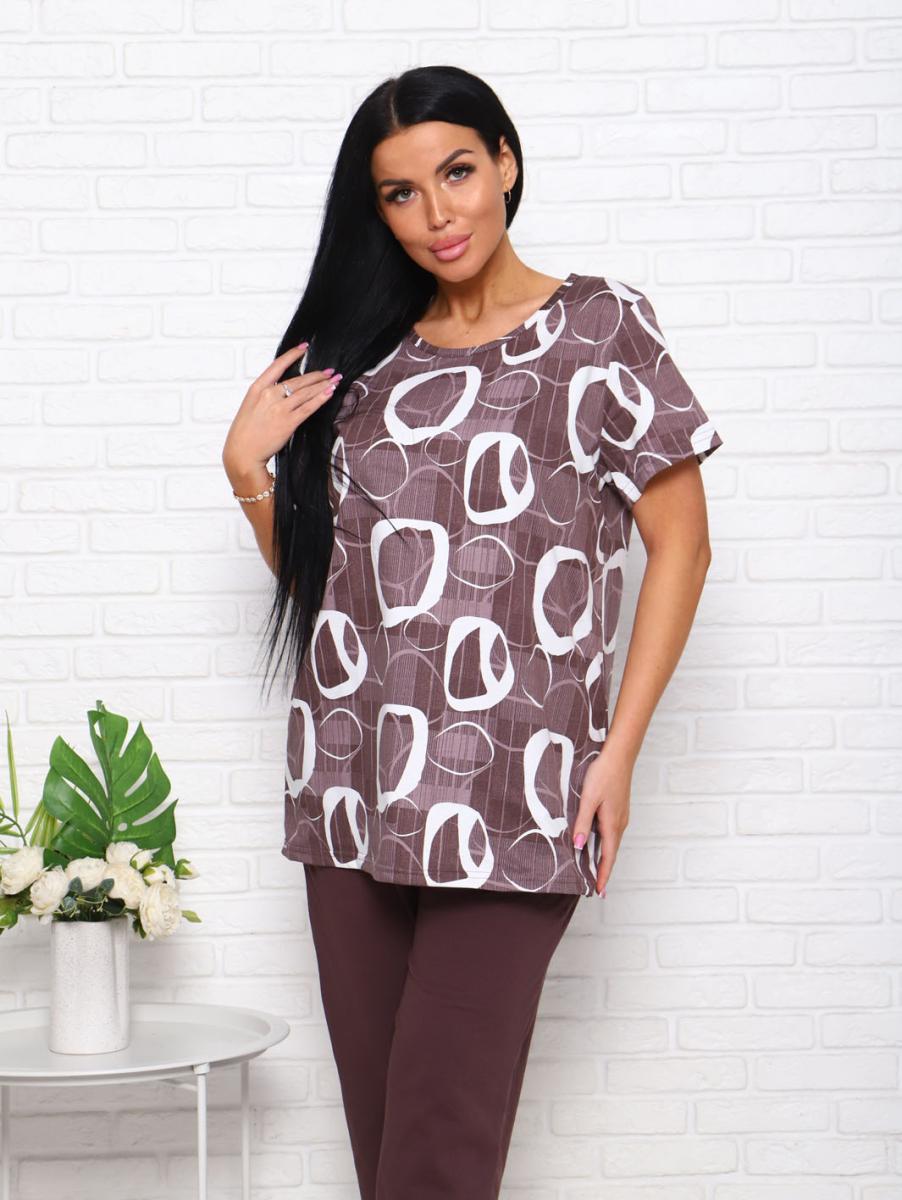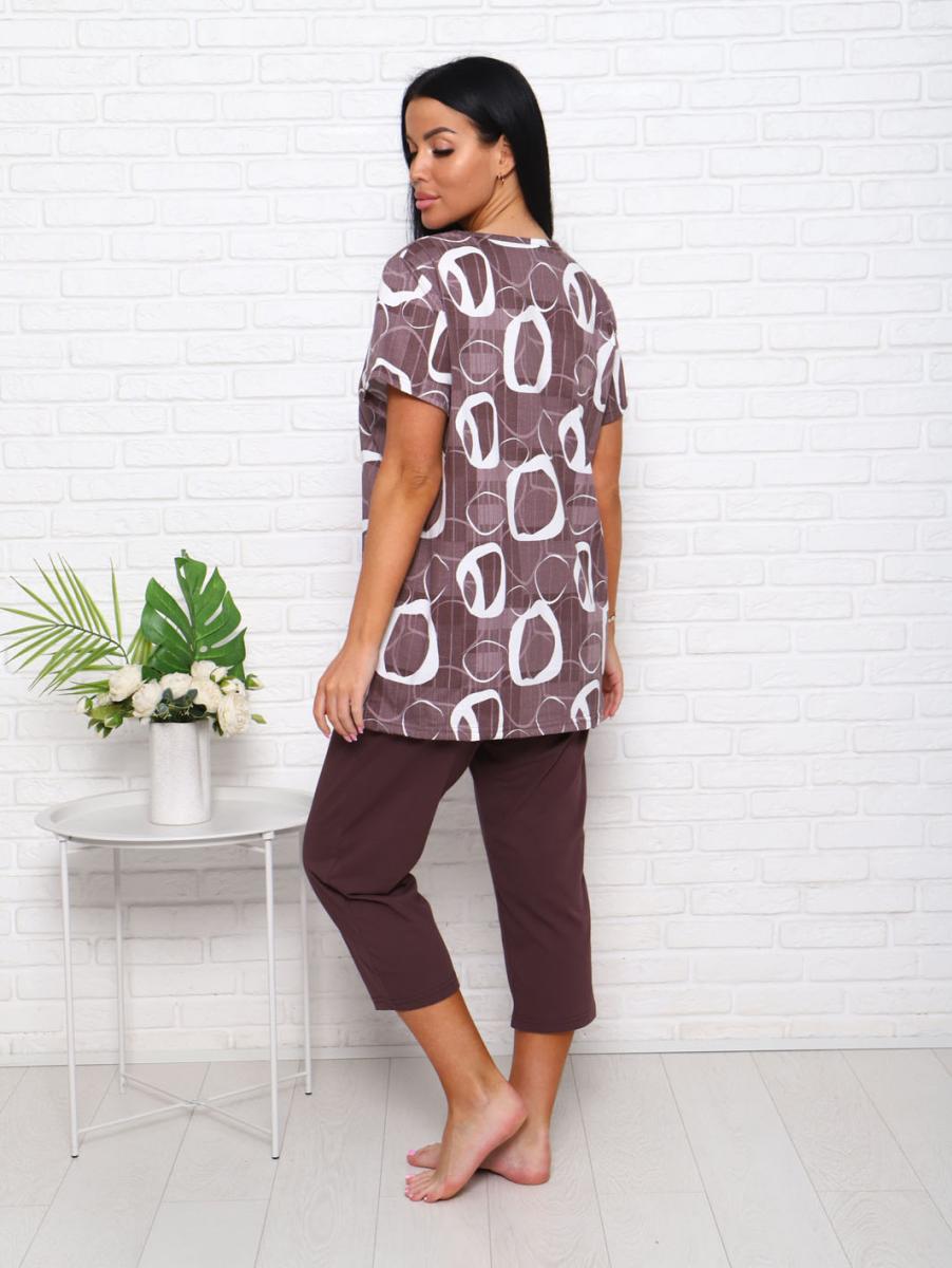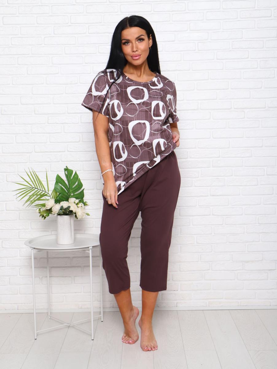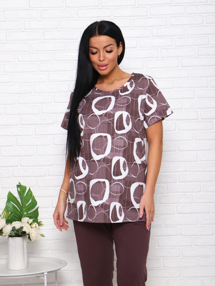 Футболка свободного кроя обеспечивает свободу движений, а бриджи с высокой посадкой на резинке подчеркивают фигуру и дарят дополнительный комфорт. Современный дизайн в коричневых тонах с эффектным набивным рисунком придаст вашему образу уютный и стильный вид.