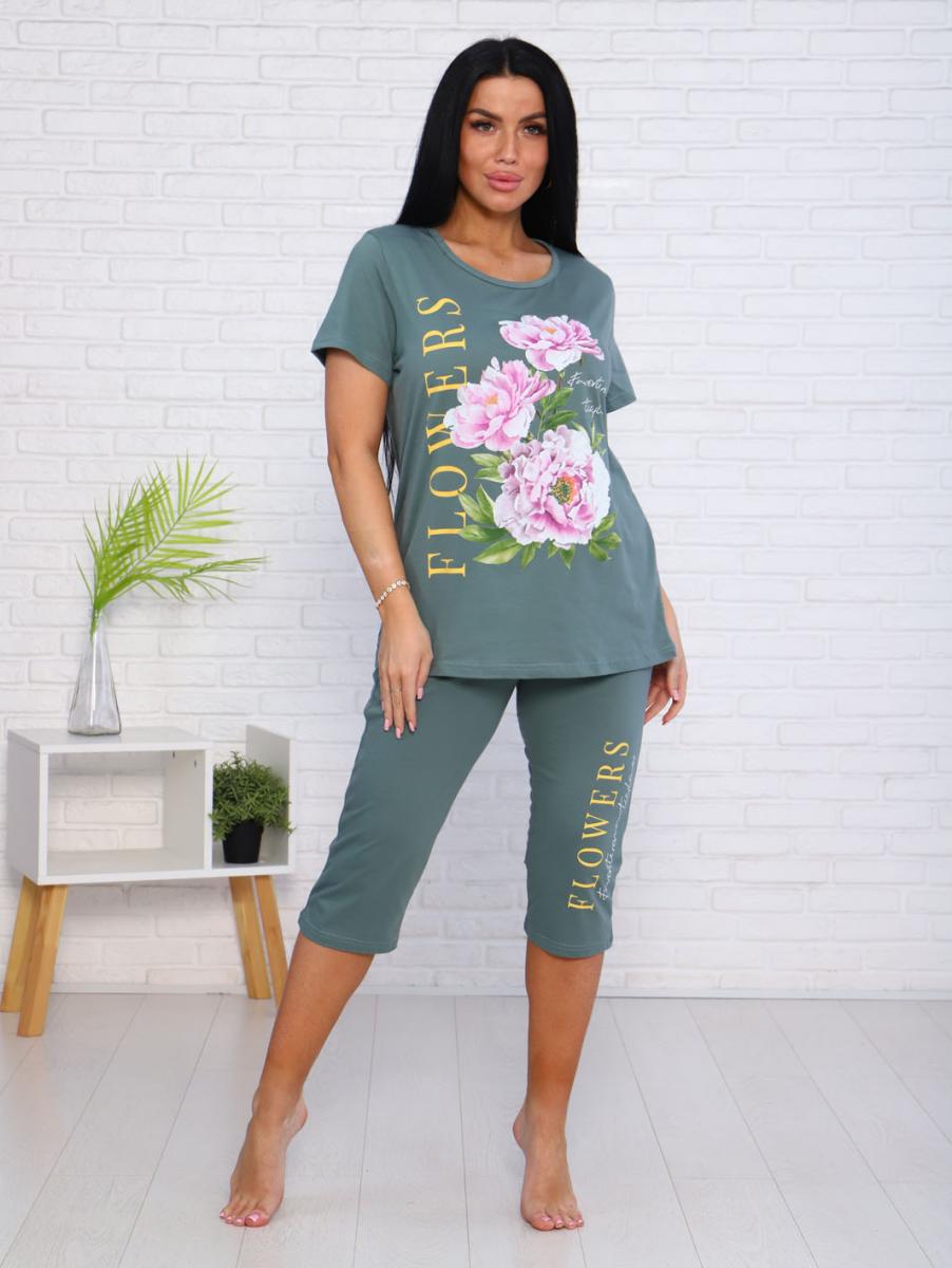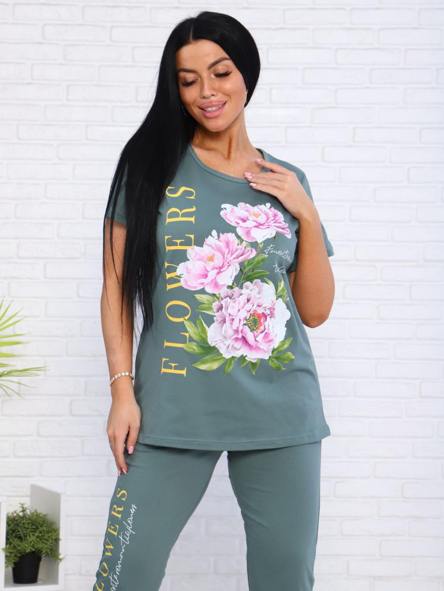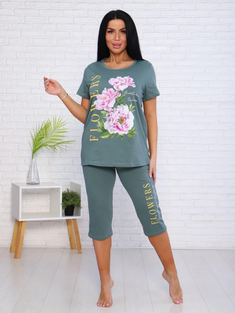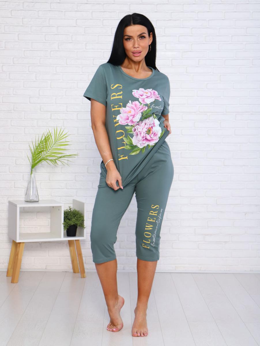 Футболка свободного прямого кроя с втачным рукавом отлично сидит на фигуре, а яркий принт с цветами добавляет изюминку в ваш домашний образ. Бриджи высокой посадки на резинке удобно облегают талию, позволяя вам свободно двигаться.