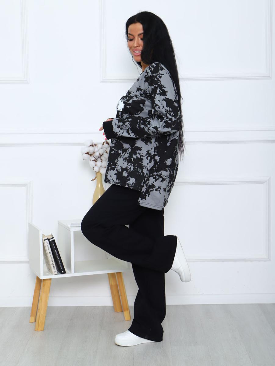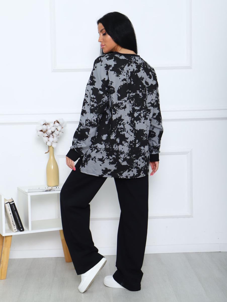 Костюм с брюками в элегантном черном цвете — идеальный выбор для уютных вечеров дома или прогулок по городу. Изготовленный из высококачественного футера с лайкрой, он обеспечивает максимальный комфорт и свободу движений.