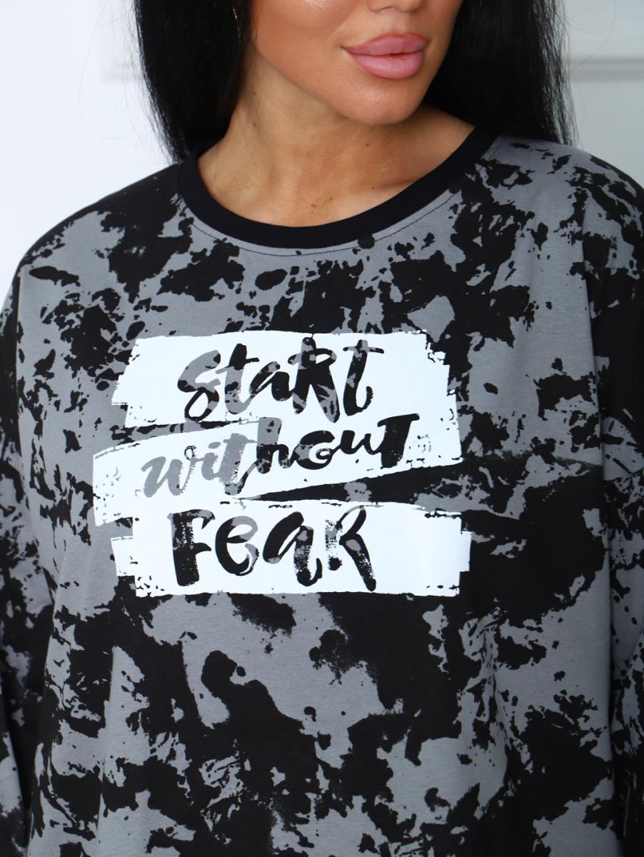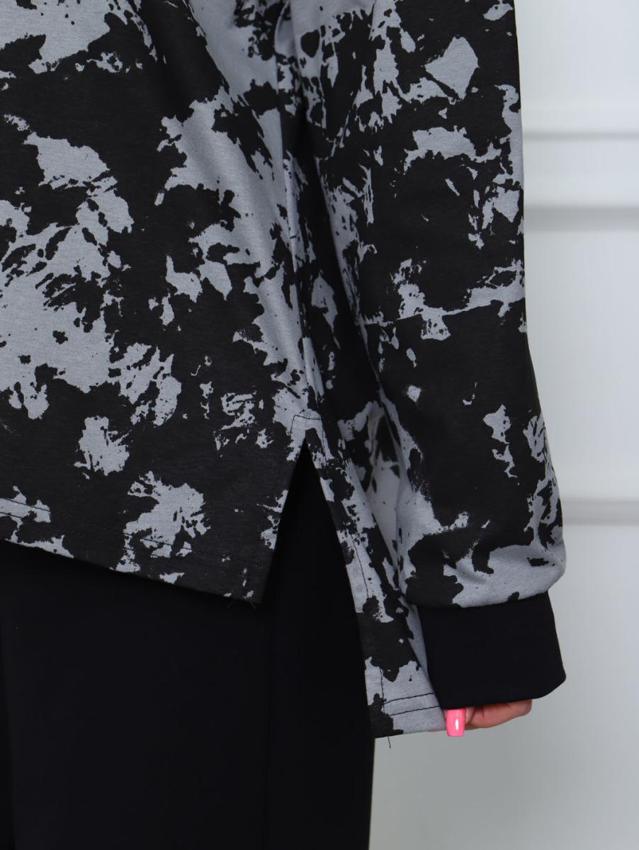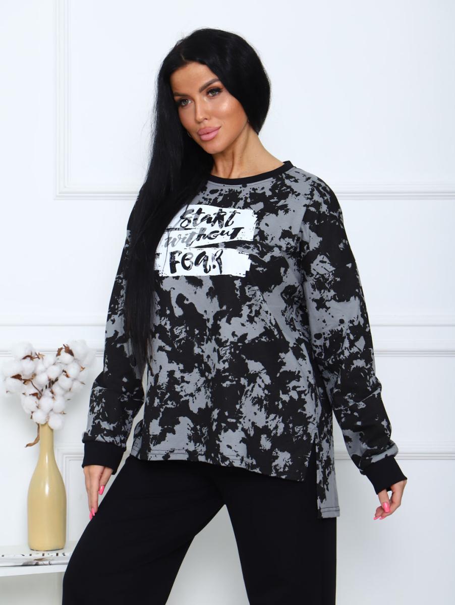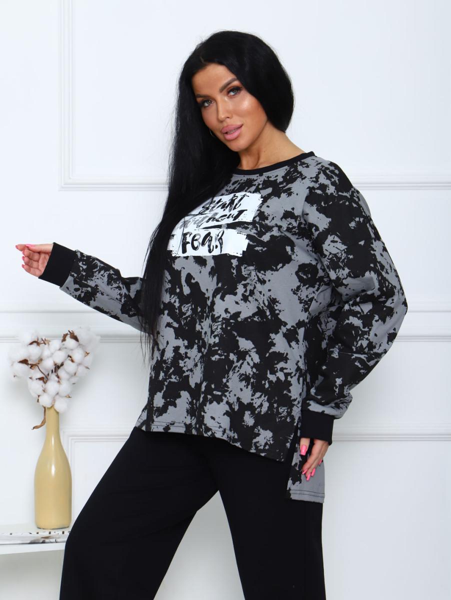 Толстовка с длинным рукавом и манжетами имеет удлиненный низ спинки и боковые разрезы, что добавляет стильный акцент в образ. Принт на полочке подчеркнет вашу индивидуальность. Брюки прямого кроя с практичными карманами на поясе идеально дополняют комплект.