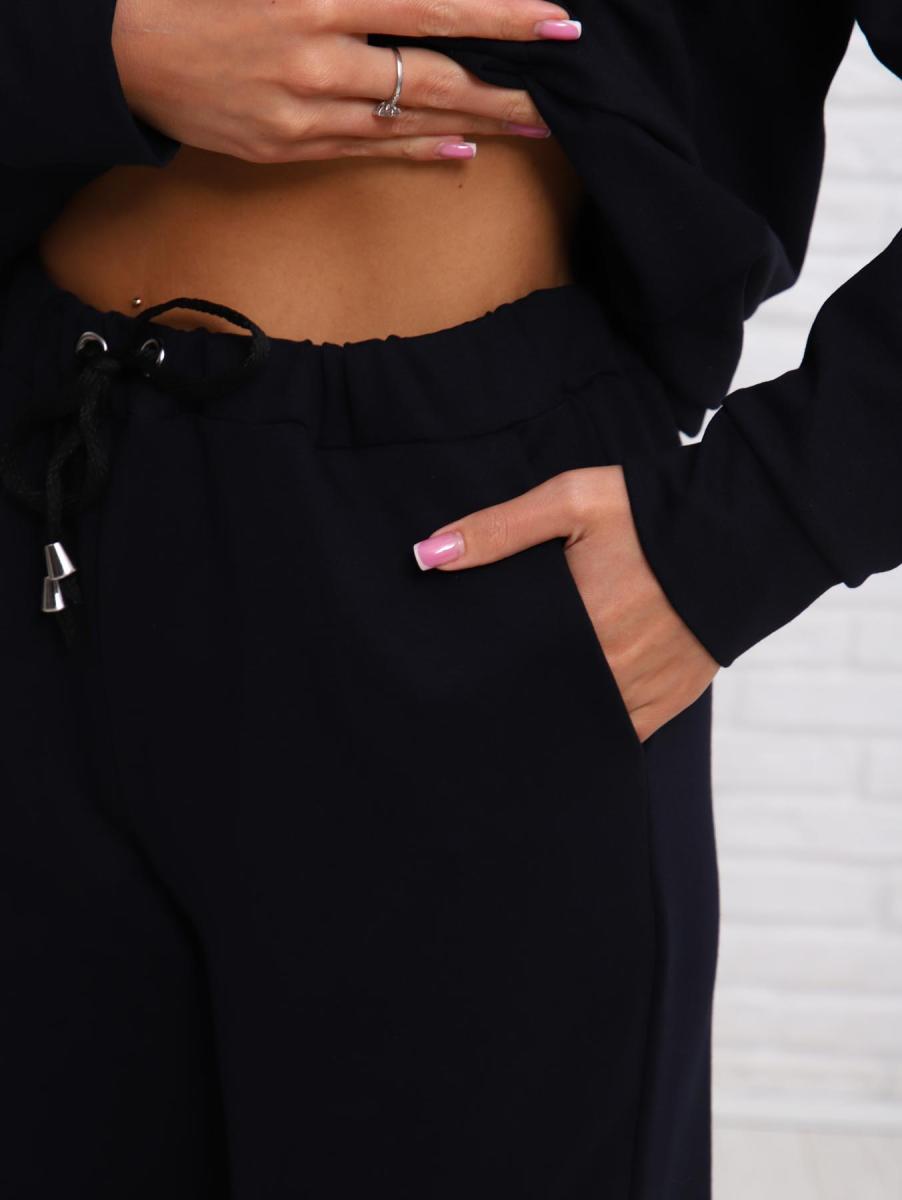 Костюм оснащен карманами, что позволяет удобно разместить мелочи. На полочке толстовки расположен буквенный принт, который придает оригинальность. Брюки высокой посадки с широкой резинкой и шнуром обеспечивают комфорт, а резинка внизу брюков создает завершенный вид.