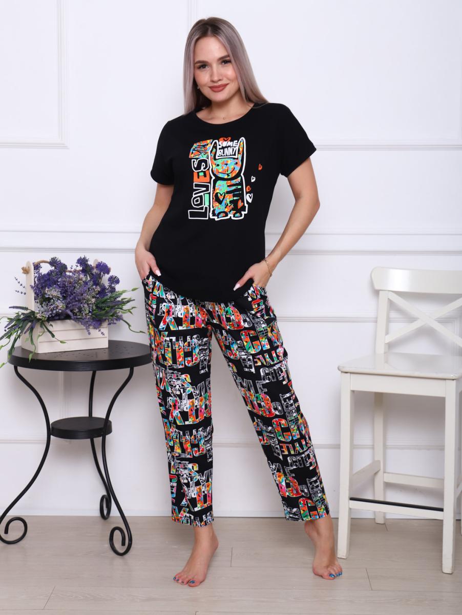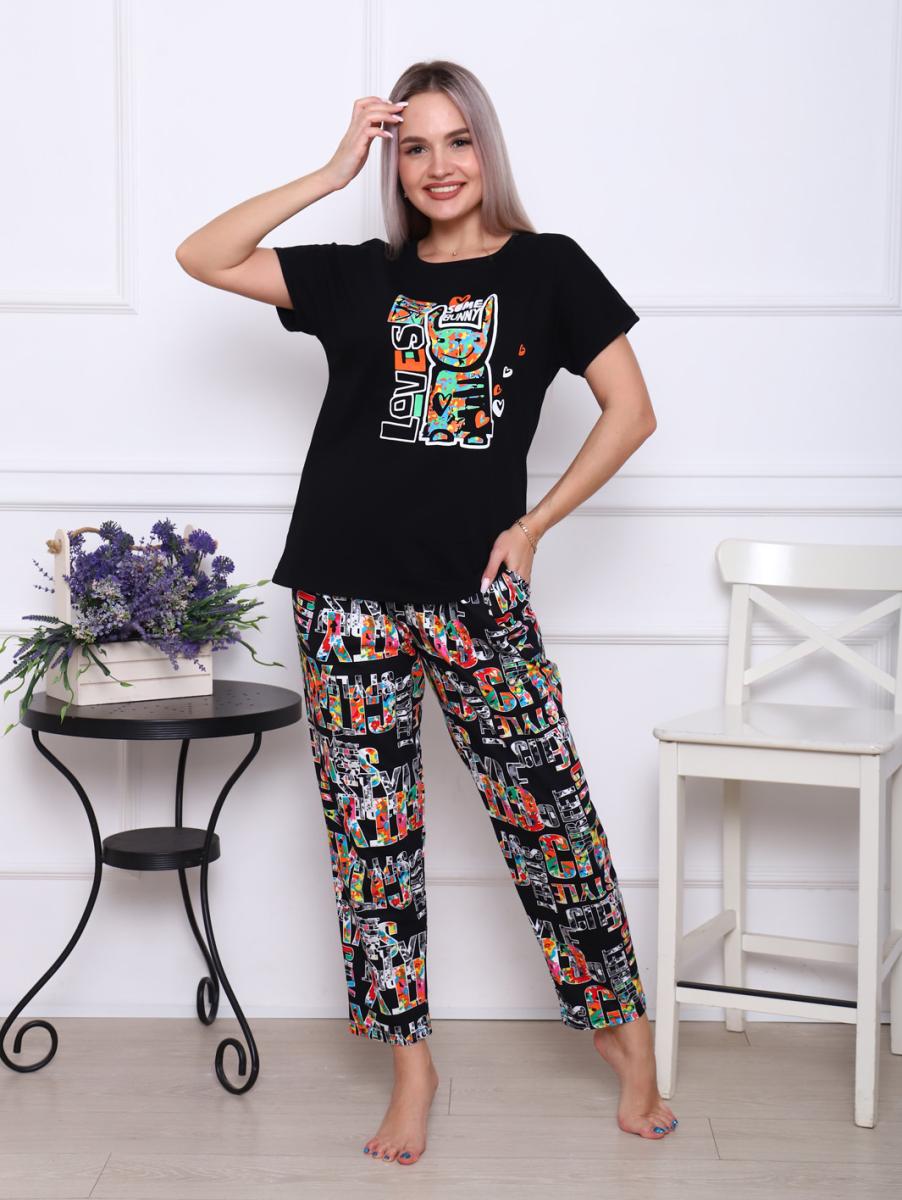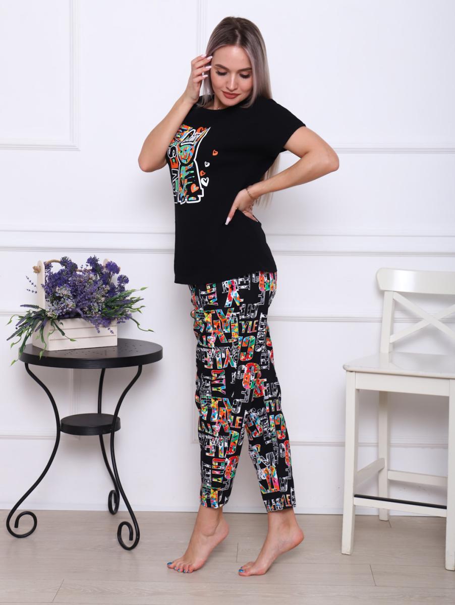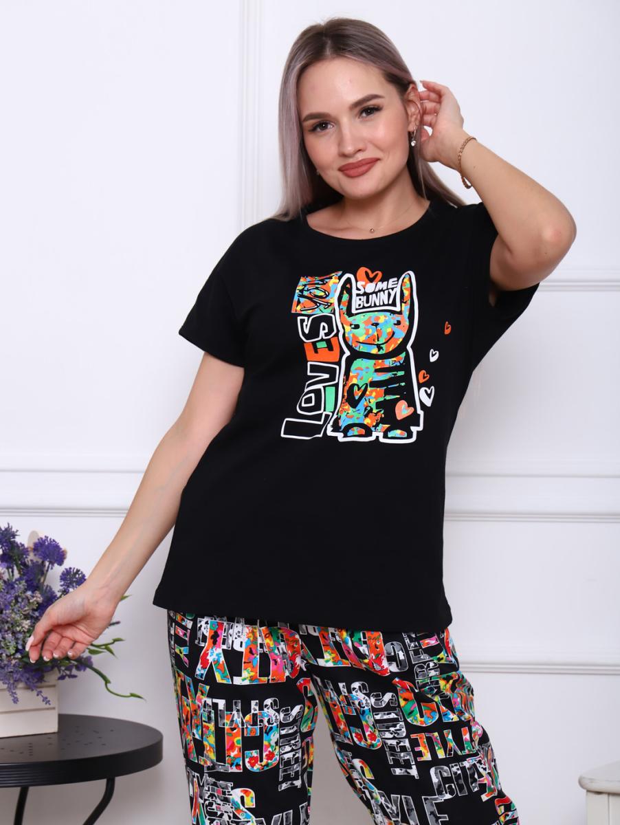 Костюм с брюками из кулирки набивной и однотонной кулирки станет вашей идеальной находкой для комфортного отдыха и домашних вечеров. Футболка свободного кроя с спущенным плечом и окантовкой на рукавах и горловине обеспечивает отличную посадку и стильный вид. Яркий принт на полочке придаёт образу оригинальности и игривости. Брюки модели чинос имеют резинку на талии и удобные карманы, что делает их практичными и функциональными. Эта модель идеально подходит как для домашних условий, так и для прогулок на свежем воздухе, позволяя вам оставаться стильной в любой ситуации. Преимущества костюма: