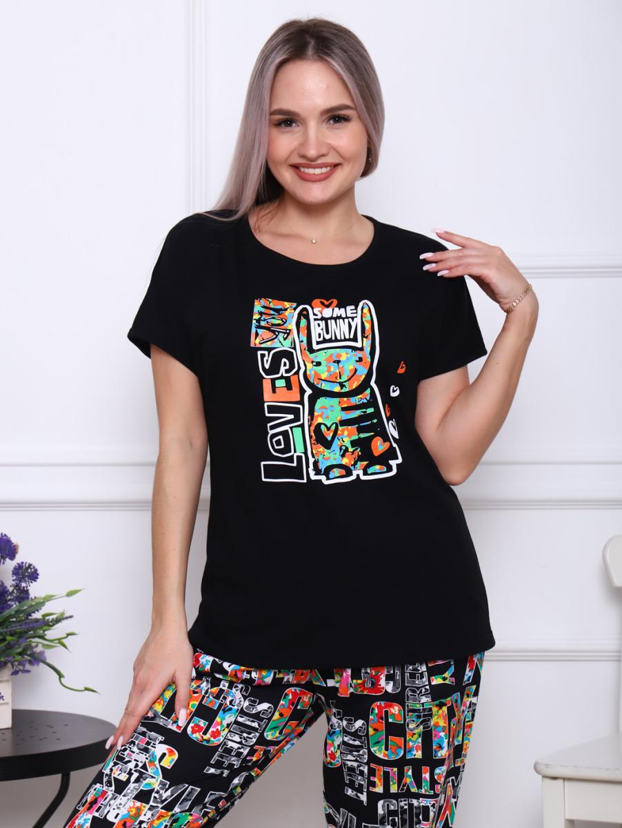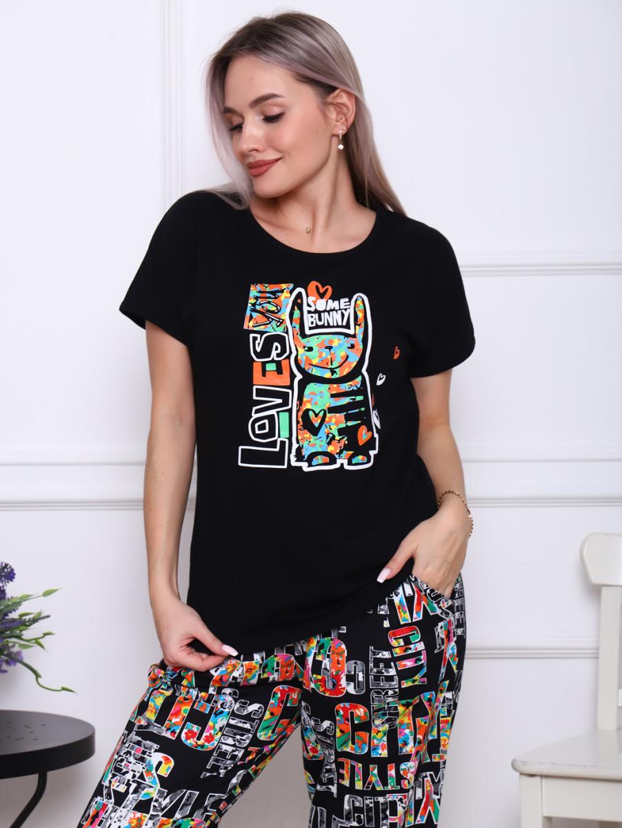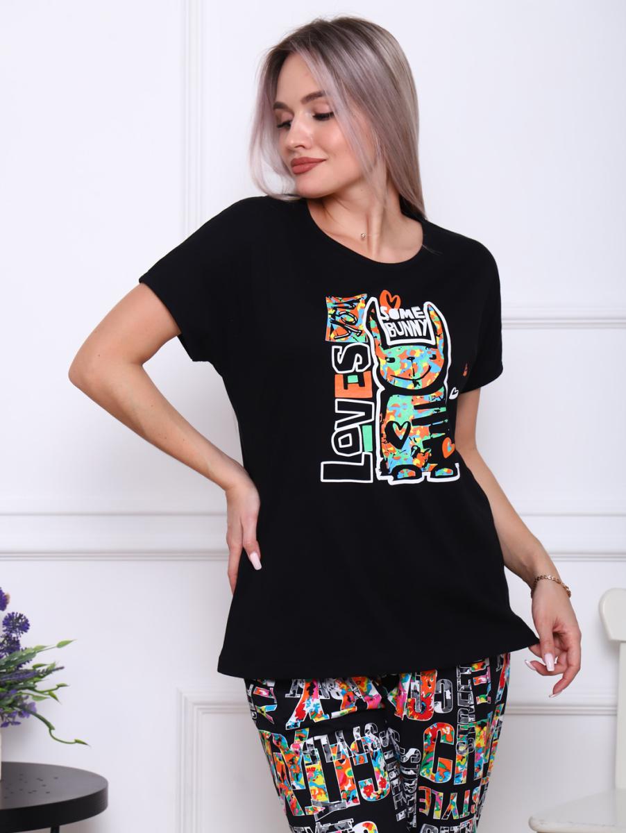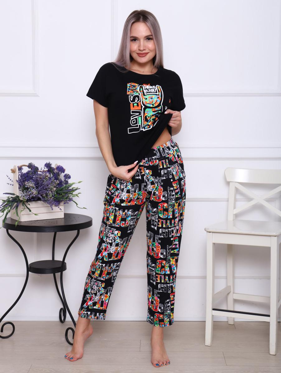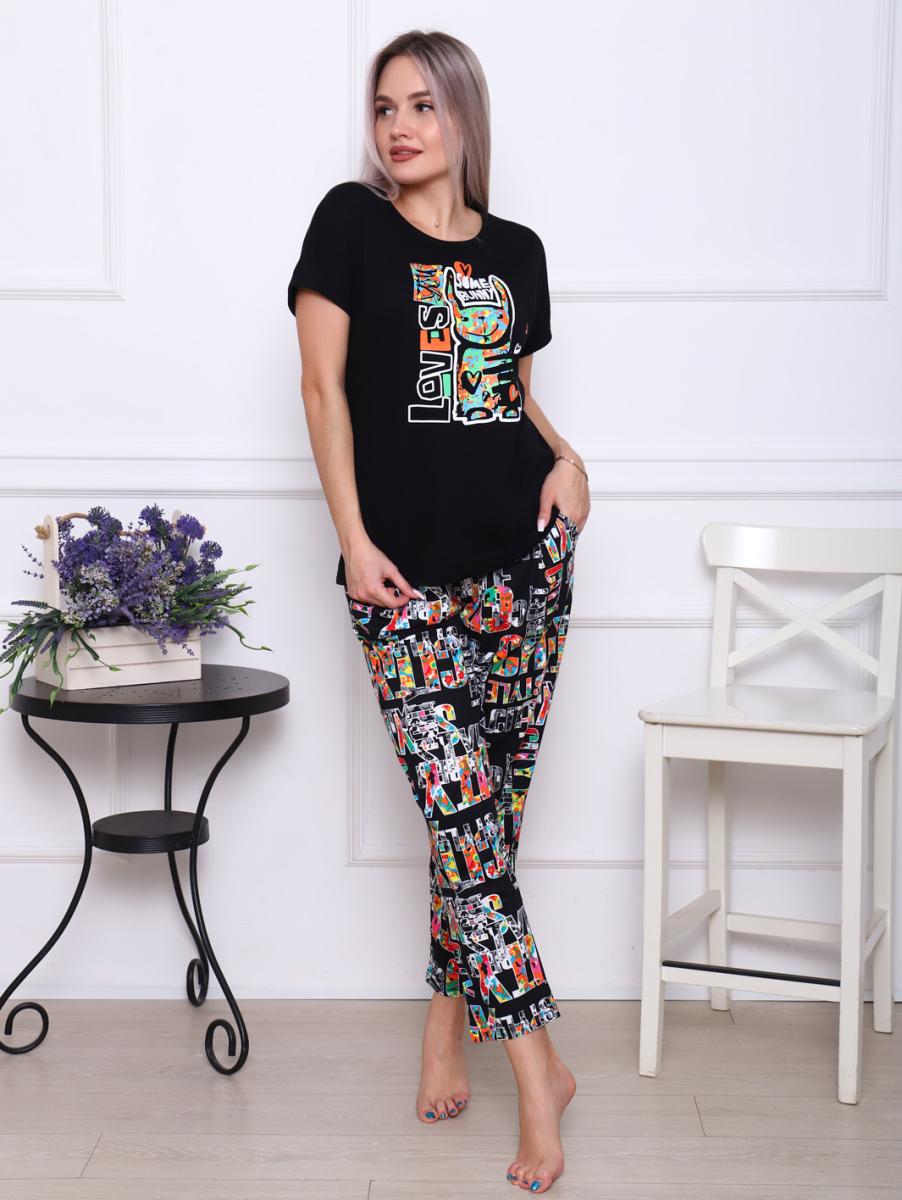 Костюм с брюками из кулирки набивной и однотонной кулирки станет вашей идеальной находкой для комфортного отдыха и домашних вечеров. Футболка свободного кроя с спущенным плечом и окантовкой на рукавах и горловине обеспечивает отличную посадку и стильный вид. Яркий принт на полочке придаёт образу оригинальности и игривости. Брюки модели чинос имеют резинку на талии и удобные карманы, что делает их практичными и функциональными. Эта модель идеально подходит как для домашних условий, так и для прогулок на свежем воздухе, позволяя вам оставаться стильной в любой ситуации. Преимущества костюма: