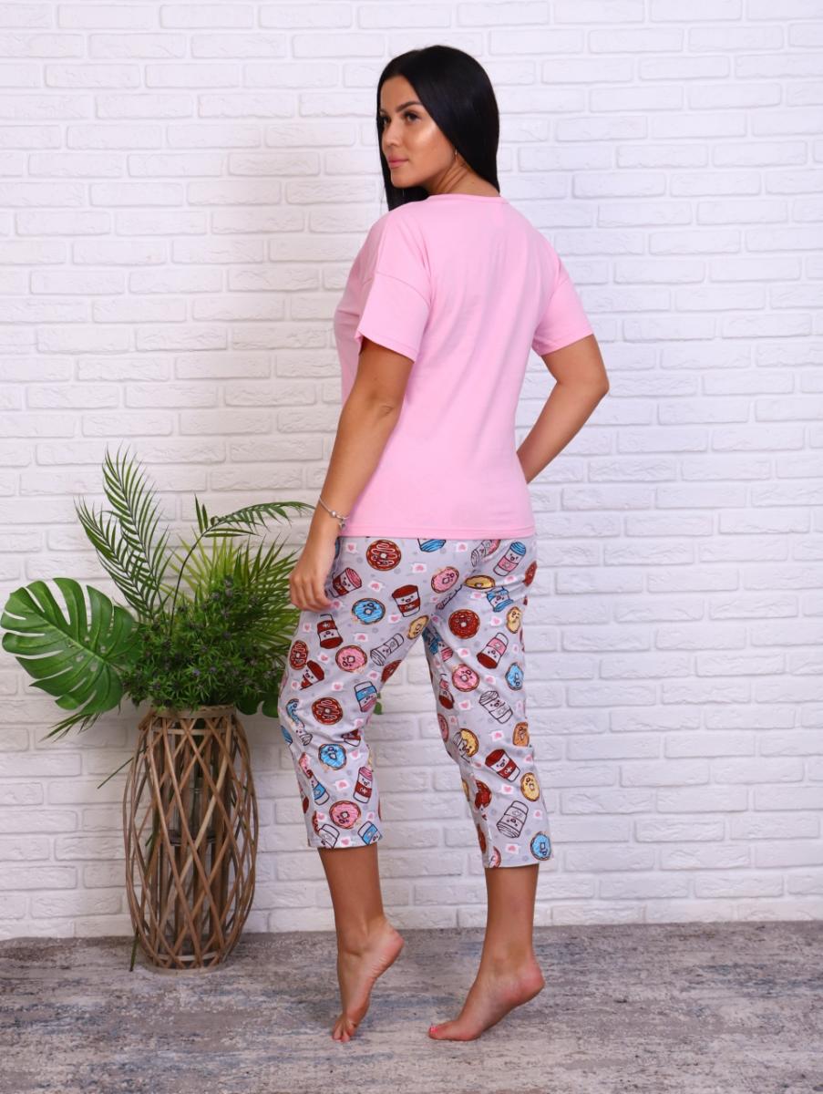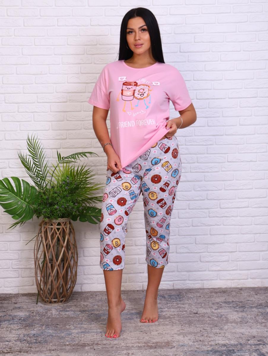 Погружайтесь в мир комфорта и стиля с нашим женским домашним костюмом с бриджами. Яркий розовый цвет и игривый принт на футболке, выполненной из мягкого кулирного хлопка, создают ощущение легкости и свежести. Футболка средней приталенности со спущенным плечом не только подчеркивает фигуру, но и обеспечивает максимальную свободу движений. Бриджи свободного кроя на резинке идеально сидят и дарят уют в любое время суток. Преимущества этого костюма: