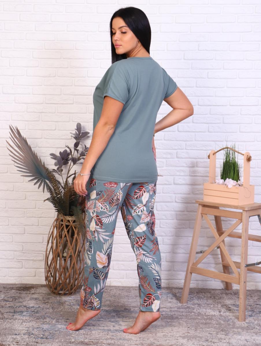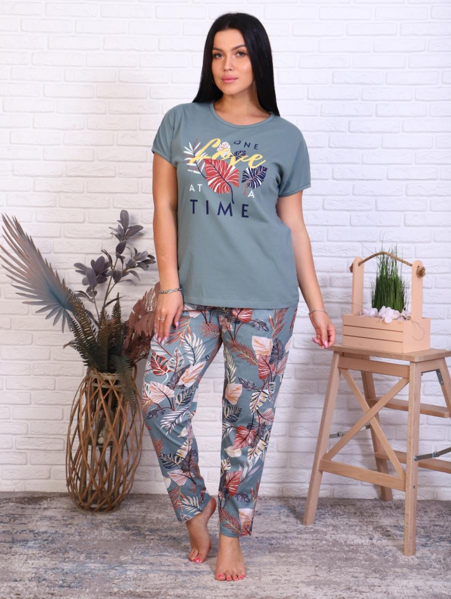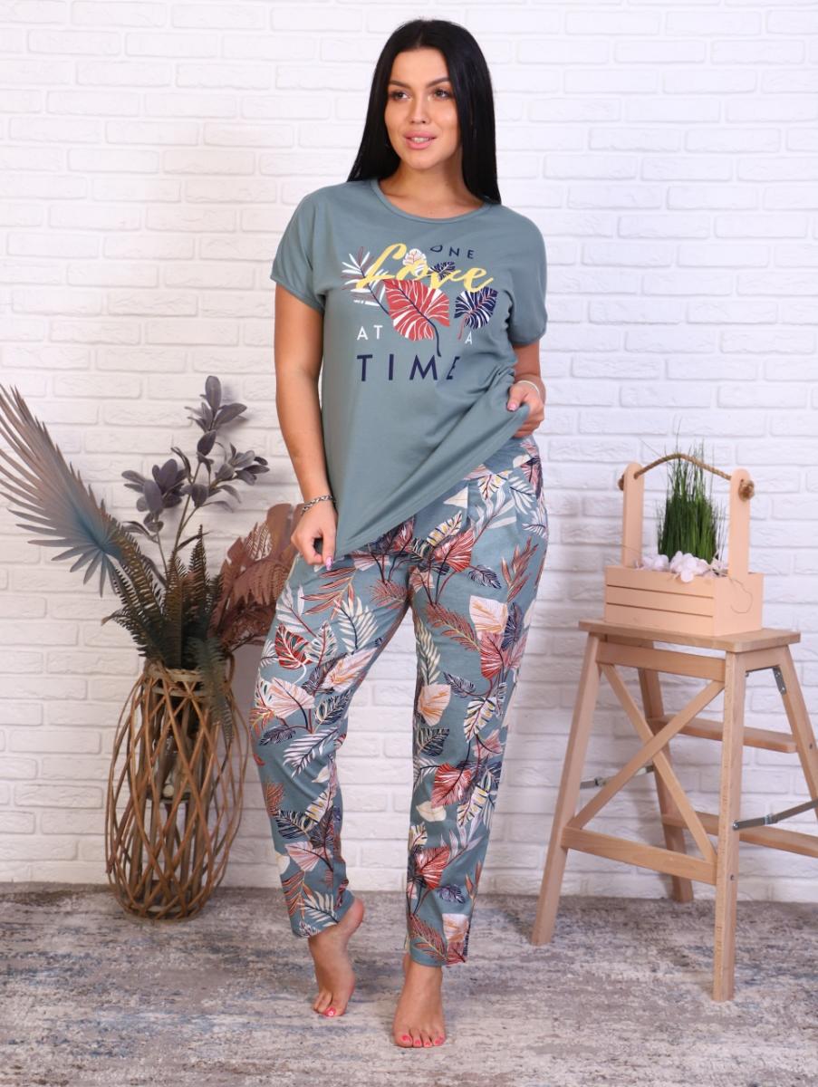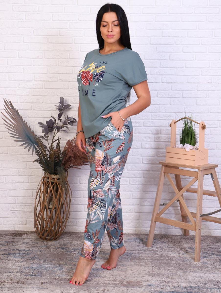 Костюм с брюками "Олива" — идеальный выбор для домашнего уюта и прогулок на свежем воздухе. Изготовленный из 100% хлопка, этот комплект сочетает в себе комфорт и стиль. Футболка свободного кроя с спущенным плечом и окантовкой на рукавах и горловине придаёт образу легкость. Яркий принт на полочке добавляет нотку оригинальности и свежести.