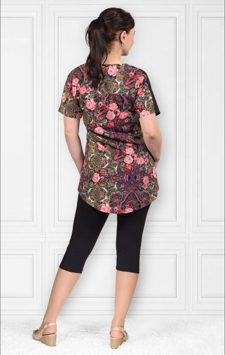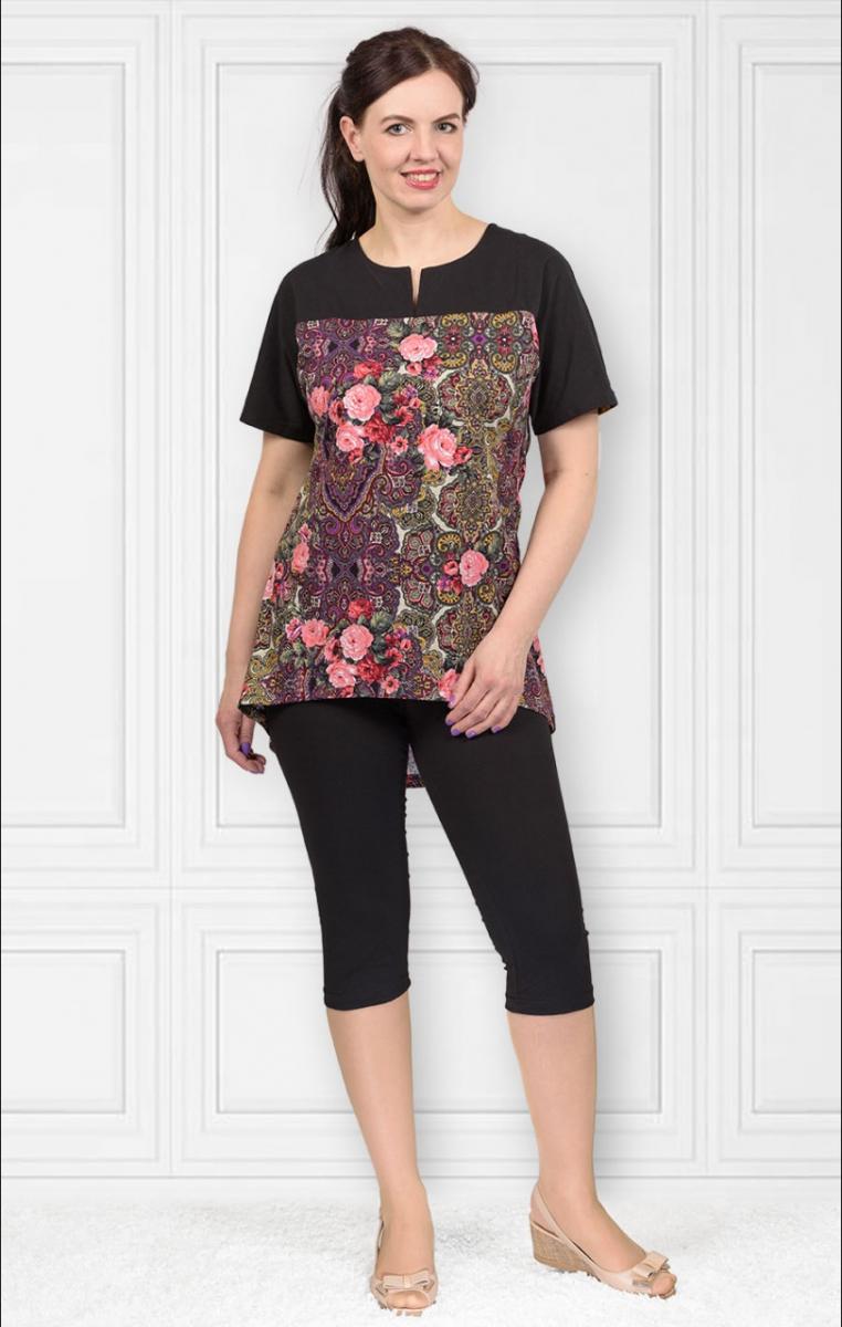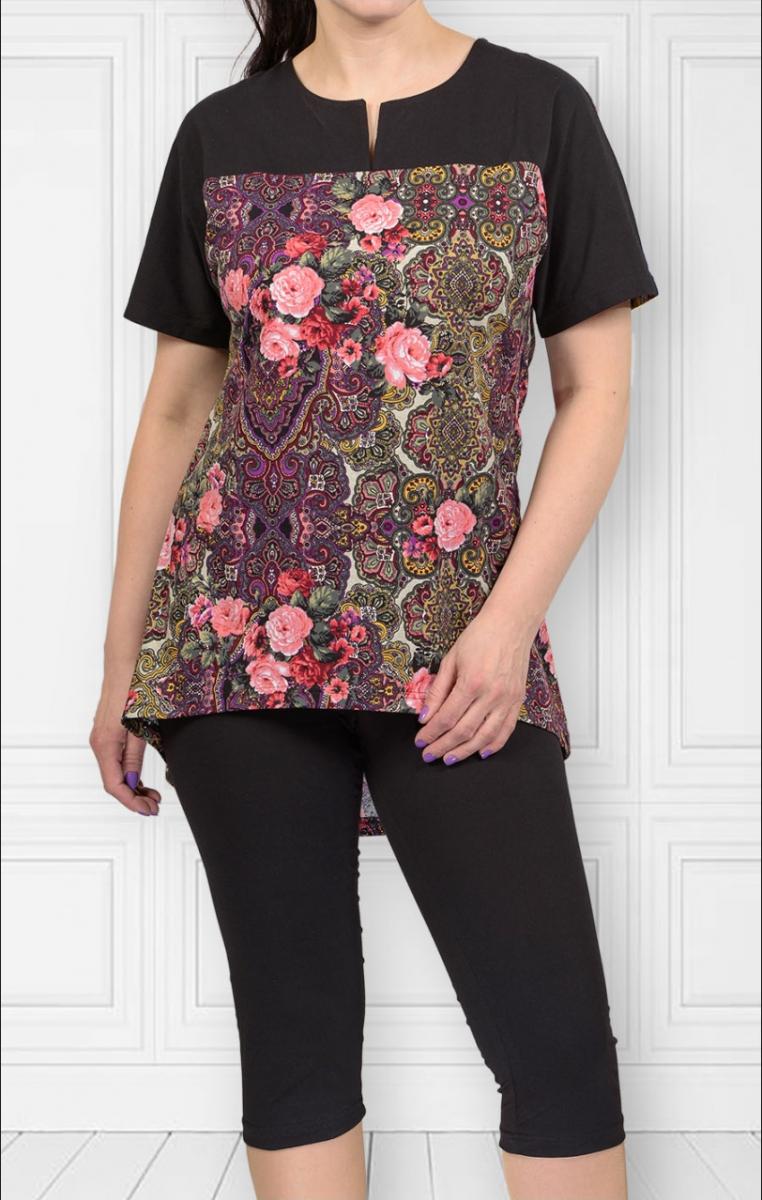 Костюм домашний с бриджами, выполненный из высококачественной кулирки реактив, станет идеальным выбором для уютных вечеров дома. Элегантный черный цвет основной ткани гармонично сочетается с яркой кокеткой, украшенной цветочным принтом, что придаёт образу свежесть и оригинальность.