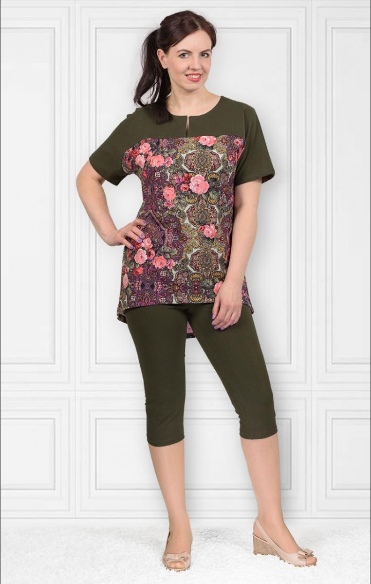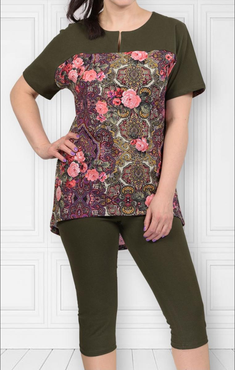 Костюм домашний с бриджами, оливковый, выполнен из высококачественной кулирки реактив, что обеспечивает невероятный комфорт и легкость в носке. Модель сочетает в себе стильный дизайн и практичность: спинка и перед украшены кокеткой, а спущенный рукав добавляет нотку небрежной элегантности. Удлиненный низ по спинке создает эффектный силуэт, а однотонные бриджи идеально дополняют образ.