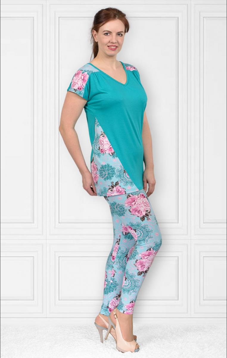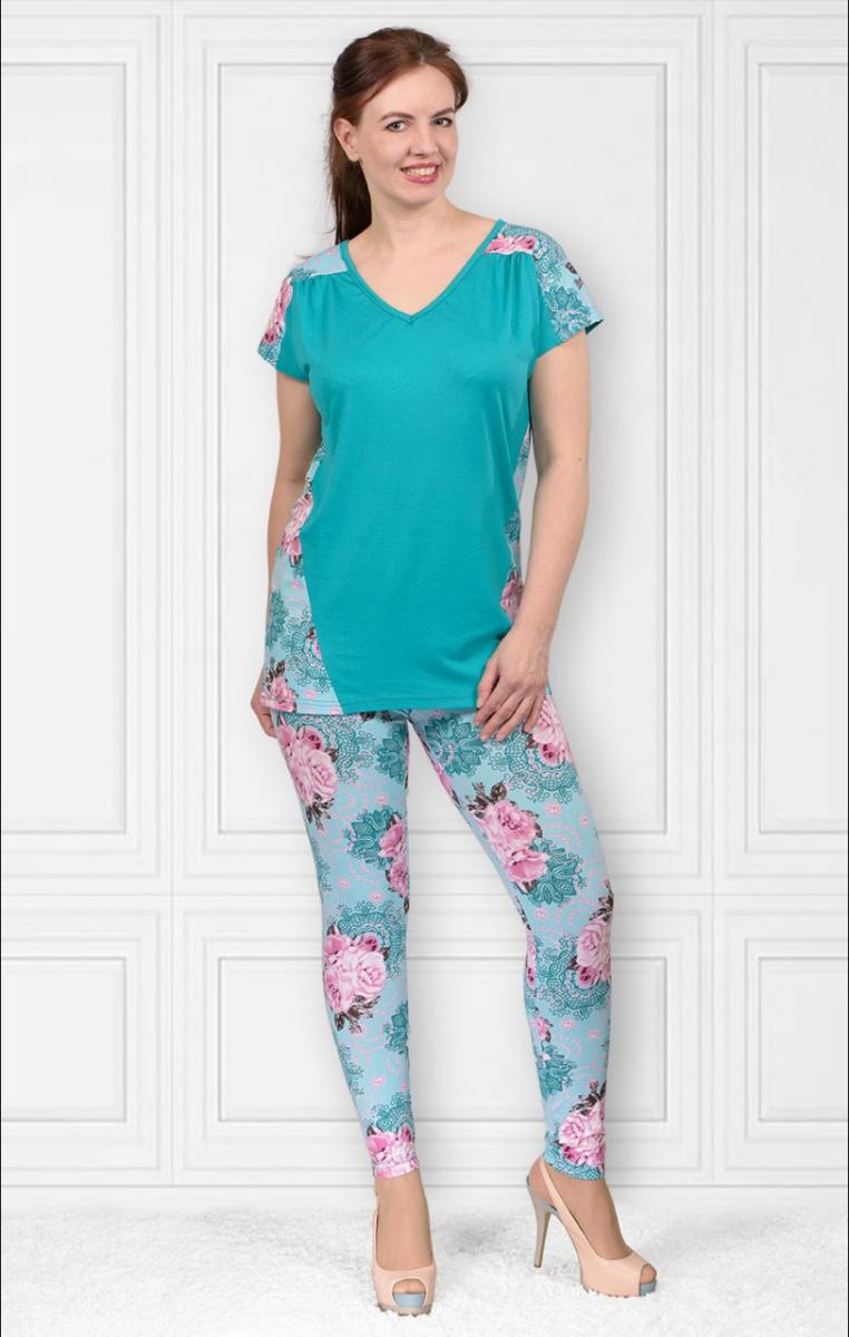 Уют и стиль в одном комплекте! Этот женский домашний костюм из вискозы сочетает в себе комфорт и элегантность. Блуза выполнена в комбинации гладкокрашенной вискозы и набивной ткани, что придаёт ей оригинальности и шарма. Легинсы, украшенные ярким floral-рисунком, идеально дополняют образ и обеспечивают свободу движения.