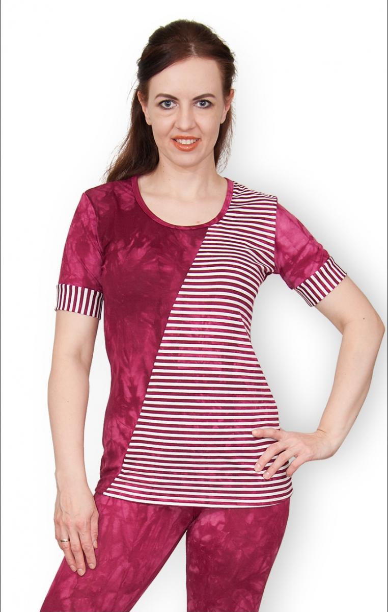 Костюм с бриджами из вискозы - батик, выполненный в стильной бордовой расцветке, станет идеальным выбором для домашнего уюта и отдыха. Гладьё комбинированное с полоской добавляет оригинальности, а однотонная спинка придаёт элегантности. Этот костюм не только красив, но и комфортен благодаря высокому качеству ткани: 95% вискозы и 5% лайкры обеспечивают отличную посадку и мягкость на ощупь. Преимущества этого костюма: