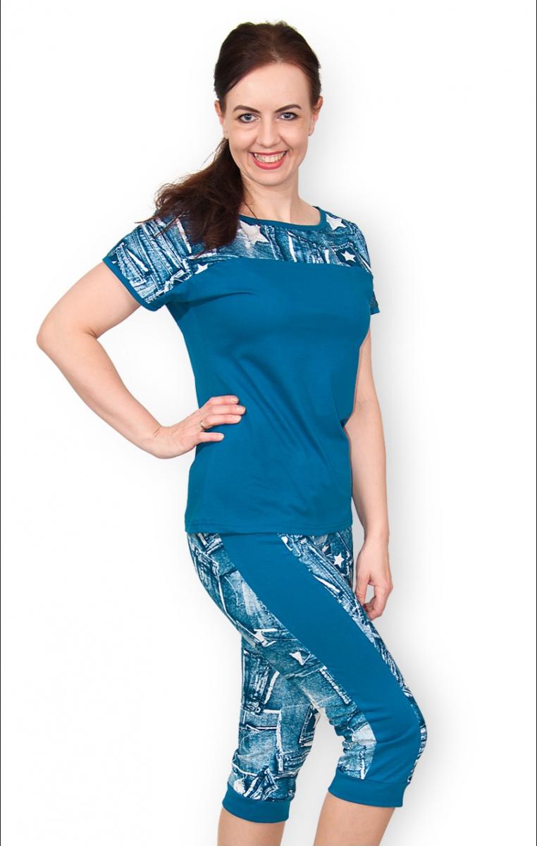 Костюм включает бриджи с боковыми вставками и манжетами, что придает ему современный и аккуратный вид. Футболка с спущенным рукавом и кокеткой на спинке добавляет изысканности и легкости образу.