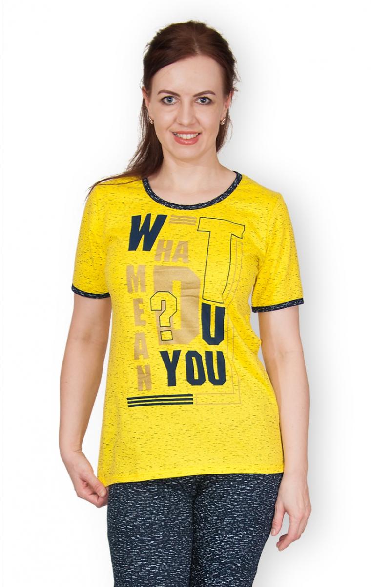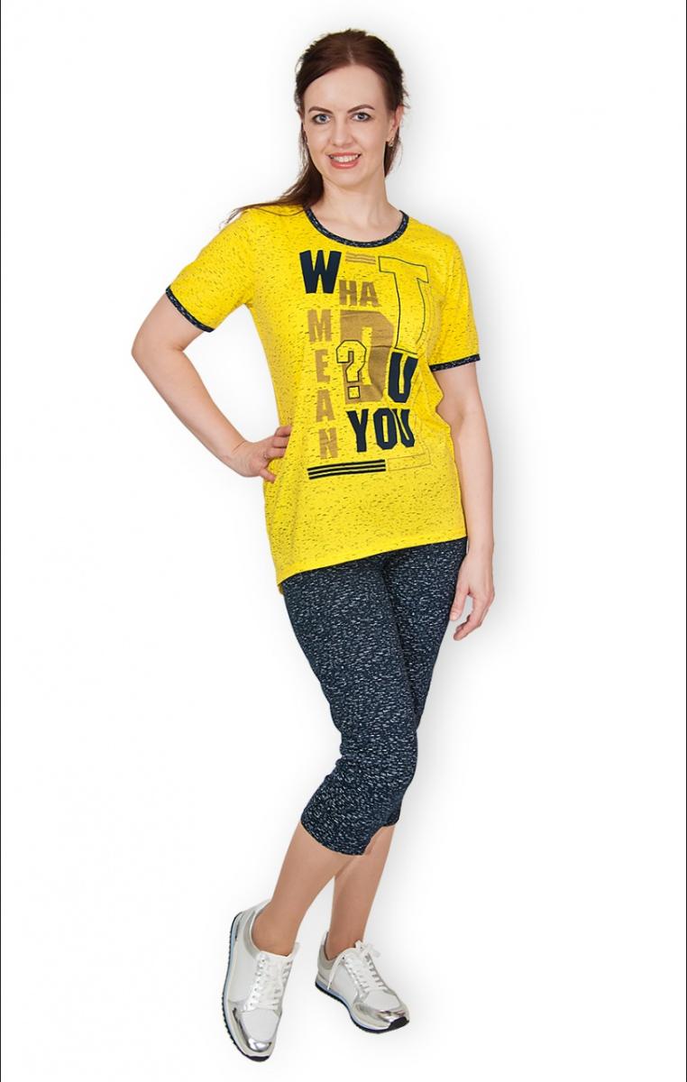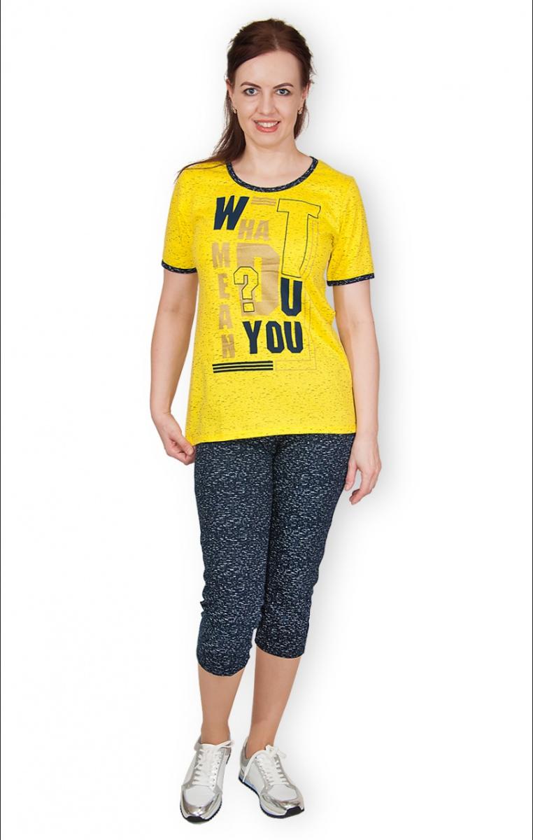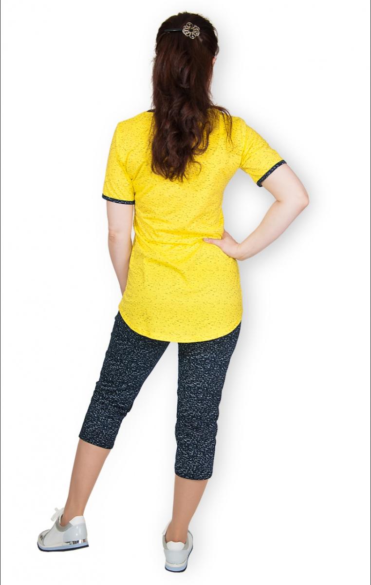 Этот женский домашний костюм из кулирки "берёзка" — идеальный выбор для комфортного отдыха дома. Яркий желтый цвет и высококачественный принт делают его стильным и привлекательным. Спинка костюма длиннее полочки, что соответствует последним модным тенденциям и обеспечивает дополнительный комфорт. Бриджи имеют пояс, обработанный на специальной машине, что гарантирует идеальную посадку. Такой подход к дизайну позволяет вам чувствовать себя уверенно и удобно в любой ситуации. Преимущества данного костюма: