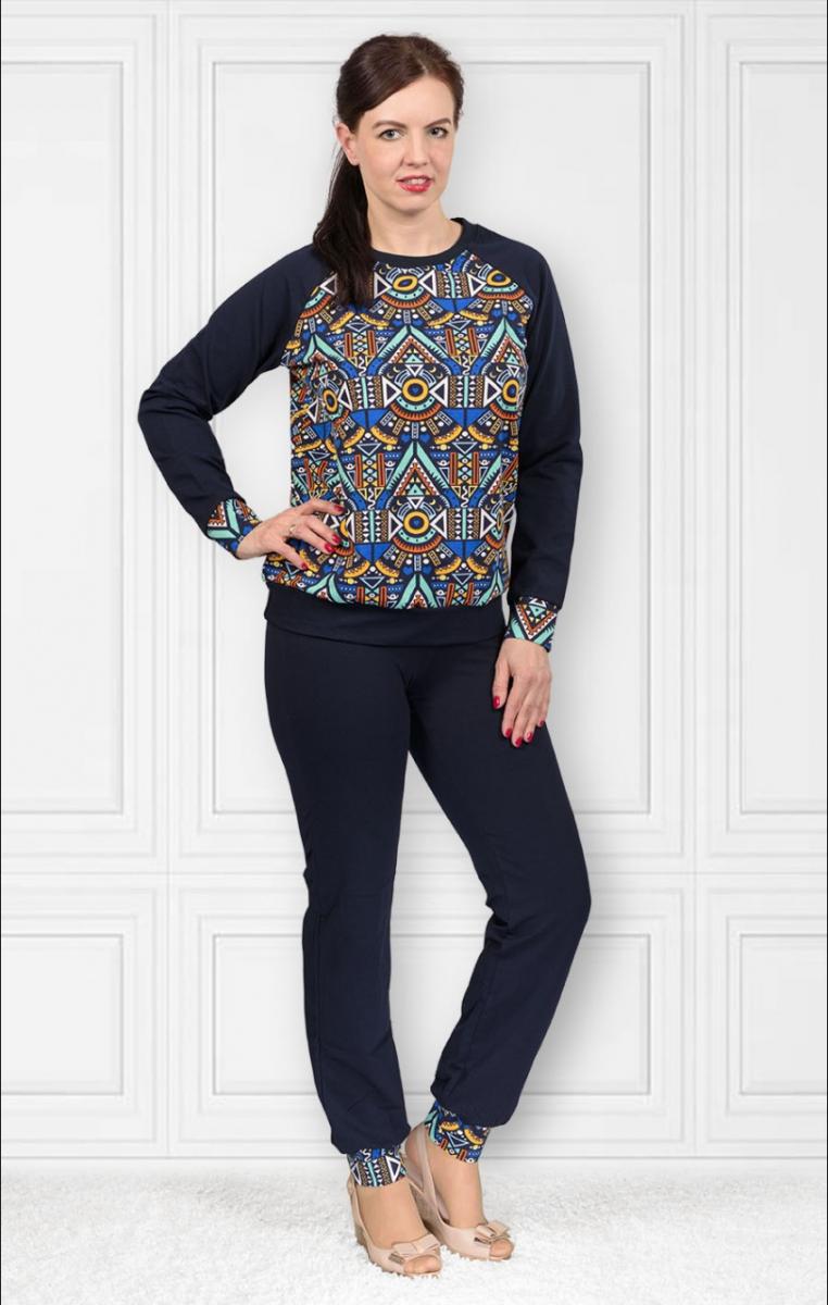 Костюм отличается оригинальным дизайном: яркая расцветка и геометрический принт на кофте привнесут в ваш домашний стиль нотки яркости и индивидуальности. Обтачка из рибаны по горловине добавляет элегантности, а рукав реглан обеспечивает удобство и стиль. Низ брюк обработан манжетой, что делает их идеальными для активного отдыха дома.