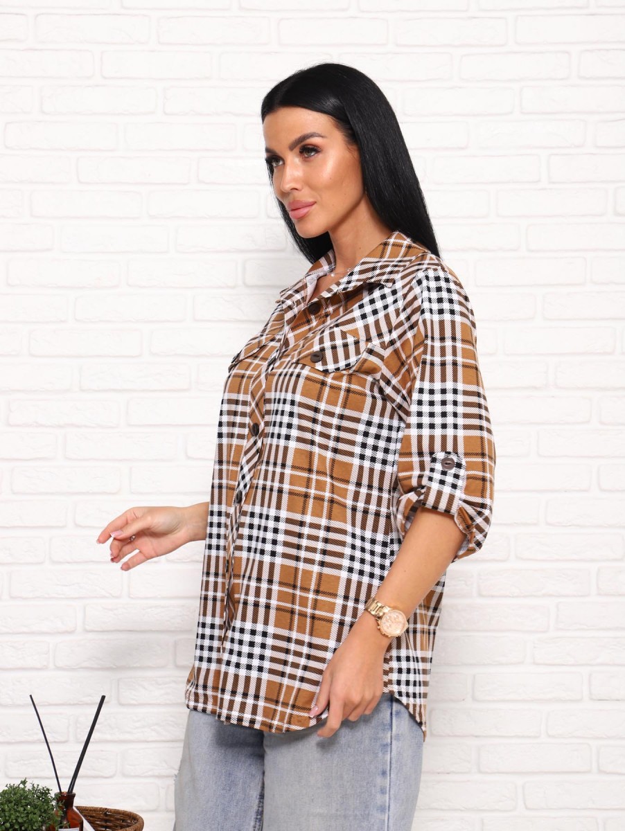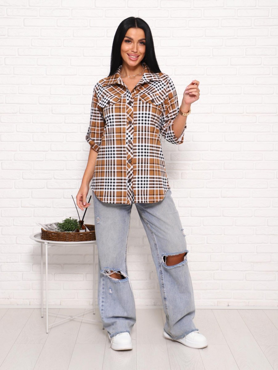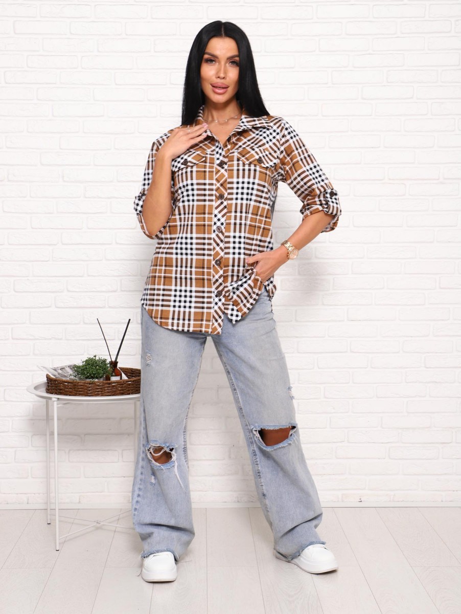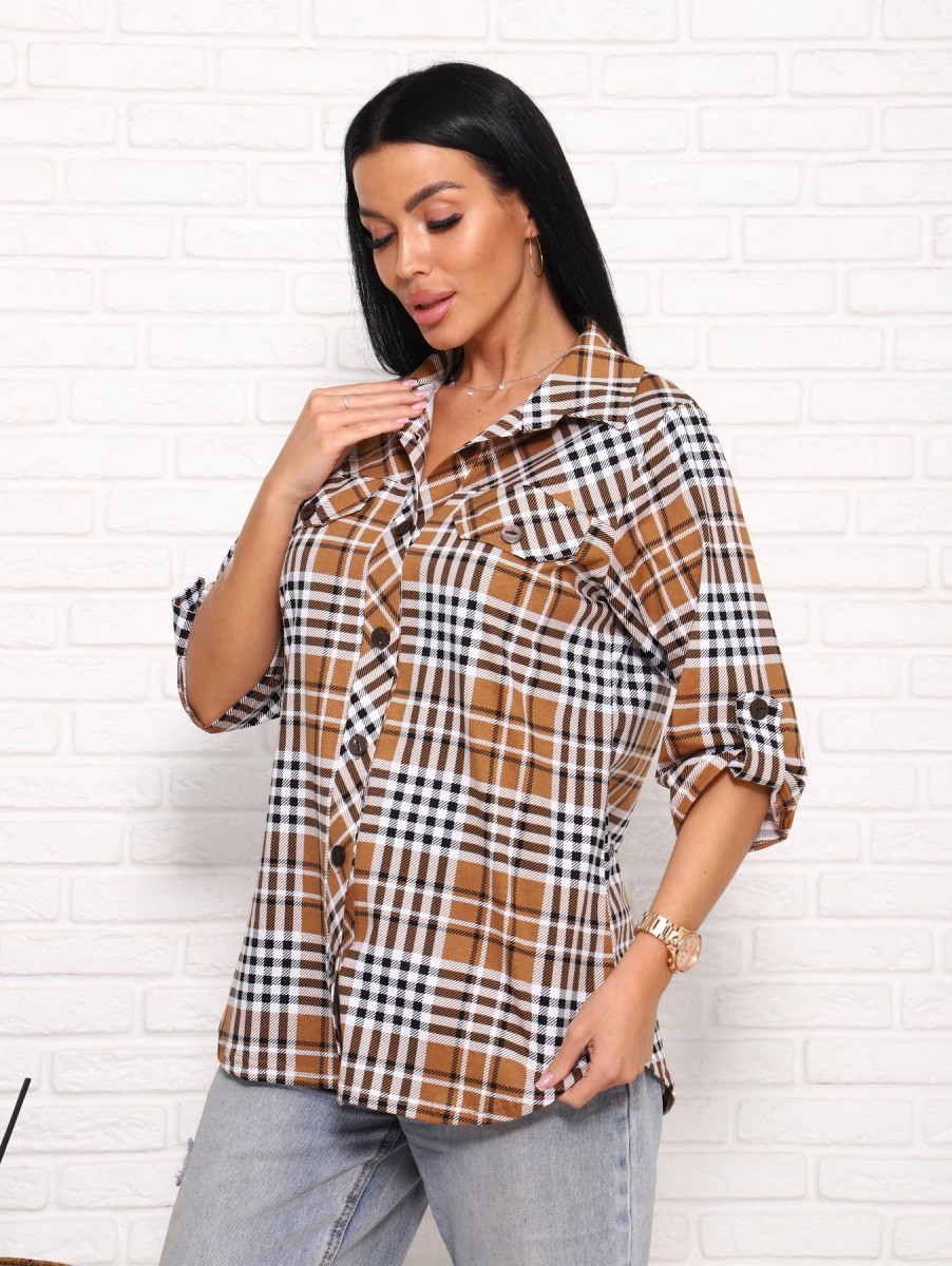 Эта стильная женская рубашка изготовлена из высококачественной кулирки реактив, что обеспечивает невероятный комфорт и мягкость на ощупь. Основной цвет коричневого оттенка с эффектным клетчатым рисунком делает ее универсальным элементом гардероба, подходящим для различных случаев.