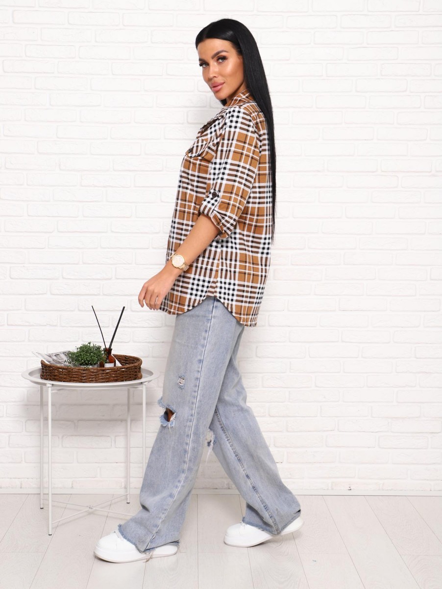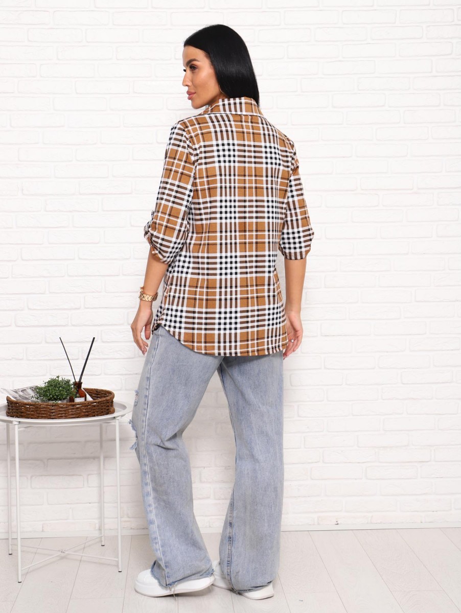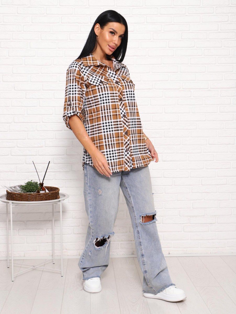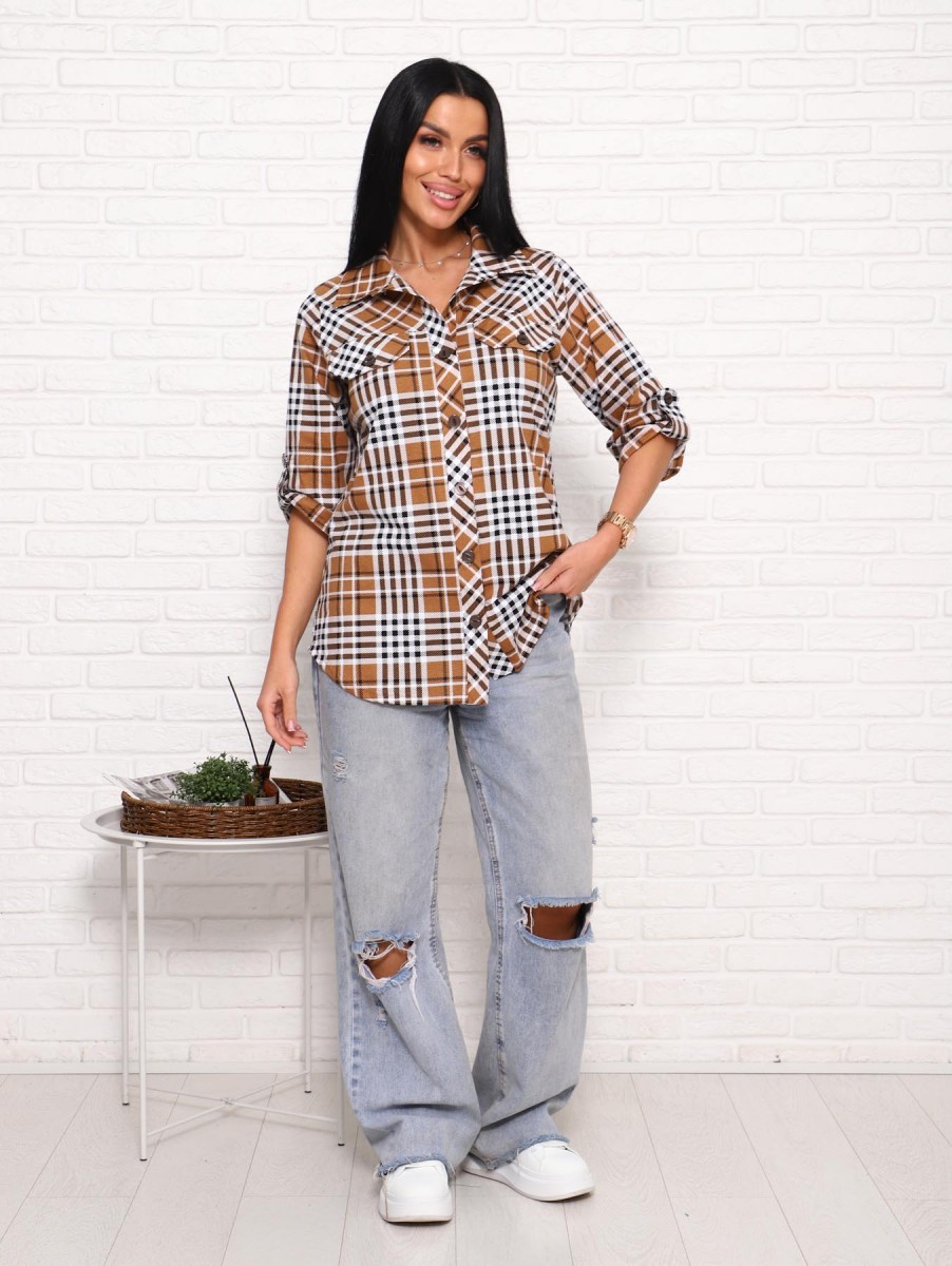 Эта стильная женская рубашка изготовлена из высококачественной кулирки реактив, что обеспечивает невероятный комфорт и мягкость на ощупь. Основной цвет коричневого оттенка с эффектным клетчатым рисунком делает ее универсальным элементом гардероба, подходящим для различных случаев.