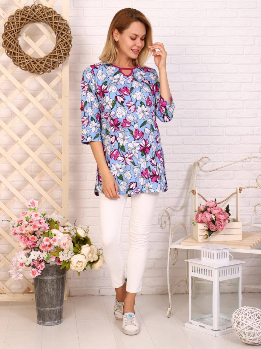 Туника из кулирки реактив — идеальный выбор для стильных и комфортных образов. Выполненная из 100% хлопка, она обеспечивает отличную воздухопроницаемость и приятные ощущения на коже. Нежный цветочный принт на фоне небесного голубого цвета придаёт образу свежесть и яркость. Рукава 3/4 длины добавляют элегантности, а пришитая "пата" с петелькой и пуговицей обеспечивает удобство застегивания. Декоративные пуговицы по боковым швам придают тунике особый шарм, делая её универсальной для любых случаев. Преимущества этой туники: