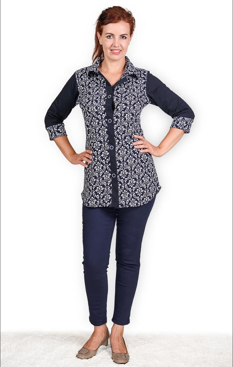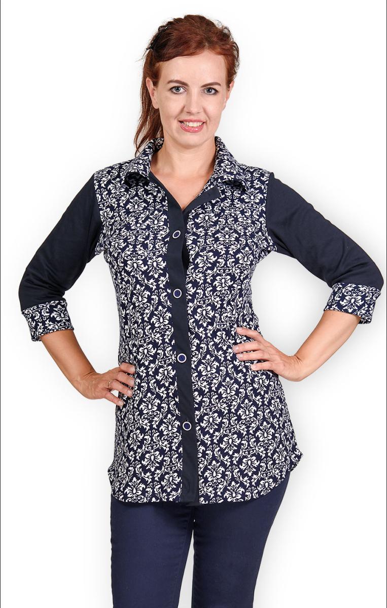 С уникальным дизайном, блуза оснащена двумя накладными нагрудными карманами, что добавляет ей изюминку и функциональность. Отделка рукавов и планки на пуговицах выполнена однотонным интерлоком-пенье, что создает гармоничный и элегантный вид.