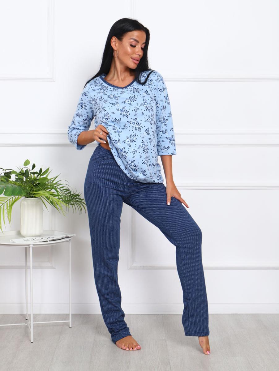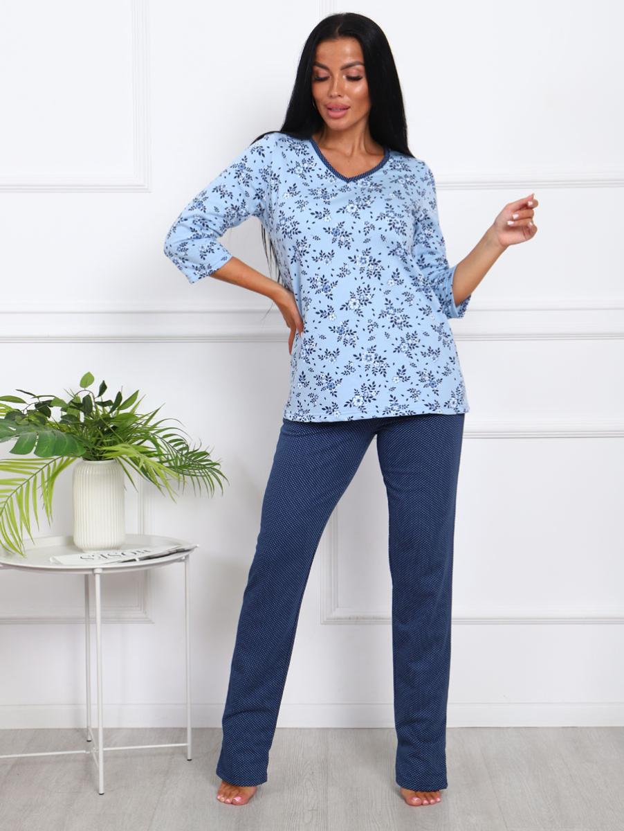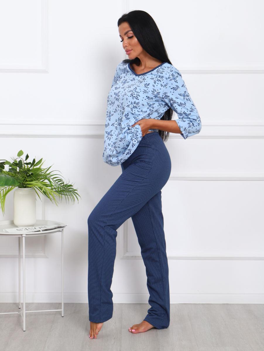 Пижама имеет рукава 3/4 и изящный V-вырез горловины, что придаёт ей элегантный вид. Брюки на резинке обеспечивают надежную посадку и свободу движений, позволяя вам чувствовать себя комфортно и расслабленно.
