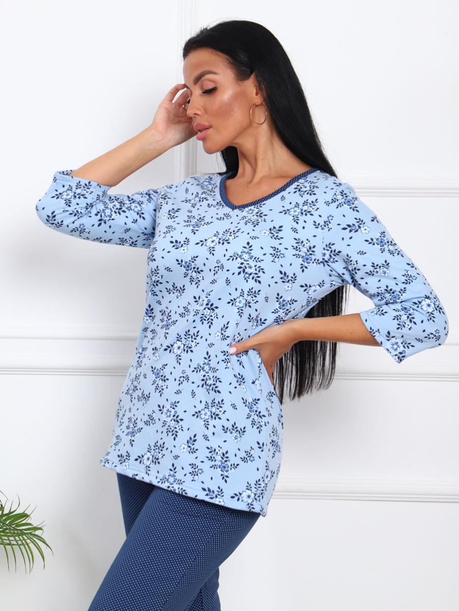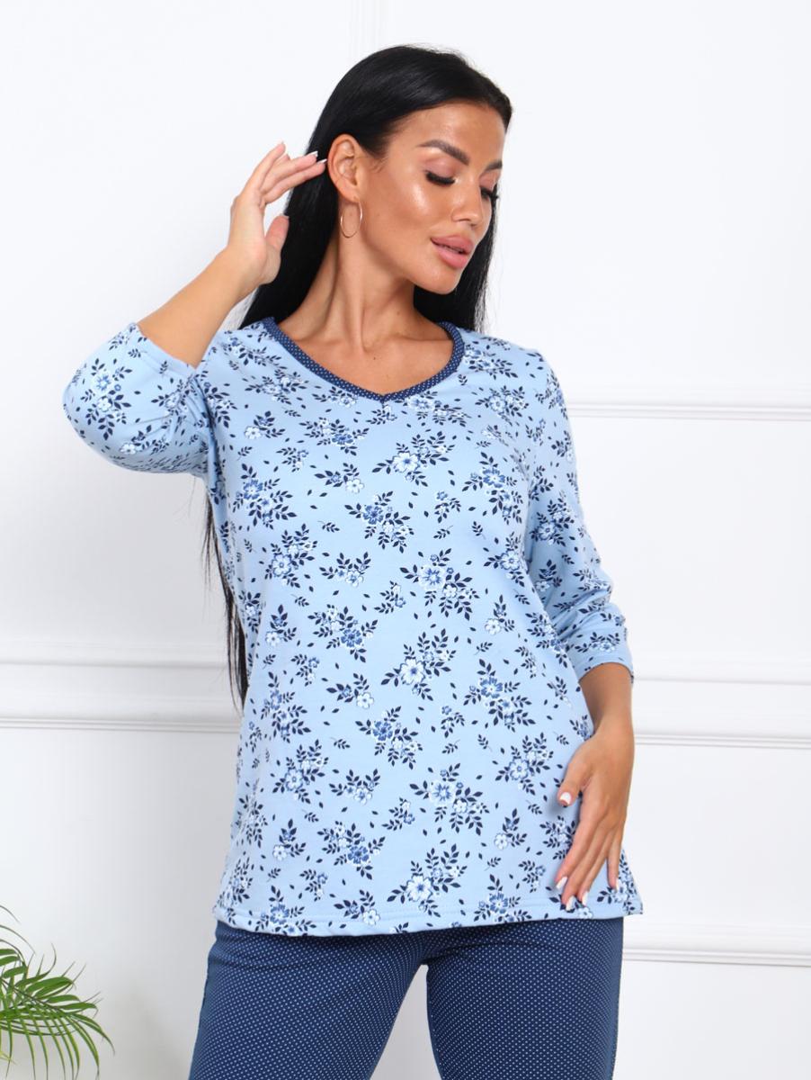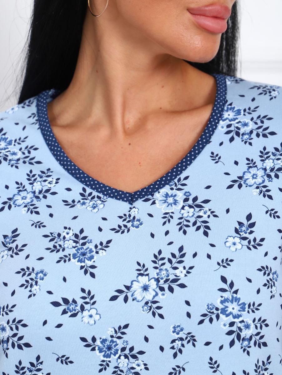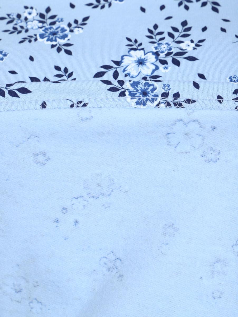 Выраженный голубой цвет с нежным цветочным принтом создаёт атмосферу нежности и спокойствия, идеально подходя для уютных вечеров дома.
