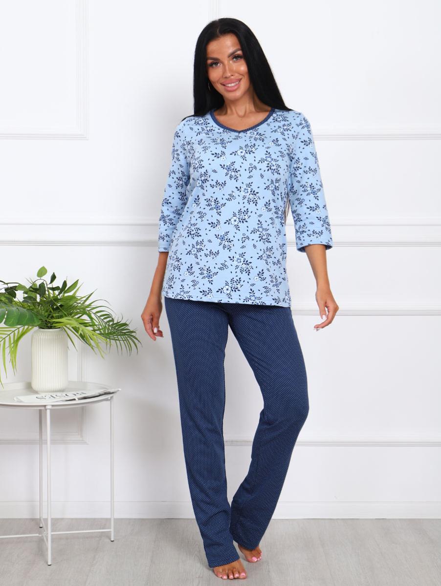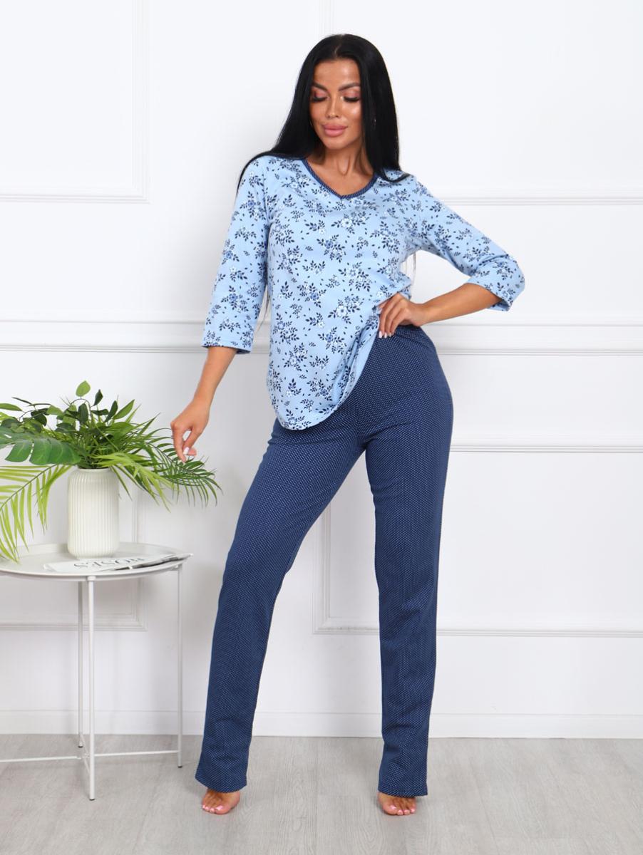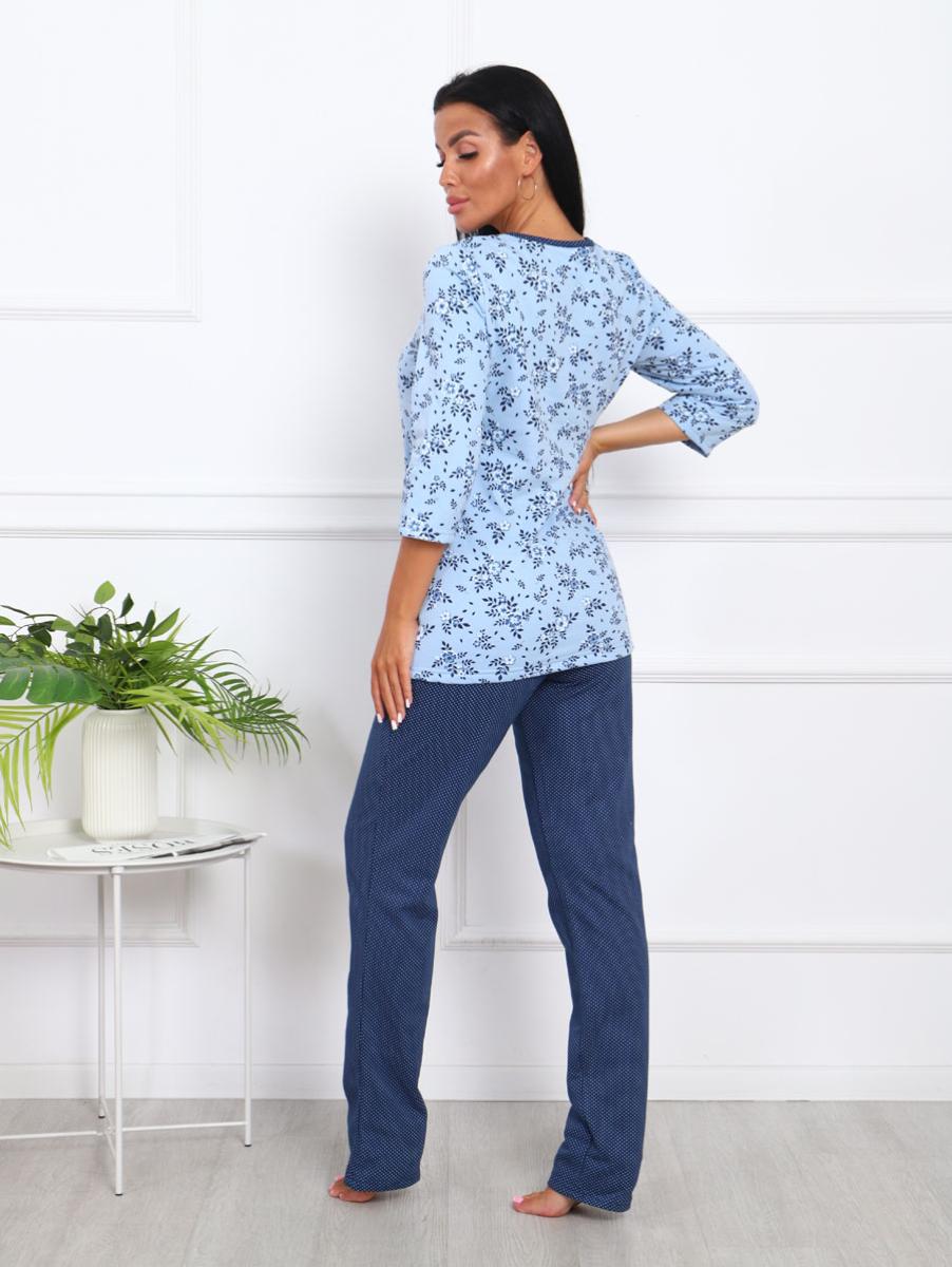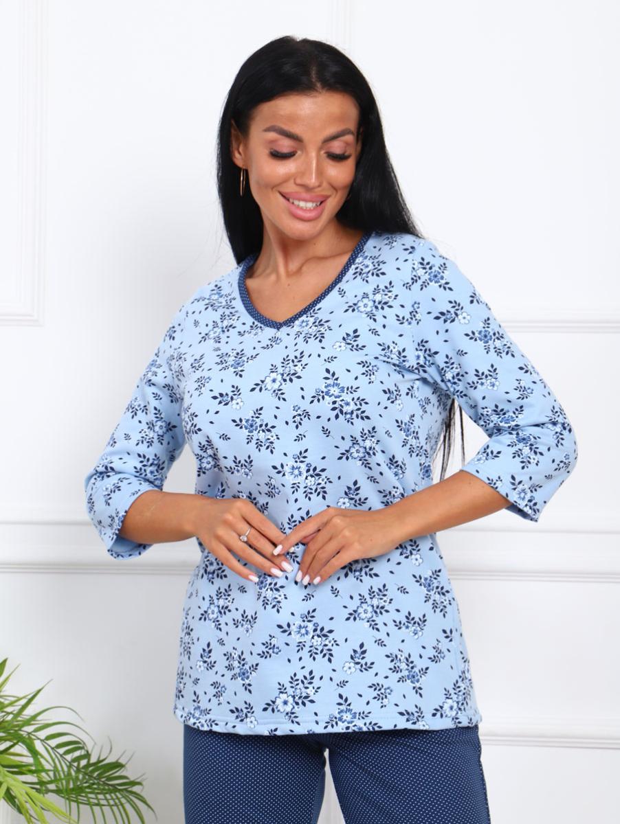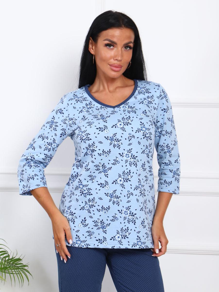 Выраженный голубой цвет с нежным цветочным принтом создаёт атмосферу нежности и спокойствия, идеально подходя для уютных вечеров дома.