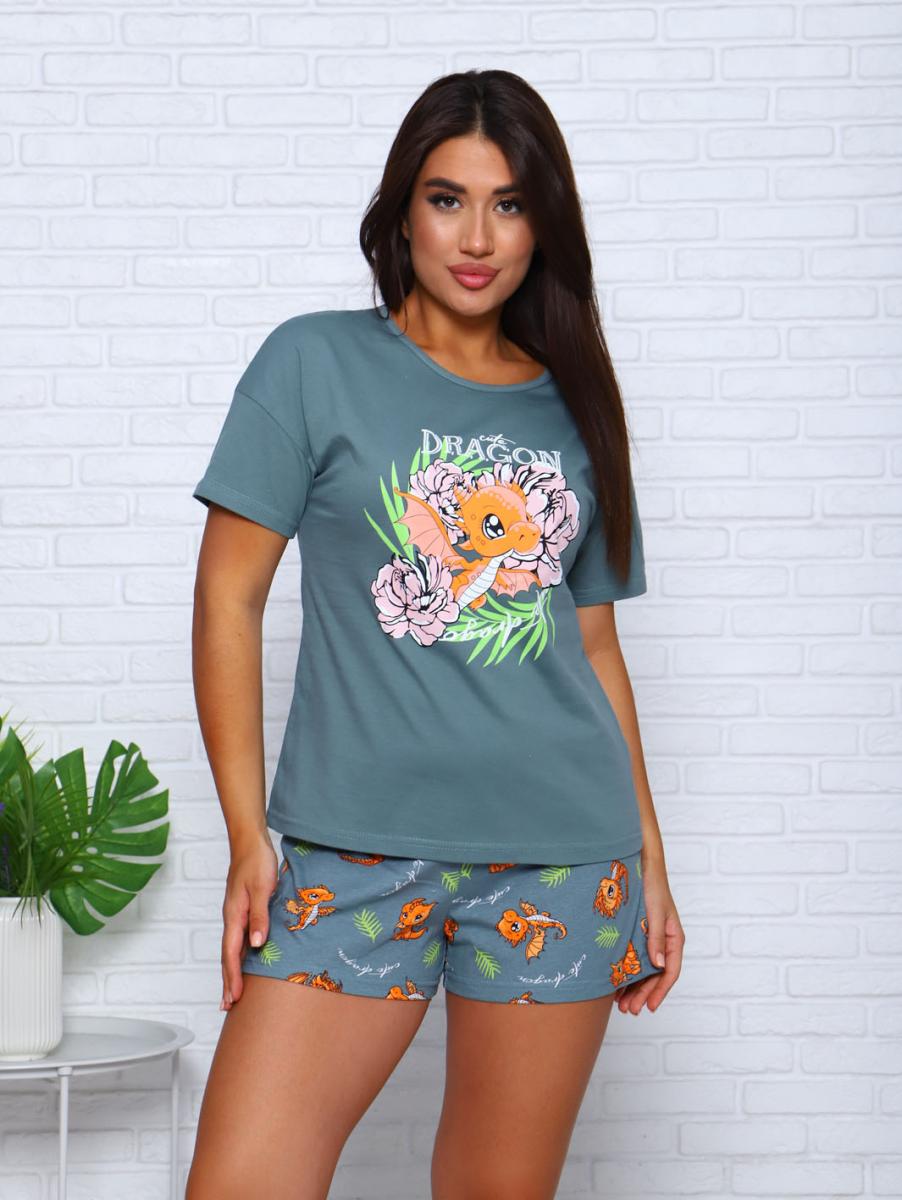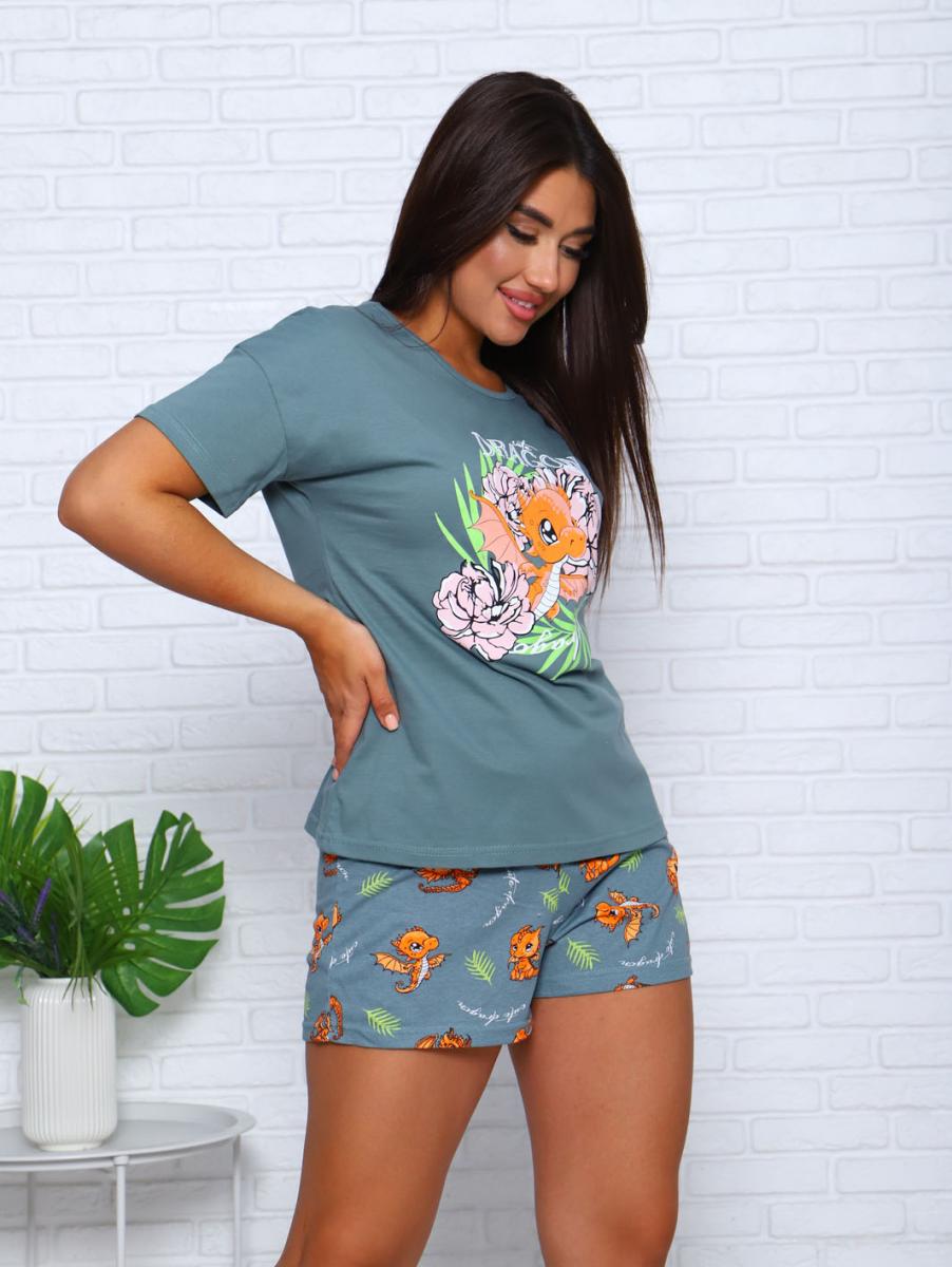 Пижама с шортами, принт, зеленый (952-2)