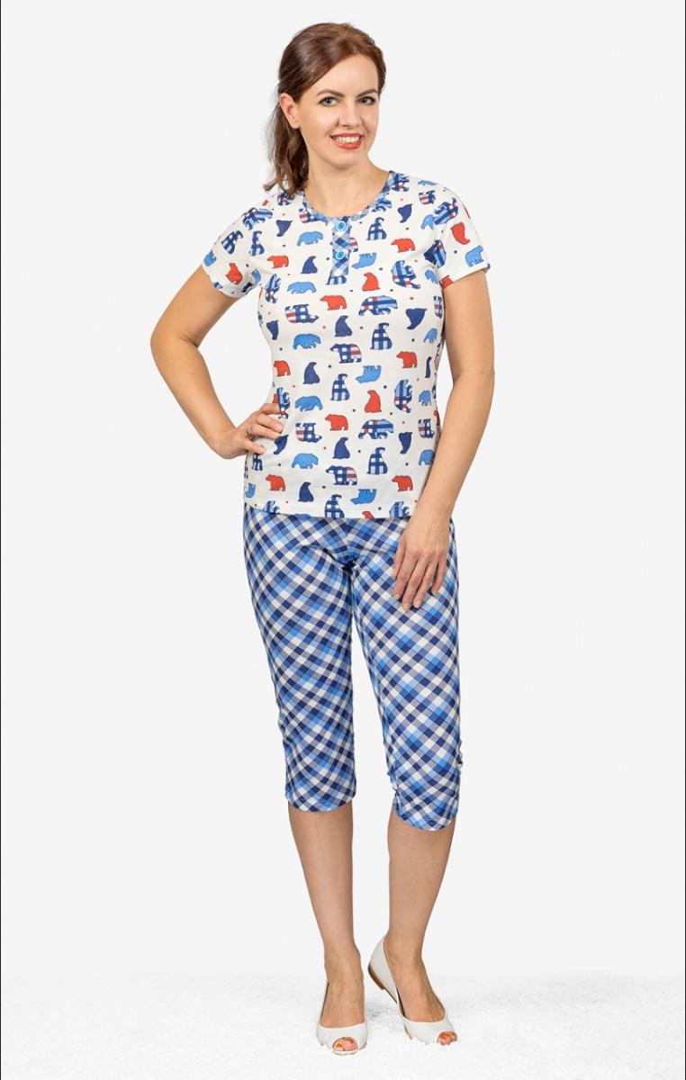 Футболка с планкой на пуговицах добавляет изящества и практичности, а яркий дизайн с элементами в голубых и красных тонах сделает ваши вечера более яркими и веселыми. Бриджи с привлекательным клетчатым узором идеально дополняют образ и создают гармоничный стиль.