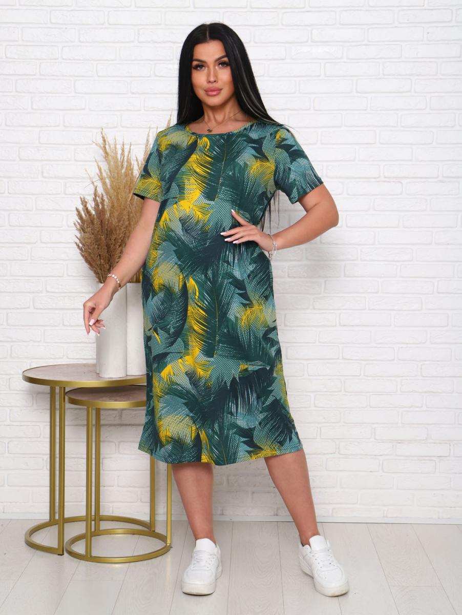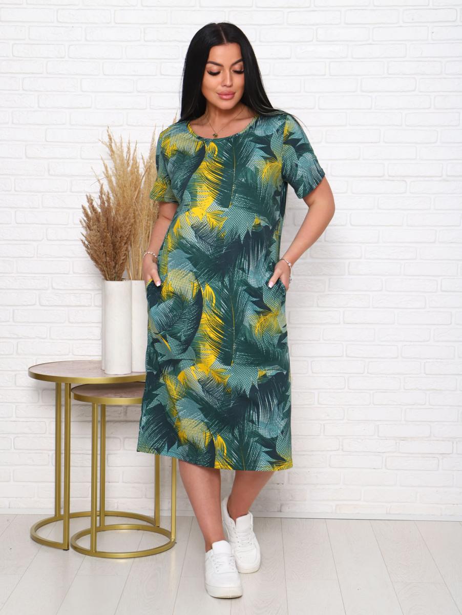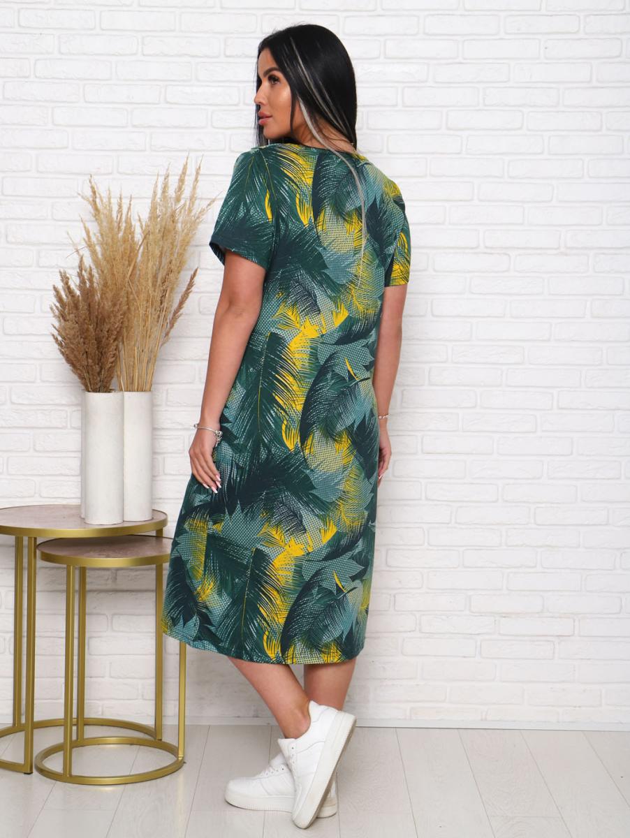 Платье из кулирки набивной реактив выполнено в стильном хаки цвете, что делает его универсальным элементом гардероба. Элегантный дизайн с вточным рукавом и декоративной планкой с пуговицами придает образу особую изысканность. Удобные карманы в боковых швах добавляют функциональности, позволяя вам хранить мелочи под рукой.