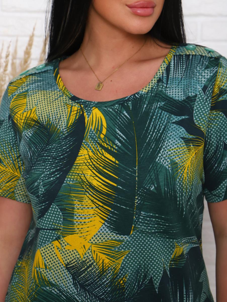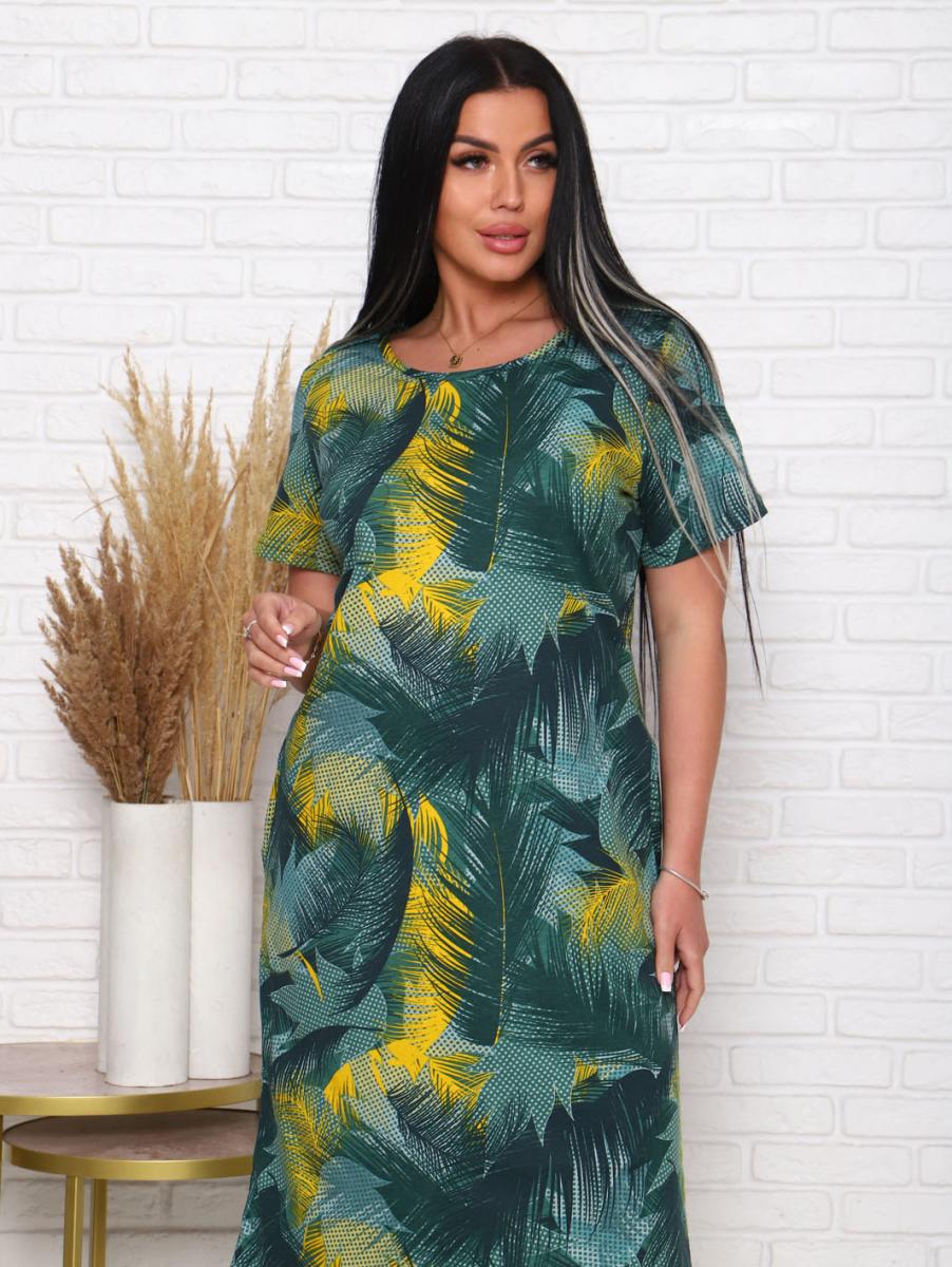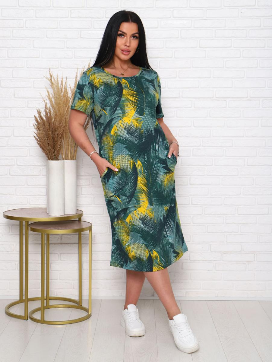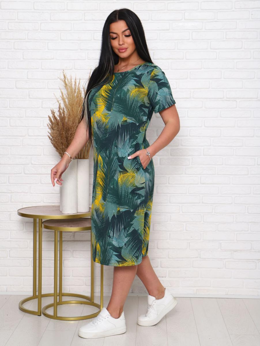 Платье из кулирки набивной реактив выполнено в стильном хаки цвете, что делает его универсальным элементом гардероба. Элегантный дизайн с вточным рукавом и декоративной планкой с пуговицами придает образу особую изысканность. Удобные карманы в боковых швах добавляют функциональности, позволяя вам хранить мелочи под рукой.