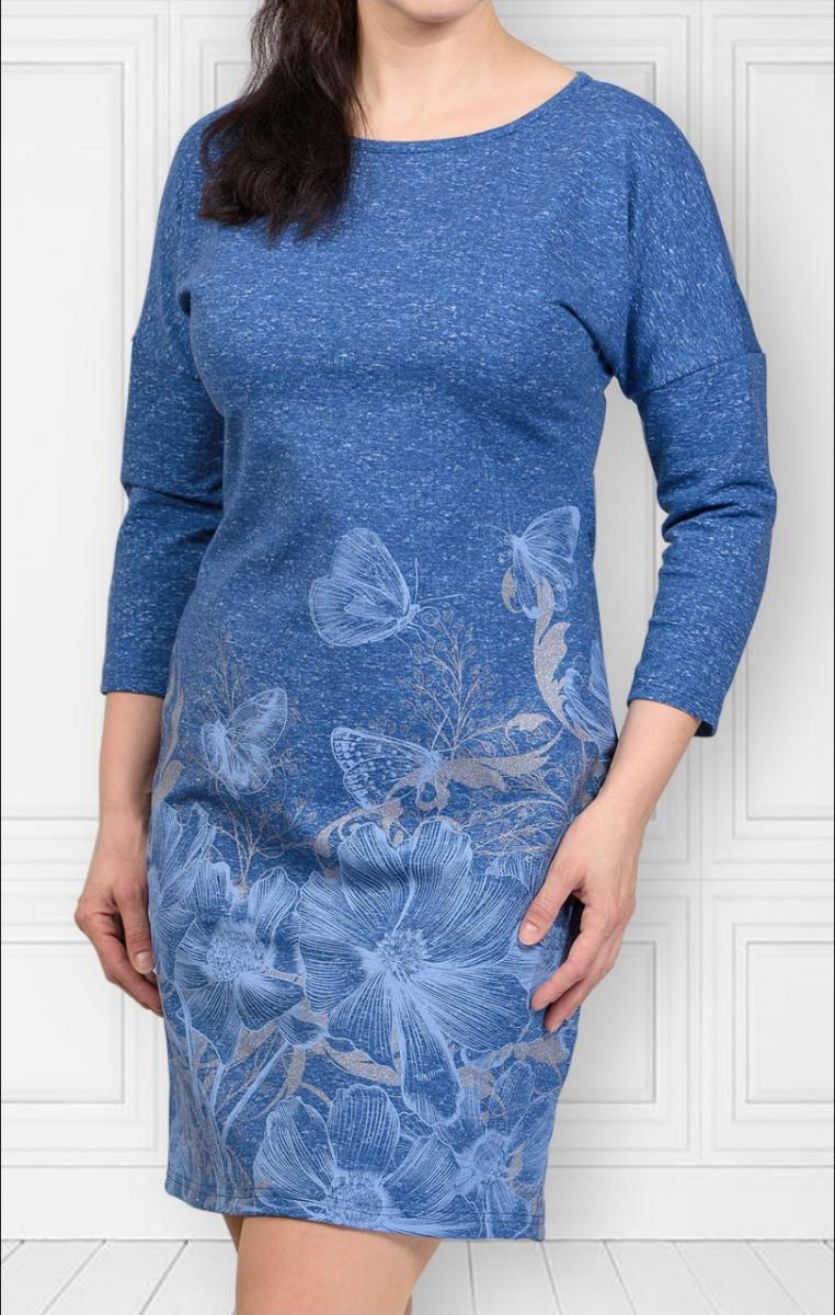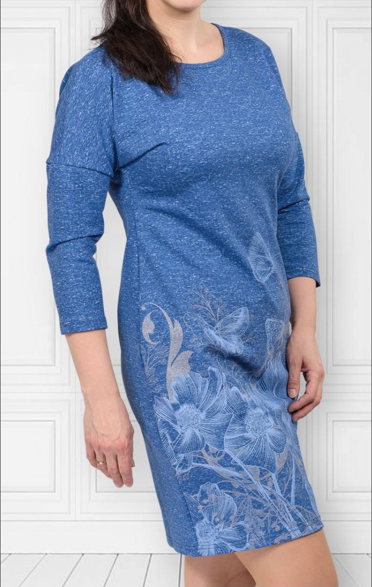 Платье футер с лайкрой «Берёзка - индиго» — идеальный выбор для стильных и уверенных в себе женщин. Это платье с уникальным принтом на полочке и спущенным плечом сочетает в себе удобство и изящество.