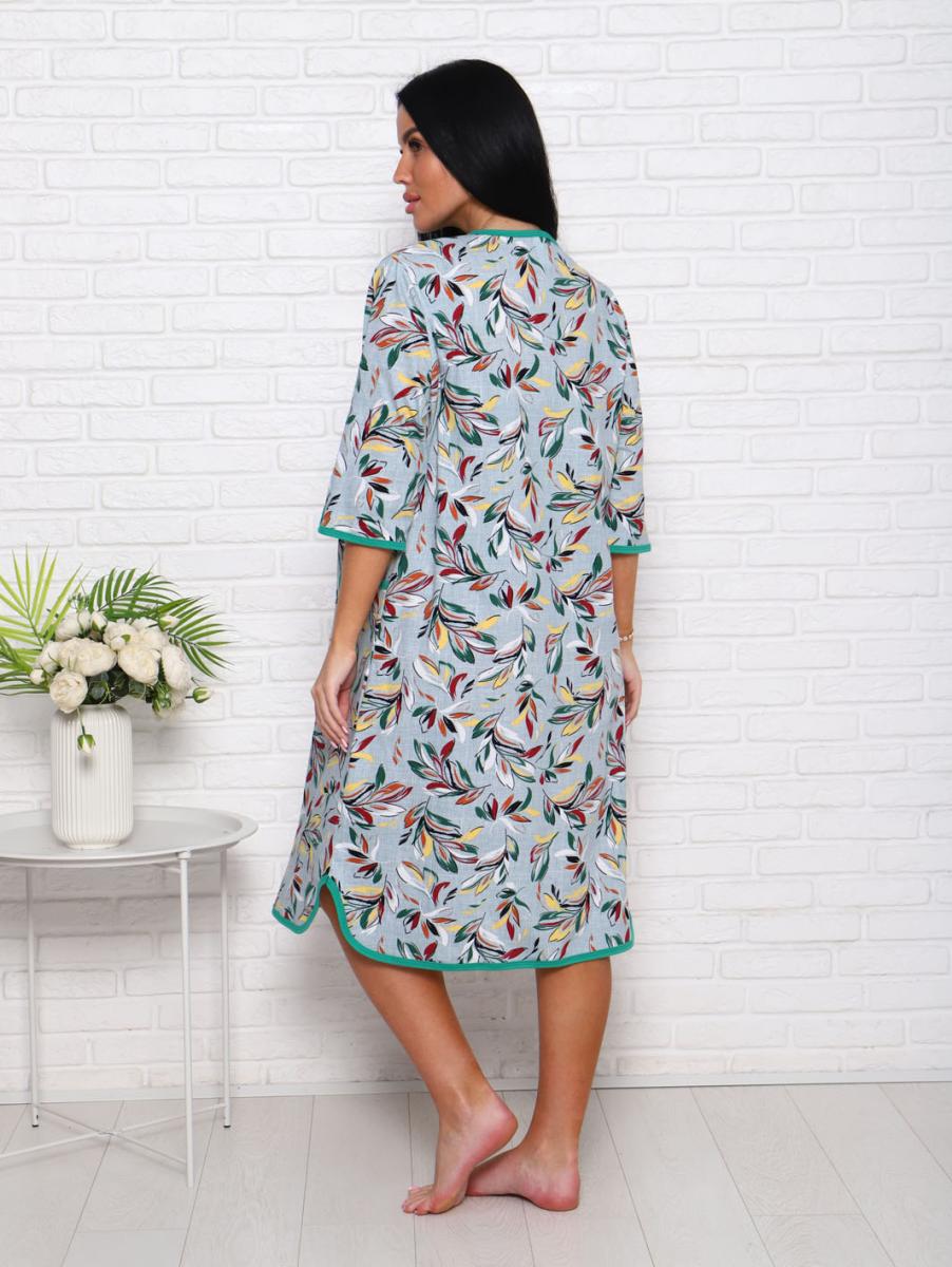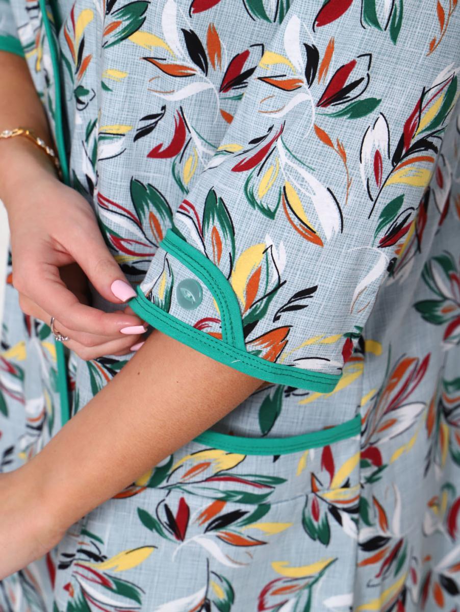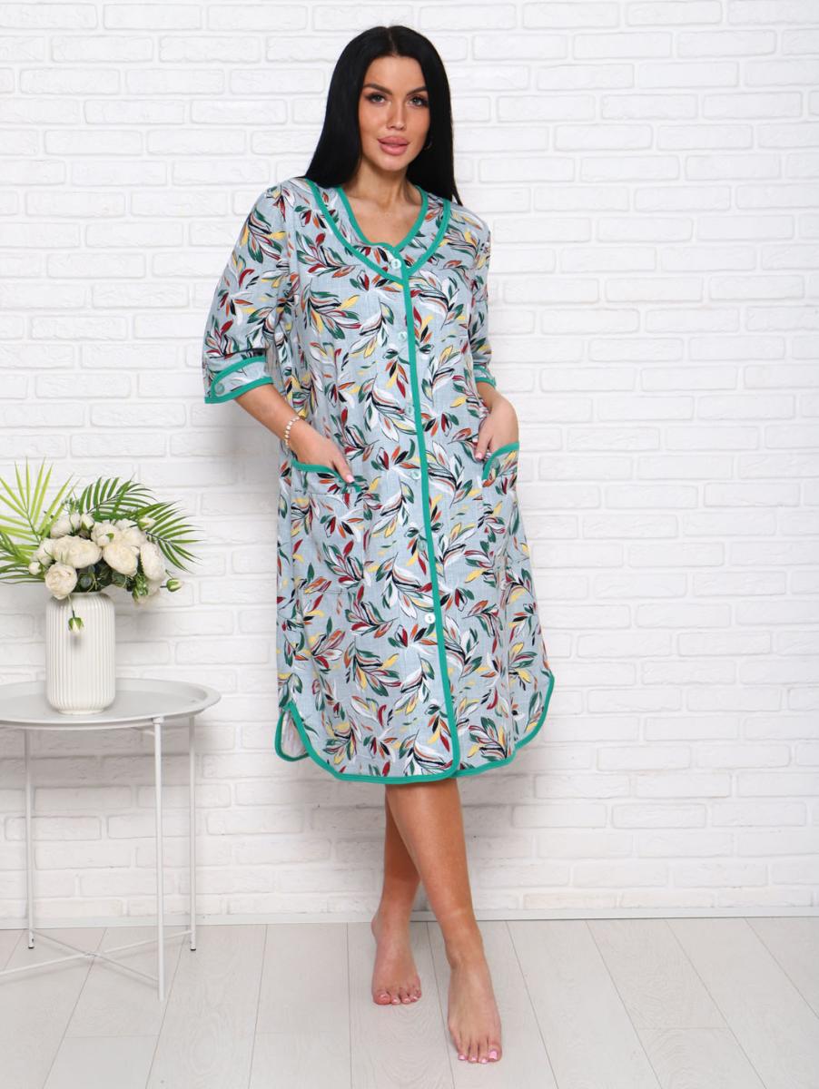Этот стильный женский халат станет незаменимым элементом вашего гардероба. Изготовленный из 100% хлопка (кулирка), он обеспечивает удивительный комфорт и легкость в носке. Благодаря V-образному вырезу и рукавам 3/4, халат идеально подходит для любого времени года. Накладные карманы добавляют практичности, а окантовка однотонной тканью придает изделию изысканный вид.