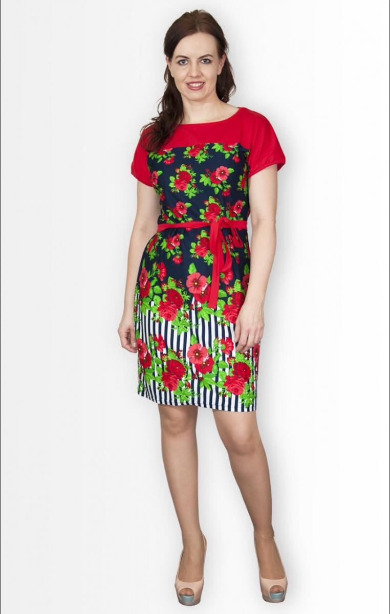 Платье трикотажное с поясом (210-1) — это идеальный выбор для создания стильного и комфортного образа. Изготовлено из высококачественной кулирки, оно обеспечивает отличную воздухопроницаемость и приятные ощущения на коже благодаря 100% хлопковому составу. Дизайн платья включает однотонные кокетки спереди и сзади, что добавляет элегантности и утонченности. Яркая расцветка с цветочным принтом и полосками создает игривый и свежий вид, а аккуратный пояс подчеркивает талию, делая силуэт более женственным. Преимущества платья: