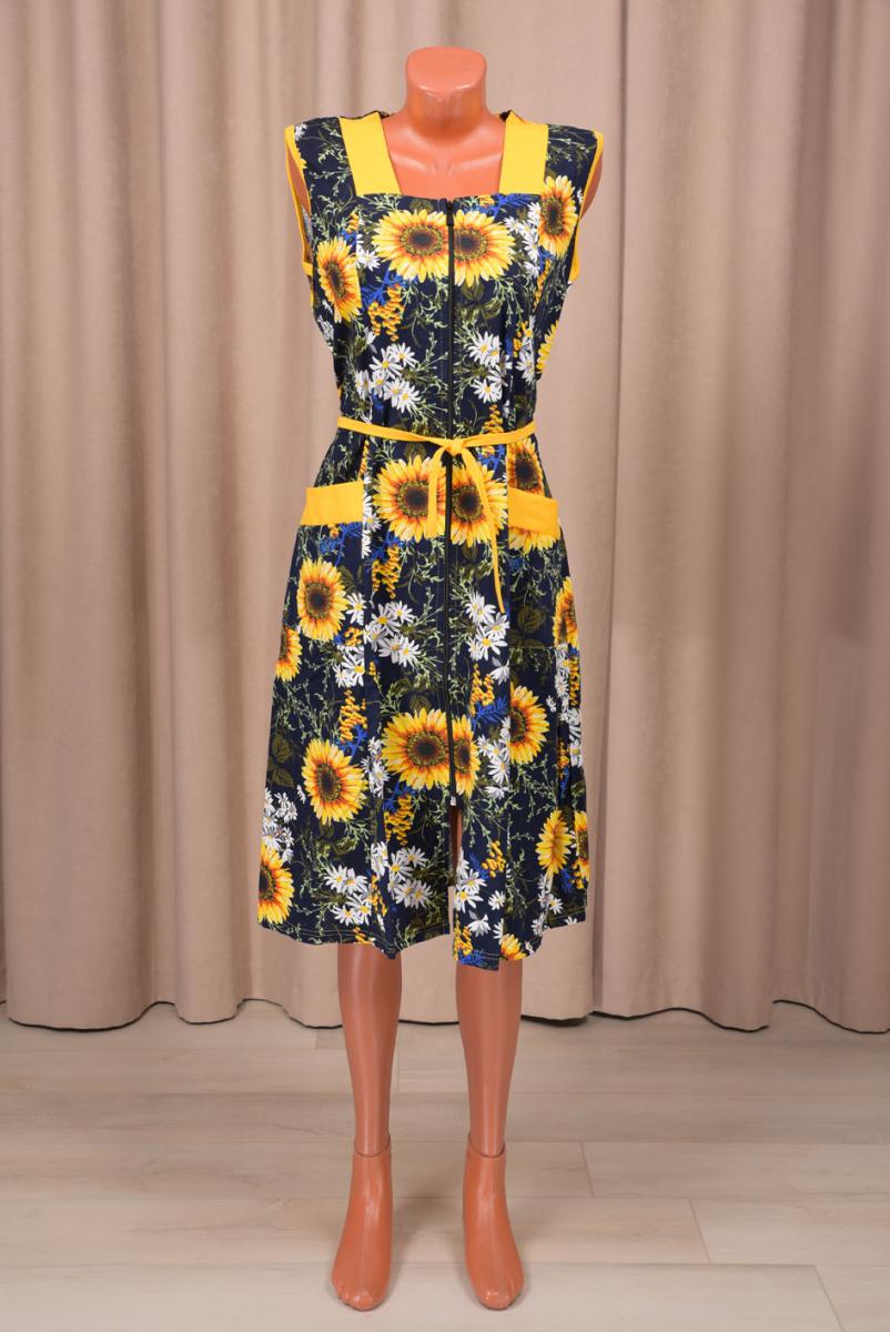 Сарафан на молнии с карманами выполнен из легкой и приятной к телу ткани — 100% хлопка. Этот стильный женский сарафан в ярком дизайне с солнечными цветами станет идеальным выбором для теплых дней.