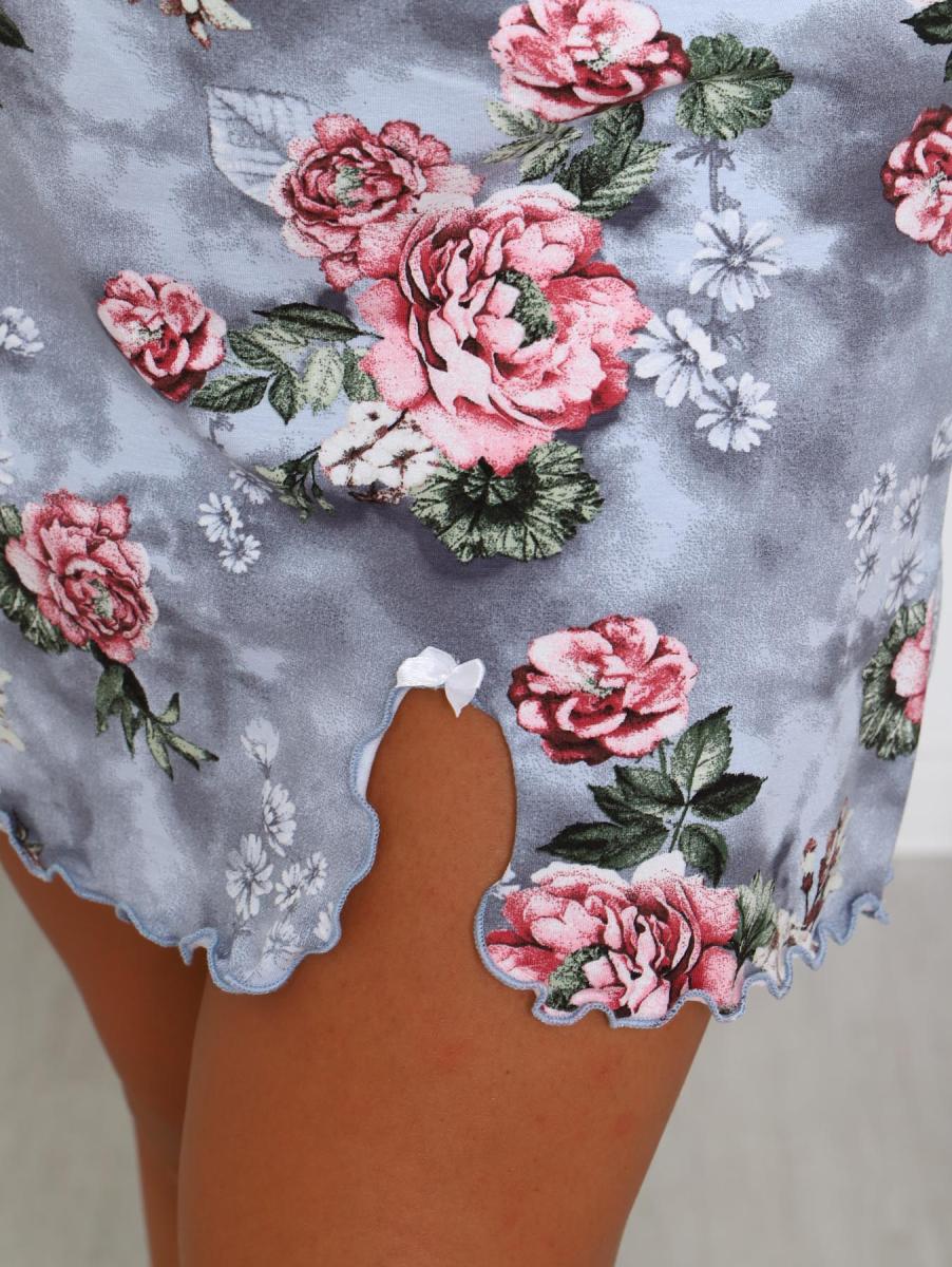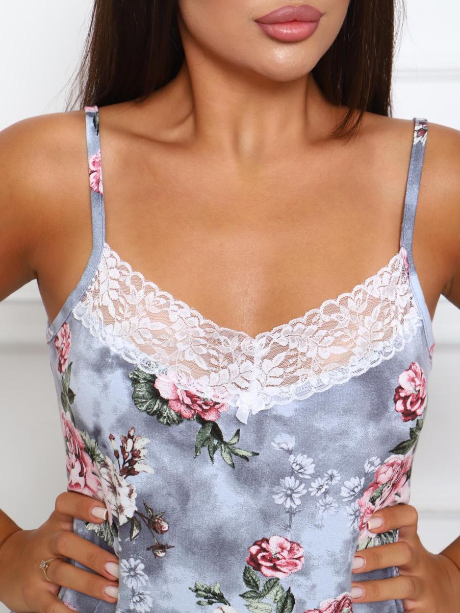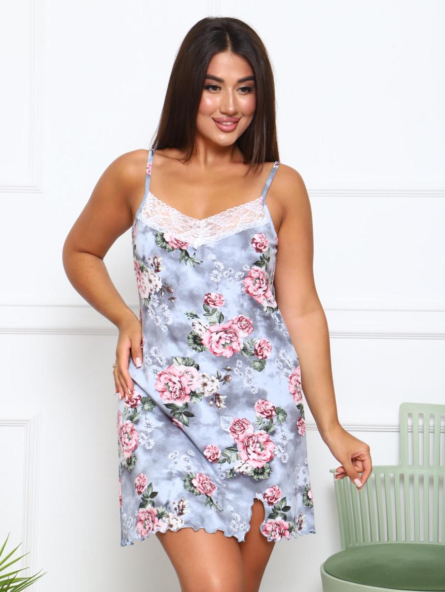 Сорочка на бретелях из вискозы набивной. По груди пришито кружево. Снизу небольшой разрез обработан краевой спец. машиной.