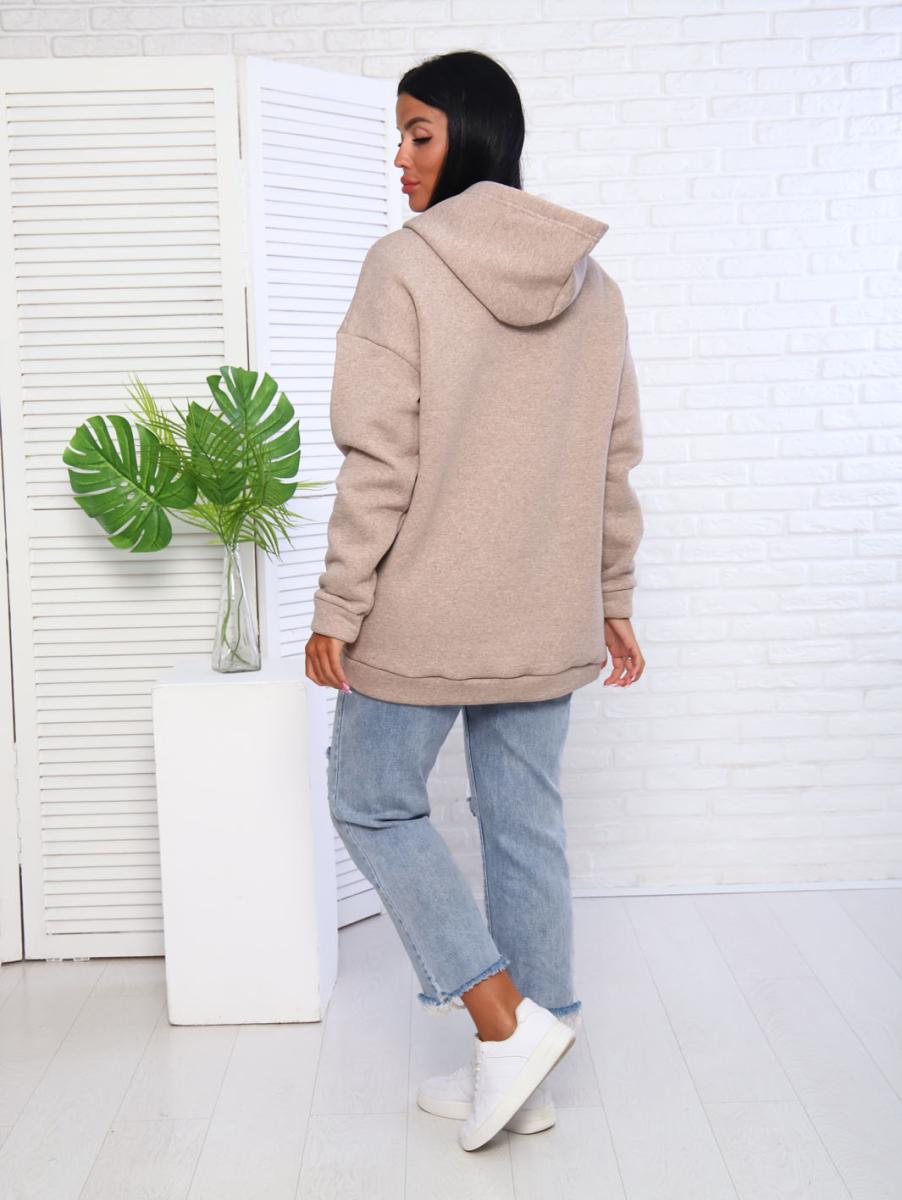 Эта стильная толстовка с капюшоном из мягкого футера с начесом станет идеальным дополнением вашего гардероба. Бежевый оттенок придаст вашему образу элегантность и уют, а спущенные рукава и манжеты на рукавах обеспечат комфорт в носке. По низу пришит пояс, который подчеркивает силуэт и добавляет оригинальности.