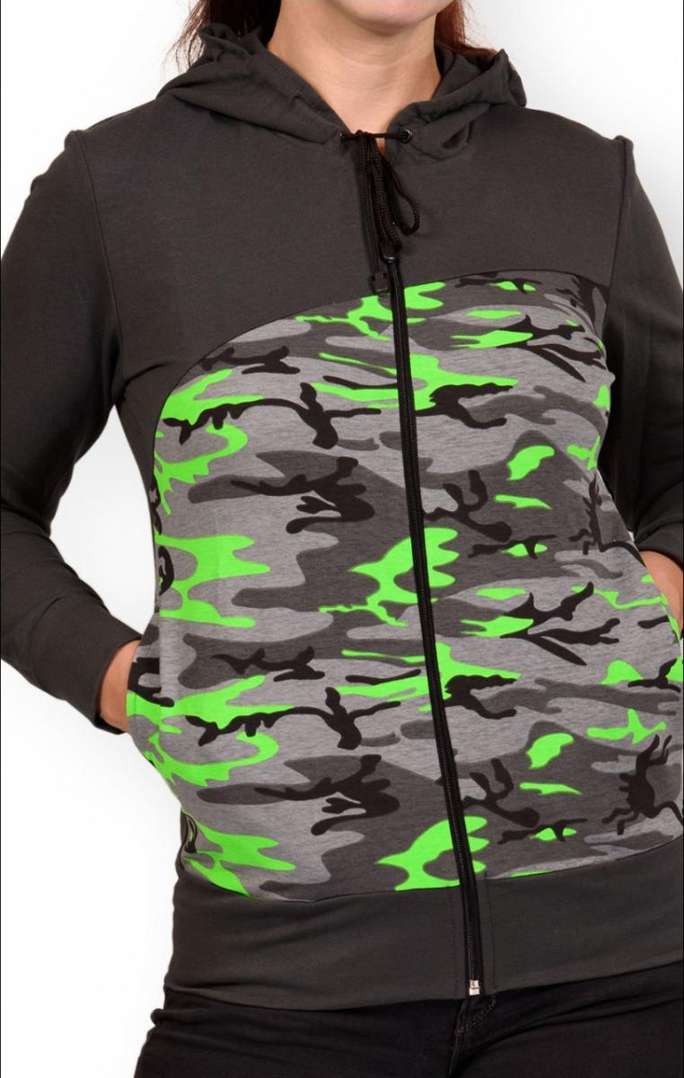 Капюшон со шнуровкой добавляет функциональность и защиту от ветра, а уникальный дизайн с ярким салатовым камуфляжем на передней части привлекает внимание и выделяет вас из толпы. Спинка целиковая из однотонной ткани создает эффектный контраст и подчеркивает стильный силуэт.