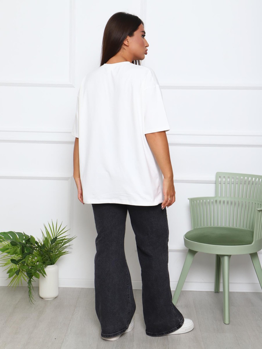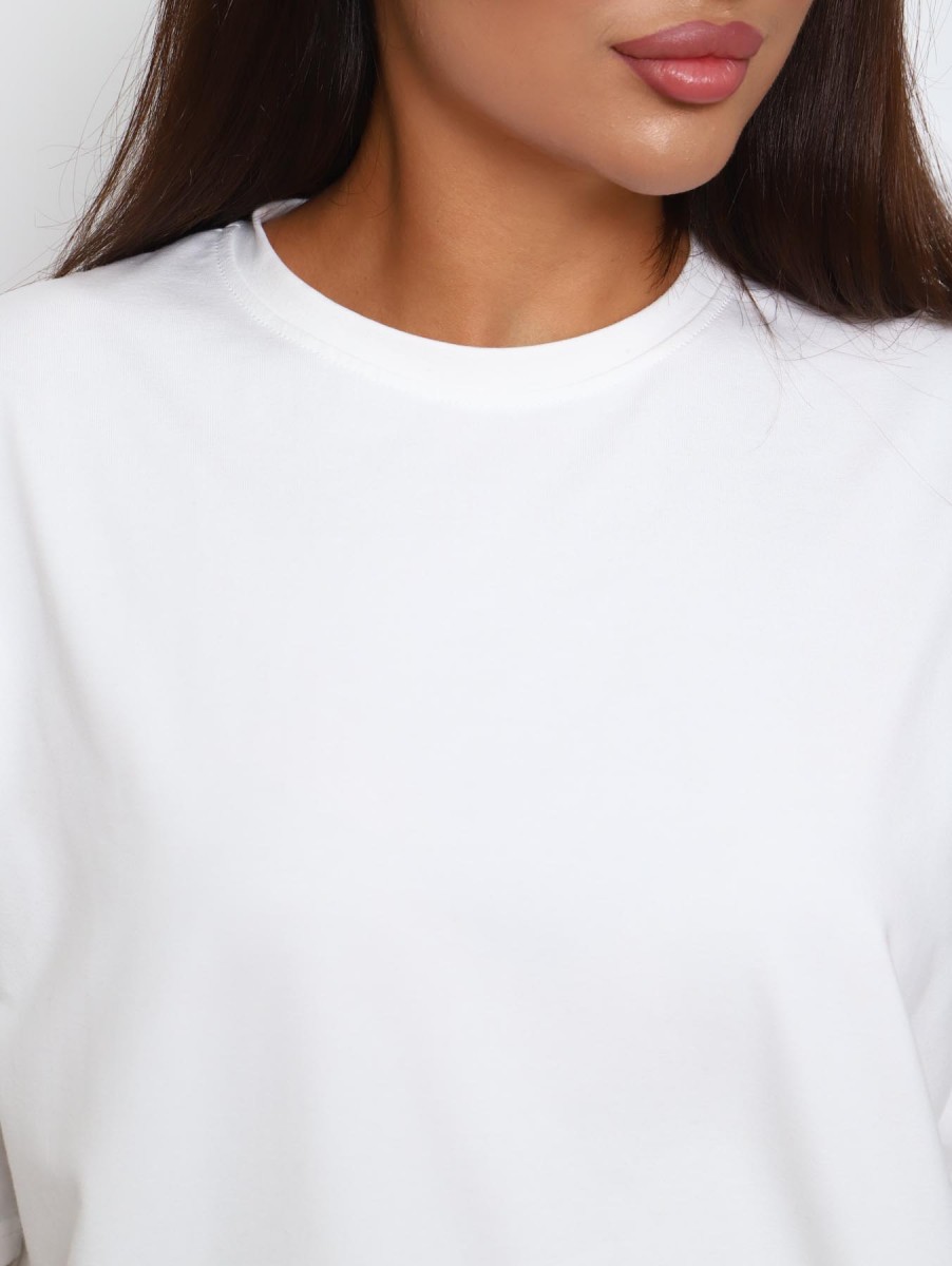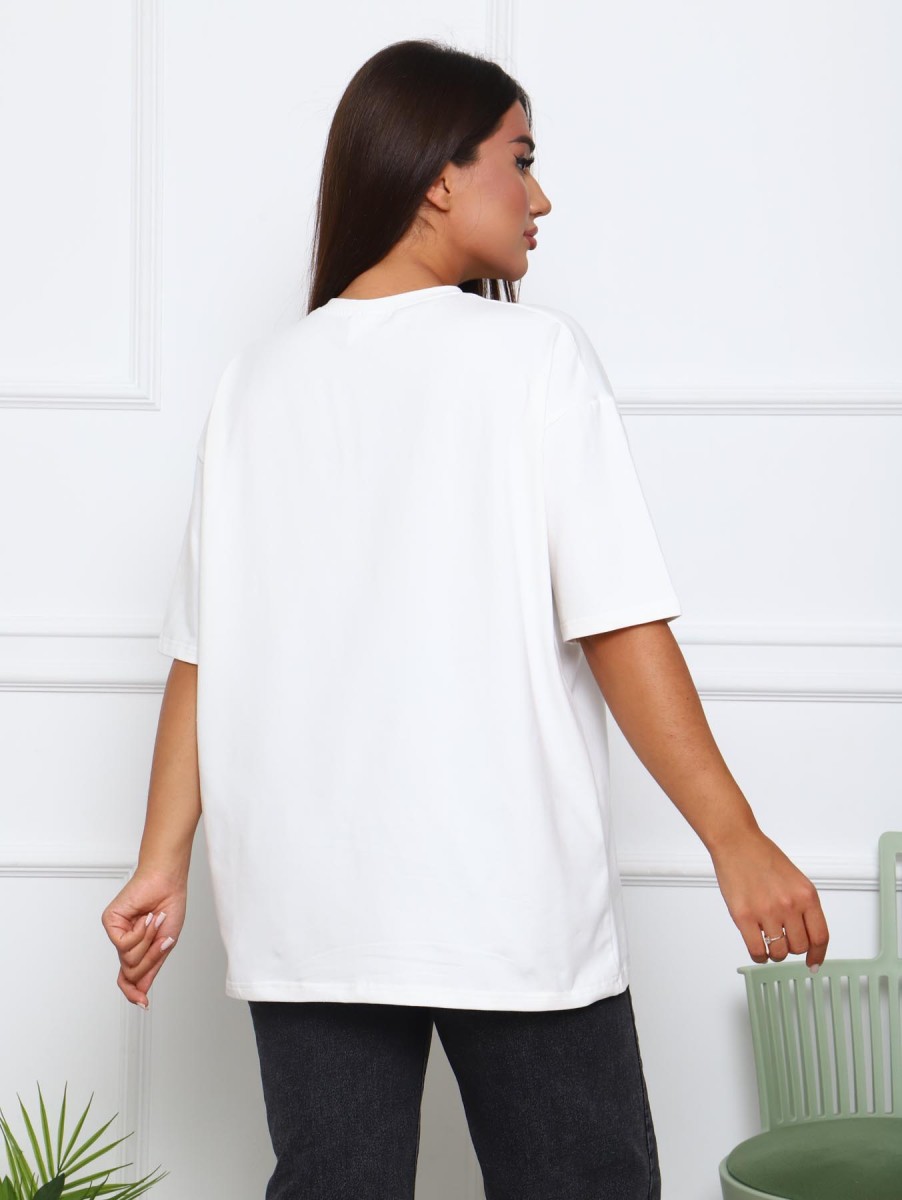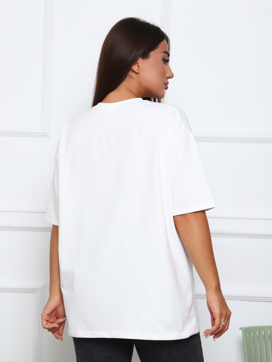 Эта женская футболка оверсайз в белом цвете станет идеальным дополнением вашего гардероба. Изготовленная из кулирки с лайкрой, она обеспечивает максимальный комфорт и свободу движений. Спущенные плечи придают модели расслабленный и стильный вид, что делает ее универсальным выбором для любого случая.