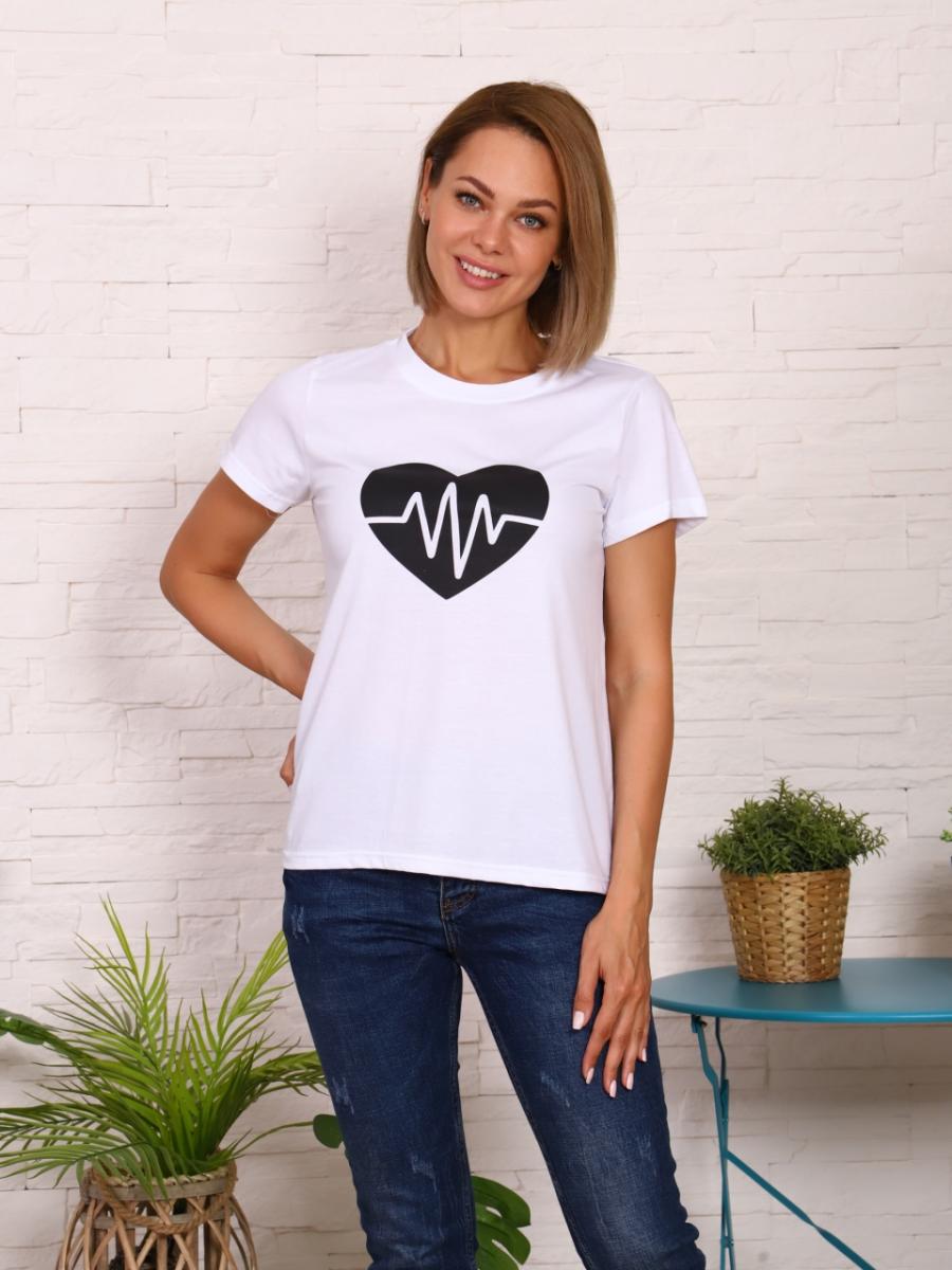 Эта женская футболка с принтом станет отличным дополнением вашего гардероба! Выполненная из однотонной кулирки, она обеспечивает комфорт и свободу движений. Принт в виде сердца с графическим элементом добавляет стиль и оригинальность, а горловина, обработанная обтачкой, придает аккуратный и завершенный вид.