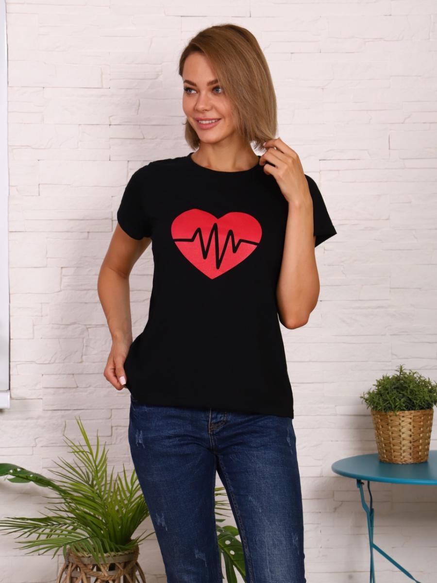 Эта стильная женская футболка станет отличным дополнением вашего гардероба. Изготовленная из однотонной кулирки с 100% хлопковым составом, она обеспечит максимальный комфорт в течение всего дня. Принт в виде сердца с пульсом добавляет оригинальности и подчеркивает вашу индивидуальность. Горловина обработана обтачкой, что обеспечивает аккуратный и завершенный вид. Преимущества этой футболки: