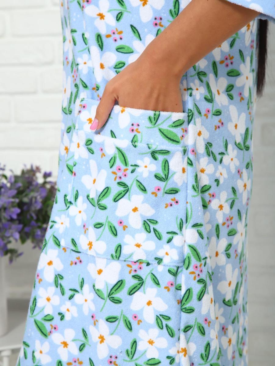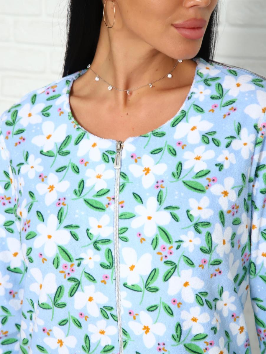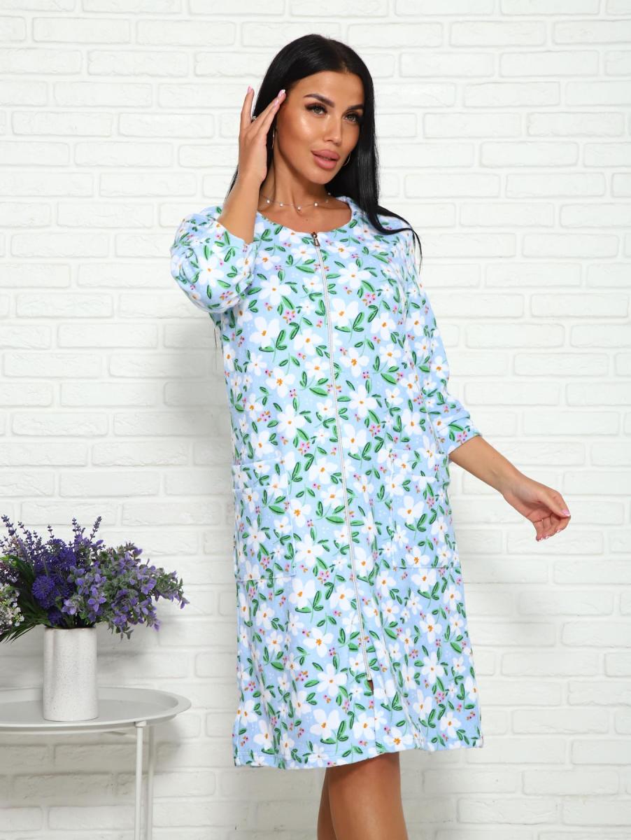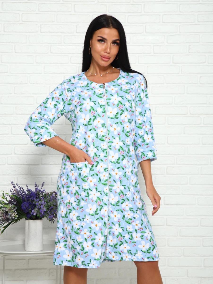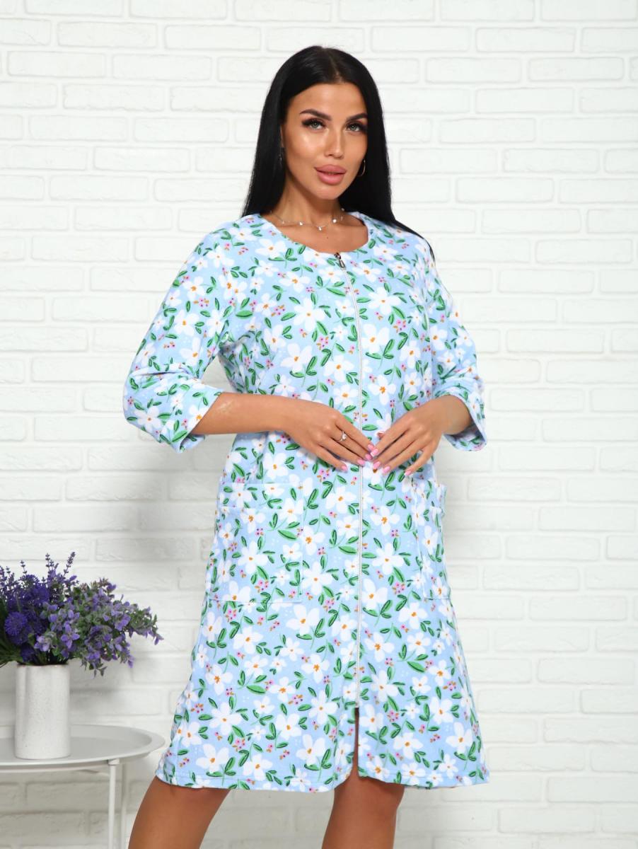 Халат выполнен из набивной махры с петельчатой структурой, что делает его мягким и приятным на ощупь. Удобные накладные карманы на молнии добавляют практичности, а рукава 3/4 с манжетами придают изделию элегантный вид.