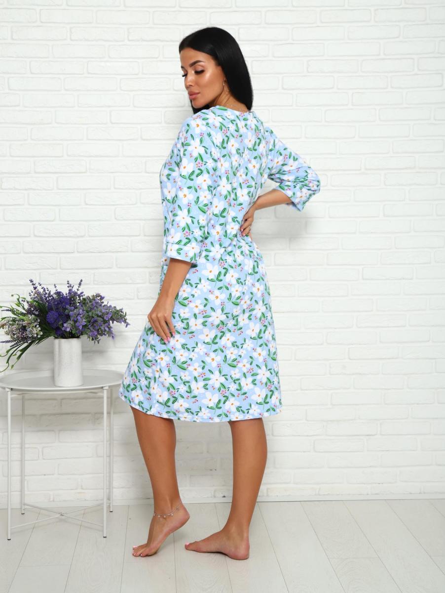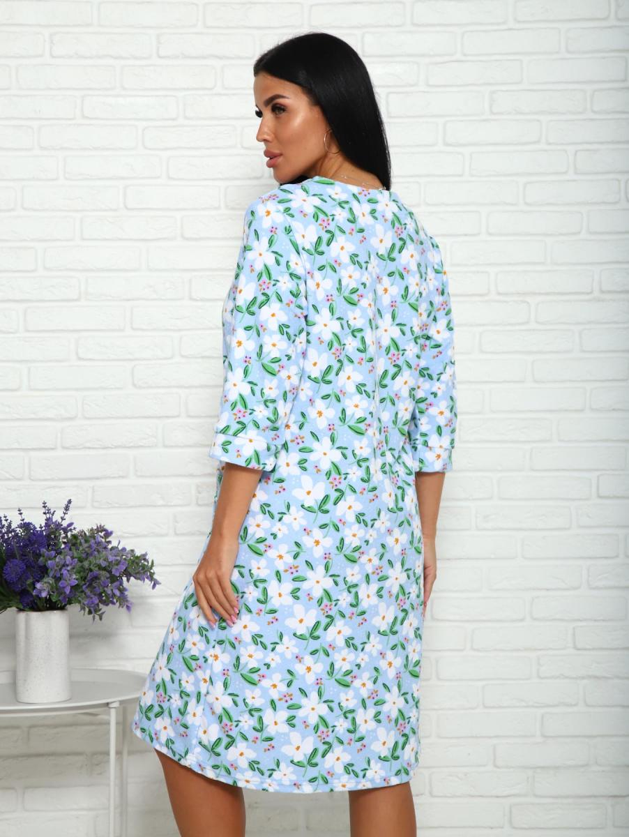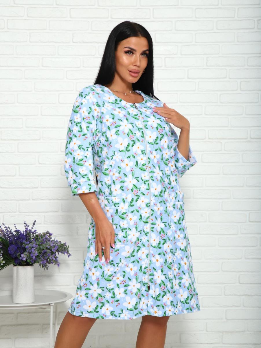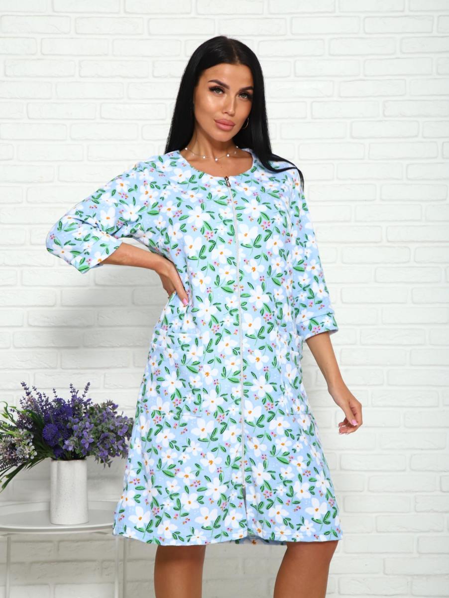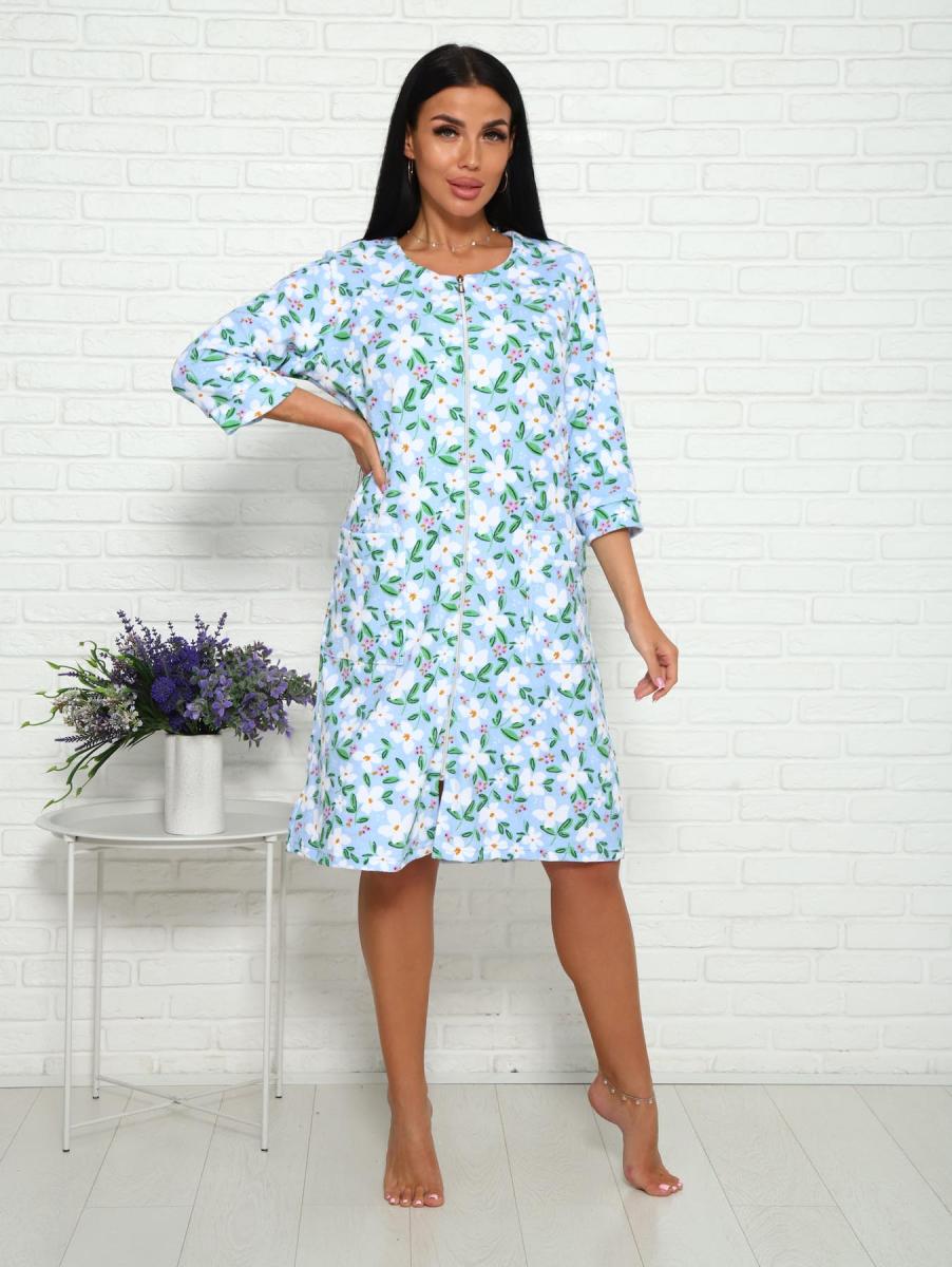 Халат выполнен из набивной махры с петельчатой структурой, что делает его мягким и приятным на ощупь. Удобные накладные карманы на молнии добавляют практичности, а рукава 3/4 с манжетами придают изделию элегантный вид.