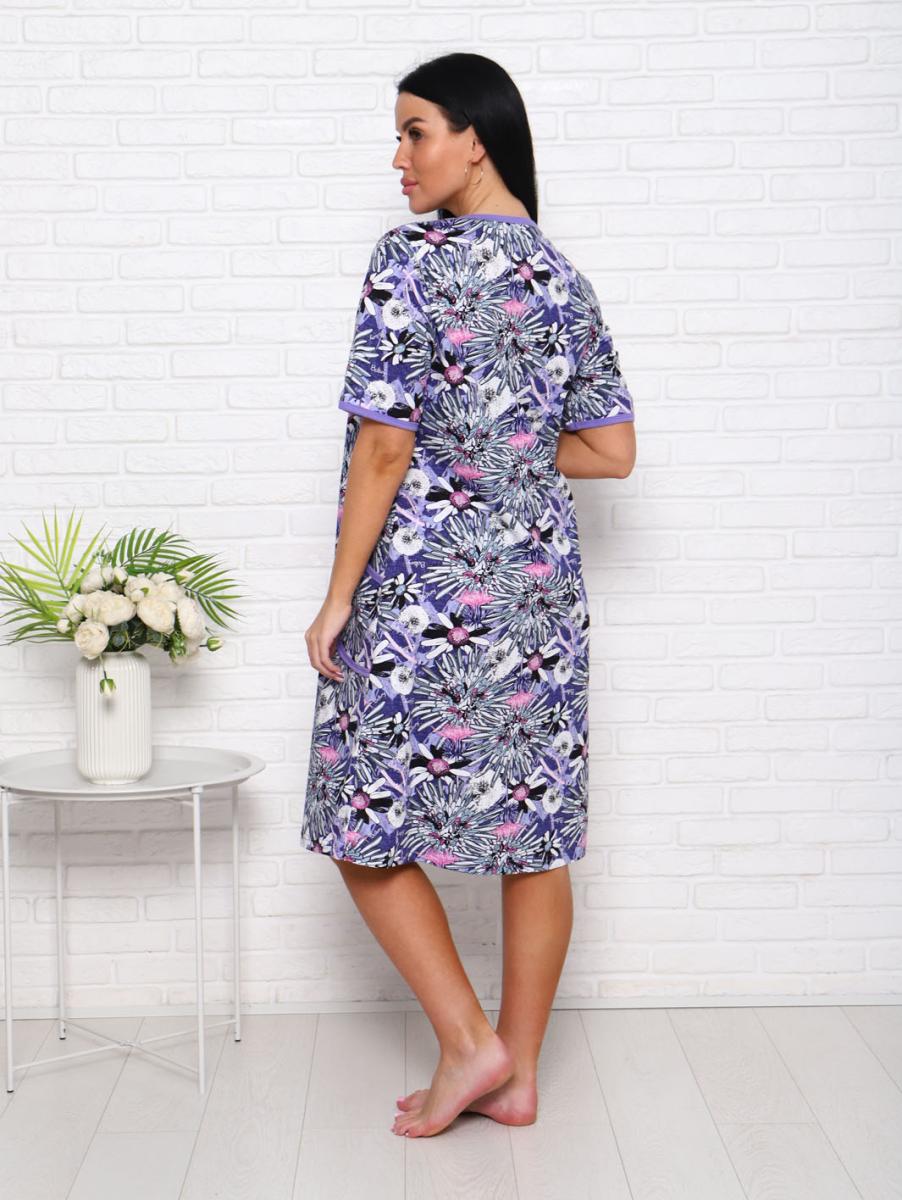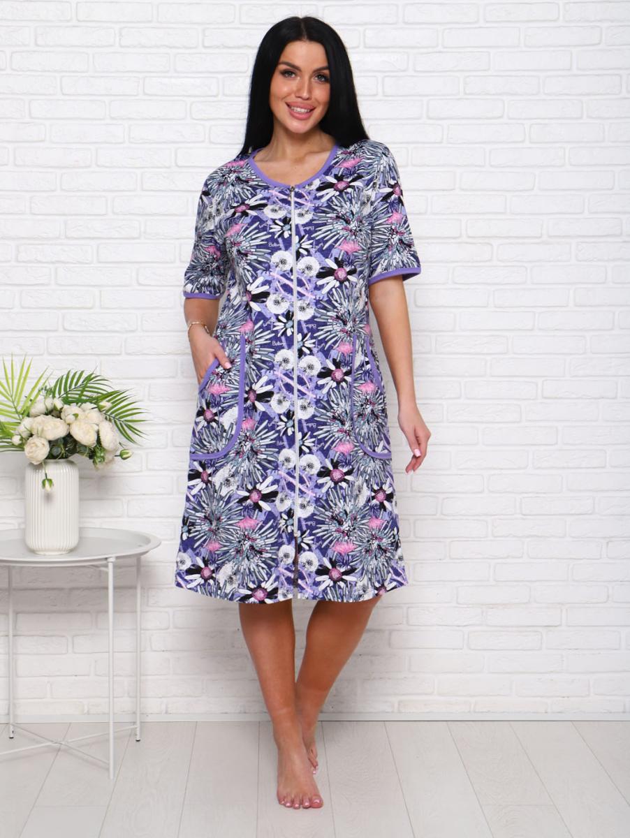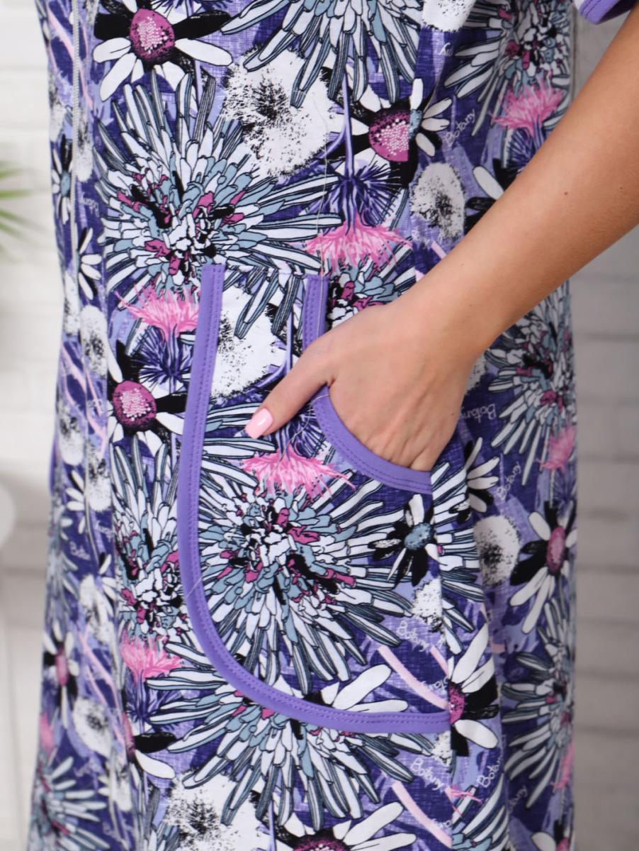 Этот женский халат станет незаменимым аксессуаром для вашего домашнего комфорта. Изготовленный из 100% хлопка, он обеспечивает приятные тактильные ощущения и отличную воздухопроницаемость. Модель выполнена в элегантном лиловом цвете с изысканным растительным принтом, что придаёт ей особый шарм.