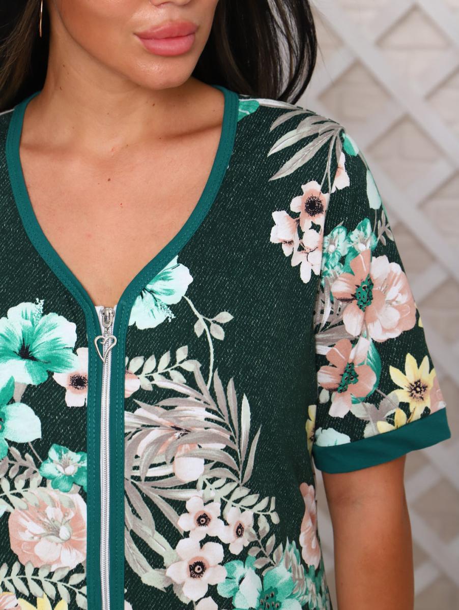 Модель представлена в красивом зеленом цвете с изысканным цветочным принтом, что добавляет свежести и яркости вашему образу. Халат на молнии удобен в носке и имеет накладные карманы, которые позволят вам всегда держать под рукой необходимые мелочи.