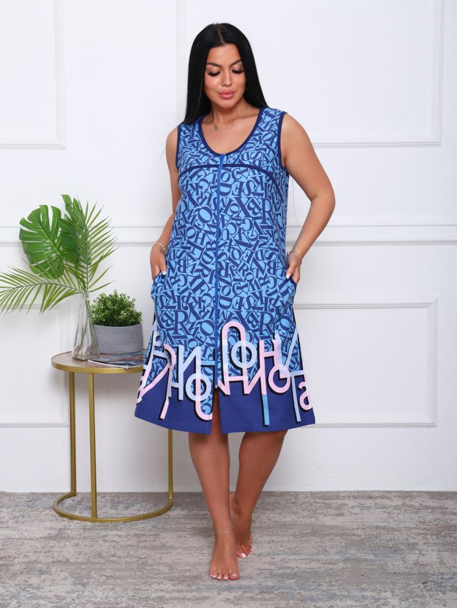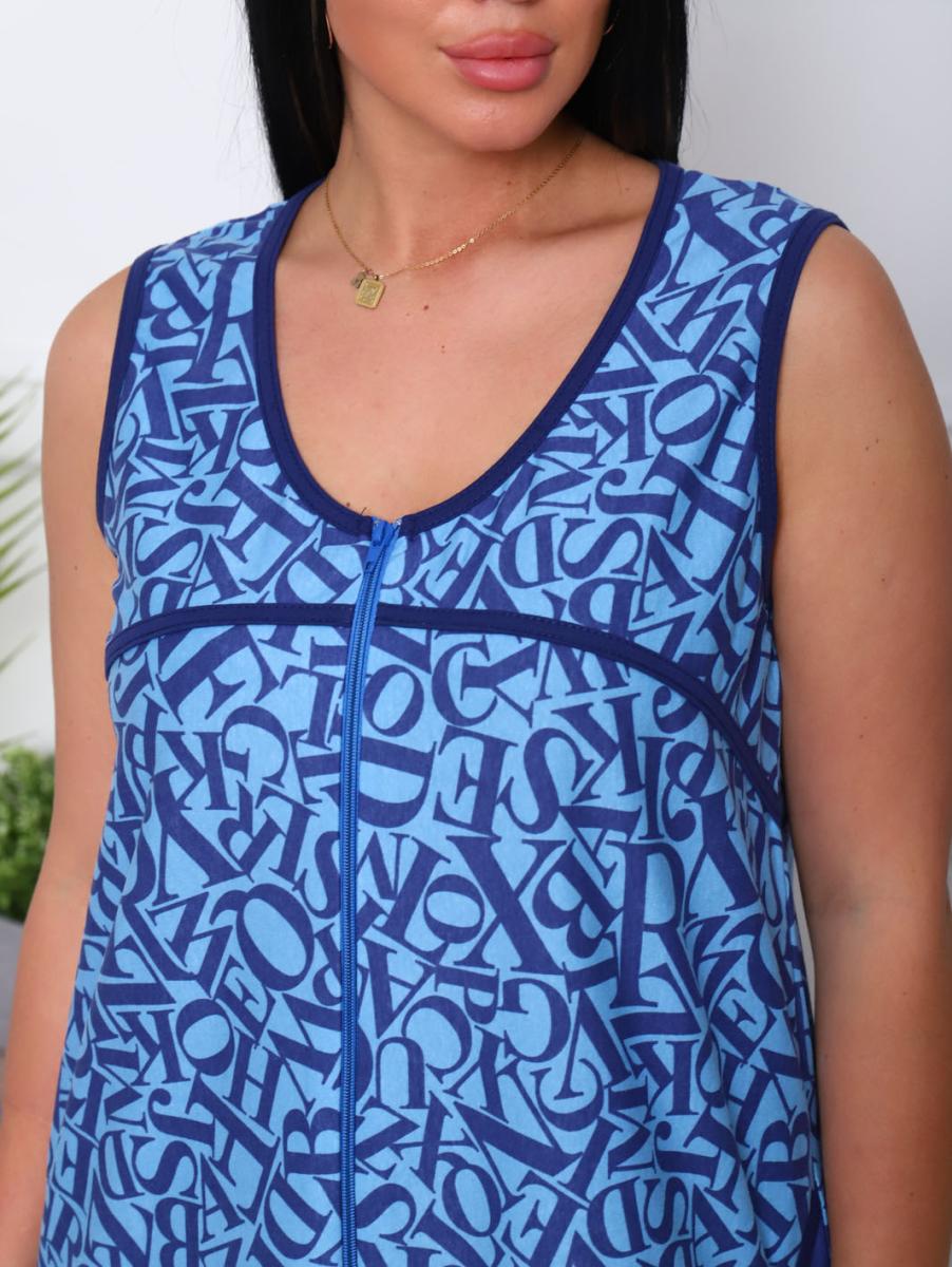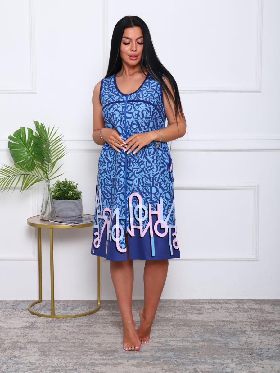Дизайн халата представлен в нежном голубом цвете с оригинальным купоном, который добавляет выразительности и стиля. Безрукавная модель с отрезной кокеткой и карманами в швах обеспечивает свободу движений и возможность удобно хранить мелочи.